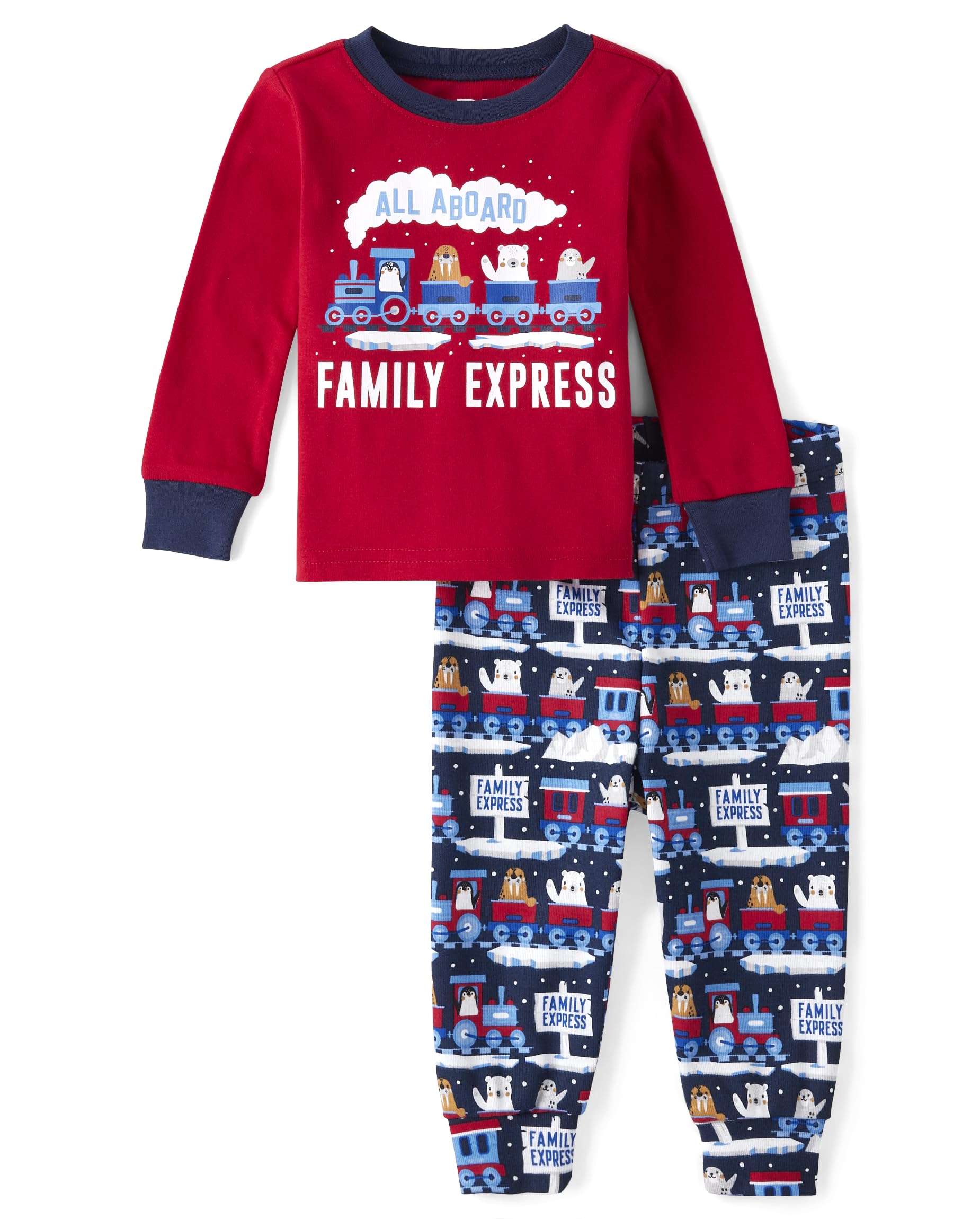 FEATURES: Pull-on elasticized waistband, banded cuffs, glow-in-the-dark holiday train print; for best glow effect expose to light before wearing