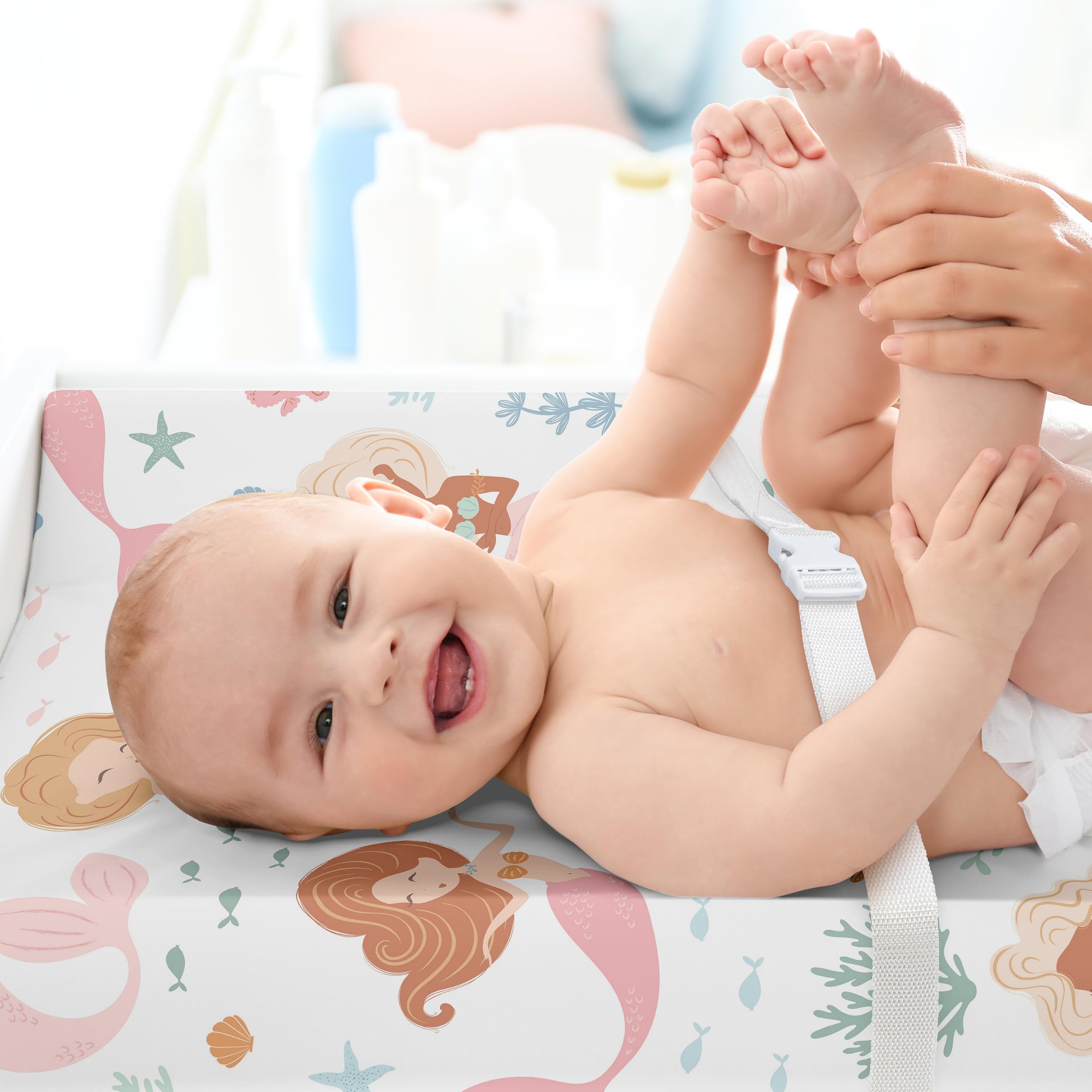 Add a baby change mat cover sheet to your list of must haves for your new little one! This soft pad cover is stretchy and comfortable to fit most changing table pads perfectly while also providing a stand out nursery decor accessory to complete the look of your baby room. Add flare to baby outfit changes and diaper changing time with a baby changing pad cover that fits most standard and contoured changing pads with a fully elastic band all the way around the edges for a secure fit.