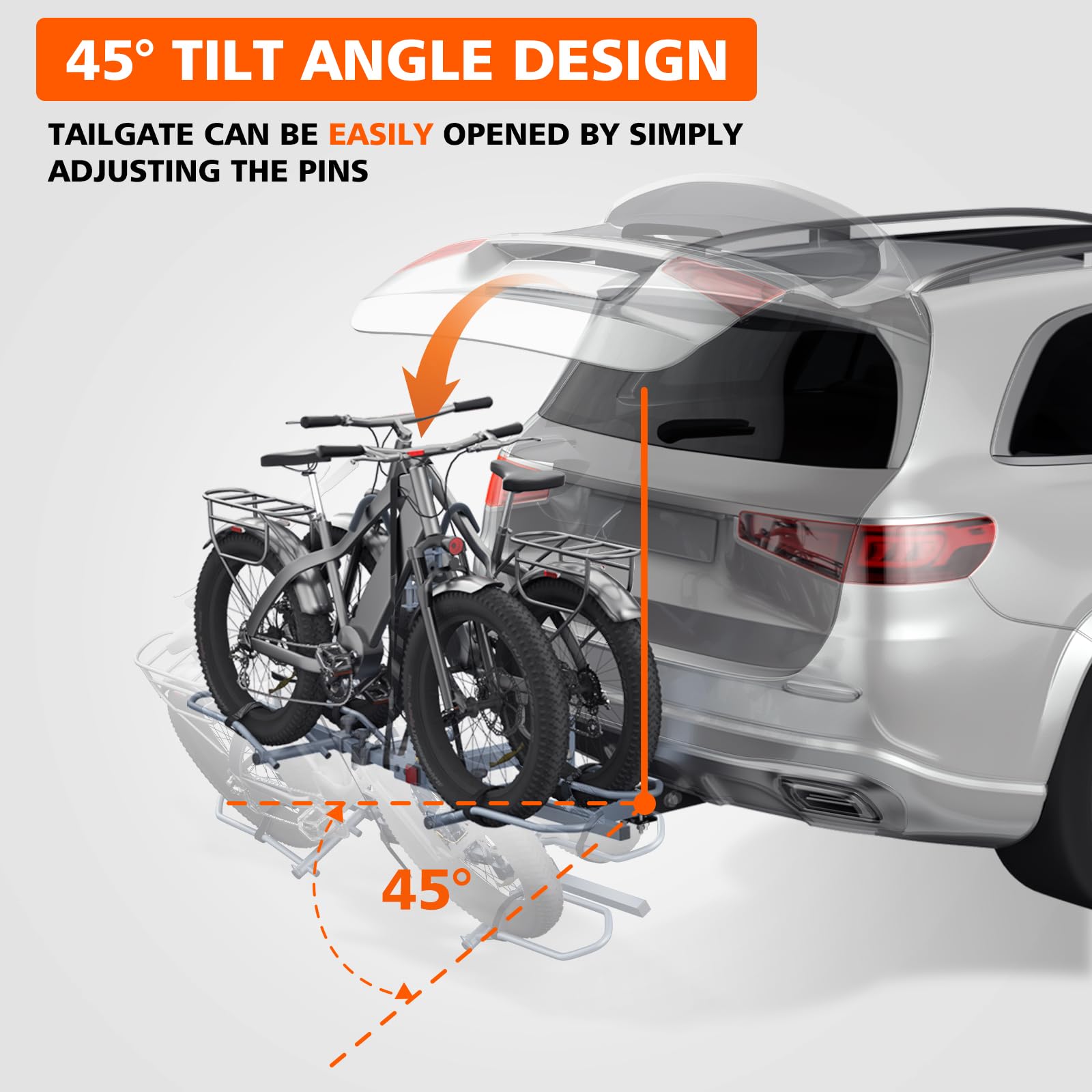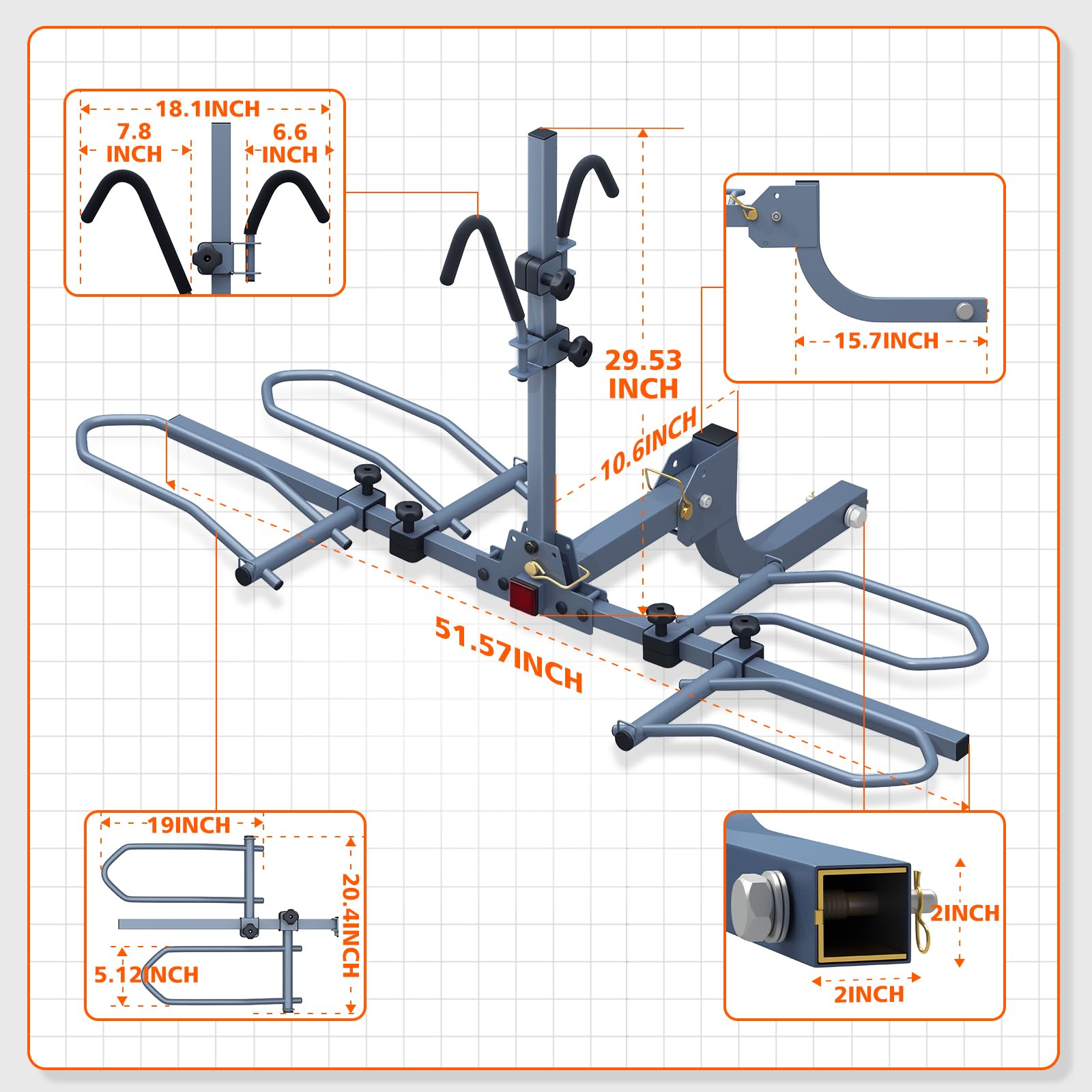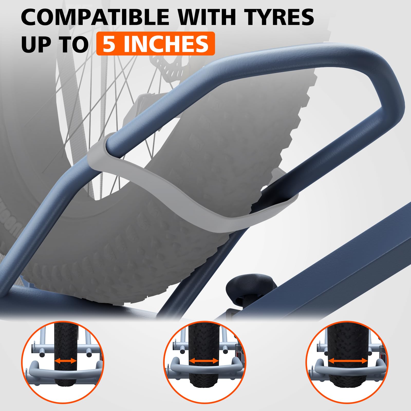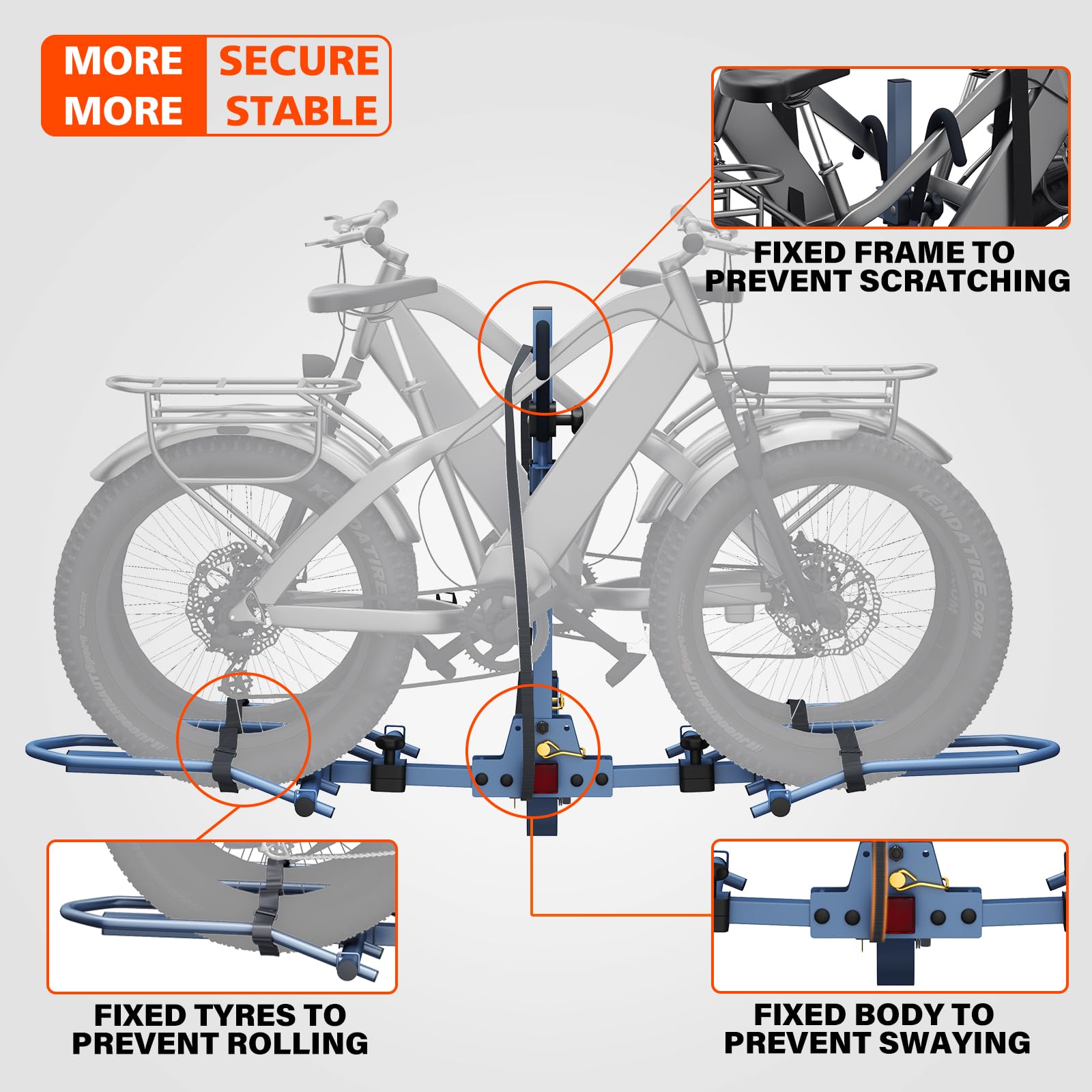 180LBS LOAD CAPACITY: The bike hitch rack is made of high-strength and high-hardness alloy steel. The weight capacity is up to 180LBS, maximum 90LBS per bike. Suitable for a variety of bike models, including mountain bikes/fat tyre bikes/electric bikes/normal bikes, so that you can easily start your cycling journey