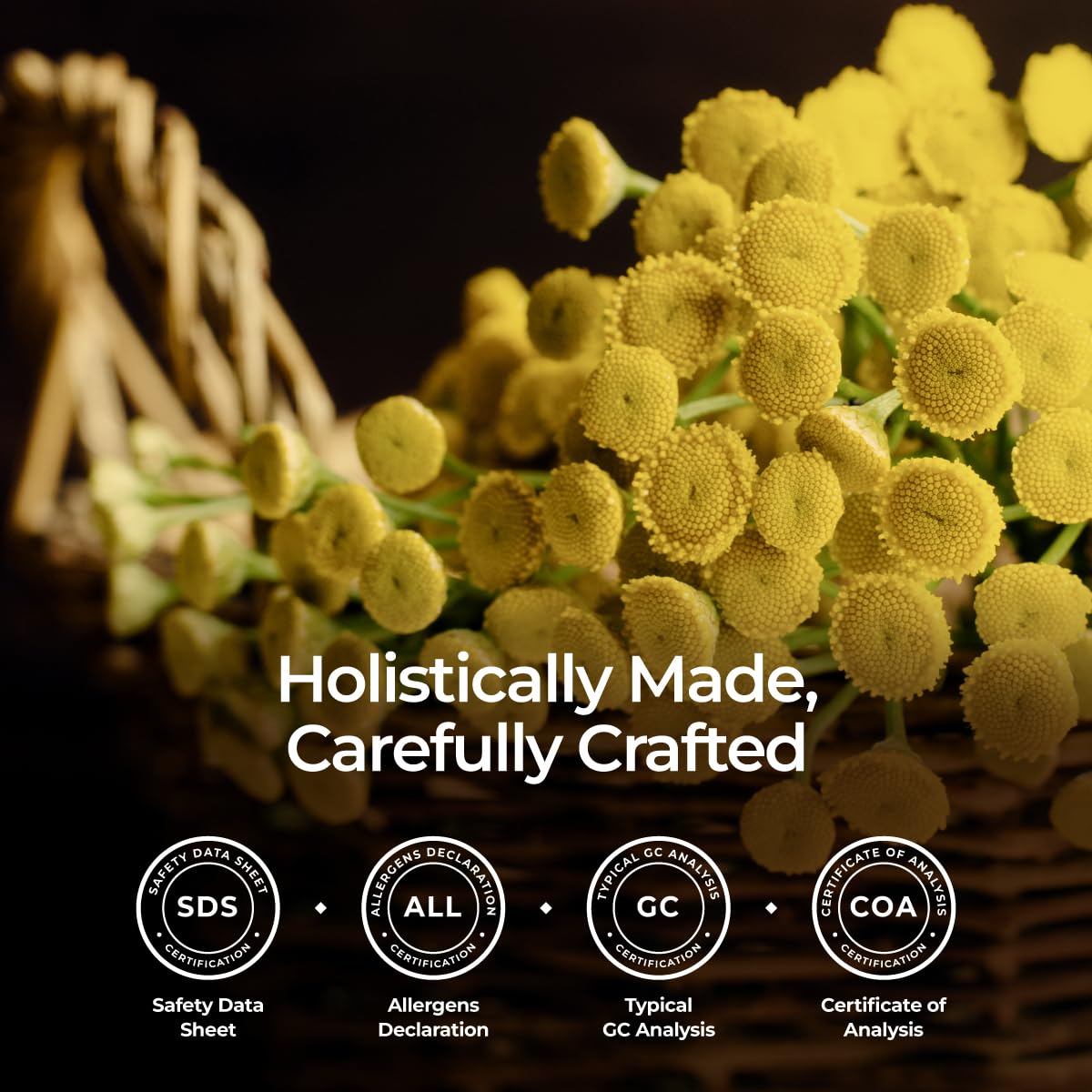 A floral candle making scent for a calm ambiance. Our organic blue tansy oil for aromatherapy features a sweet & soothing scent, ideal for a tranquil space. Add 4-5 drops of blue tansy essential oil to your diffuser and enjoy its floral aroma.