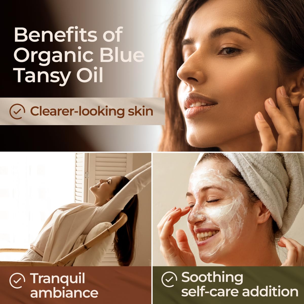 Moisturizing and soothing on skin. Our organic blue tansy essential oil moisturizes and balances dry-looking skin, and may help with skin protection. Using 1-2 drops of blue tansy face oil day and night may promote a softer-looking complexion.