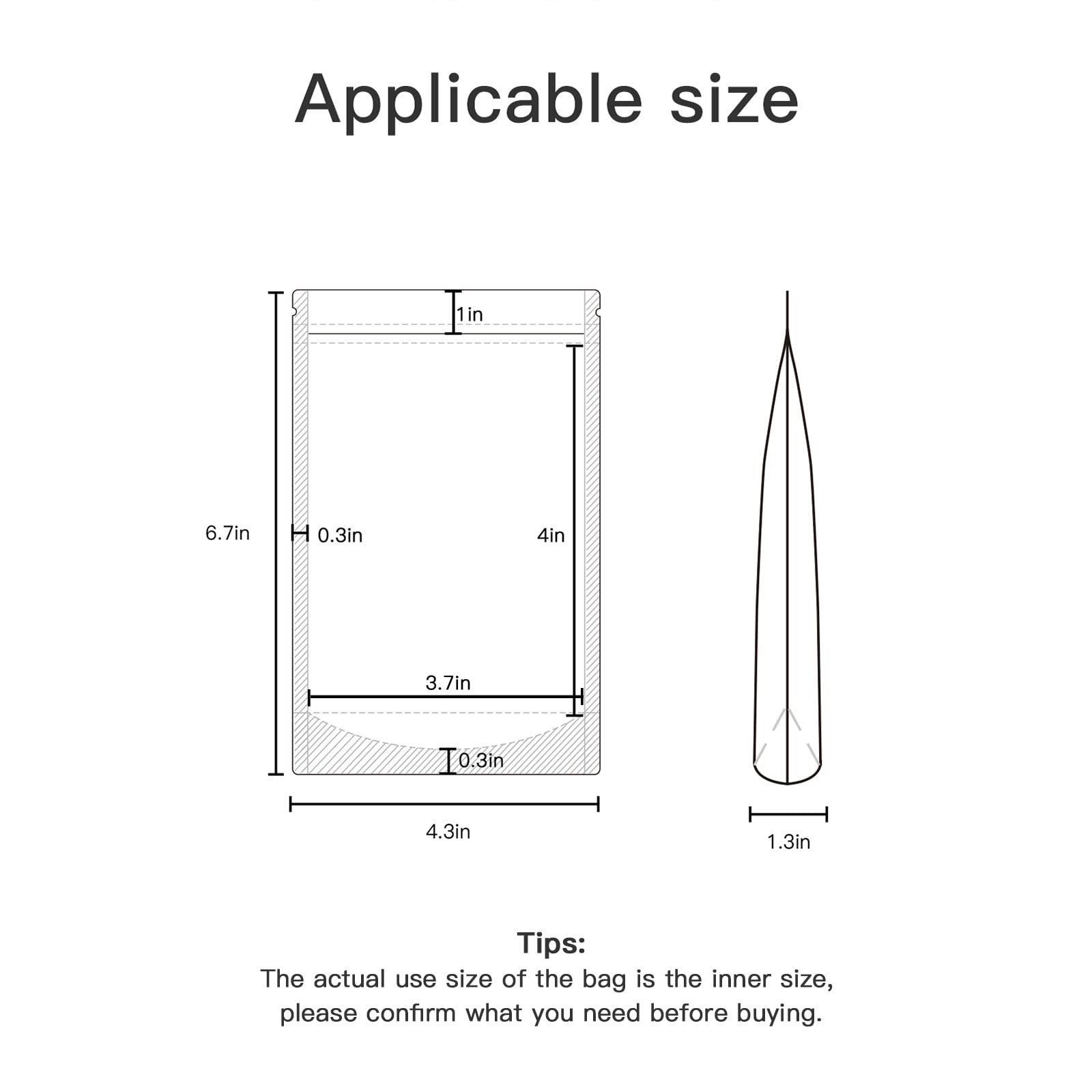 【Quantity & Material】Package include 100 pieces Clear stand up pouches. Outer dimension:4.3*6.7inch,Inner dimension:3.5*4.7inch; Made from food grade plastic, which is odorless, reusable and moisture proof, keeps your products freshness.Practical bags for packing product.