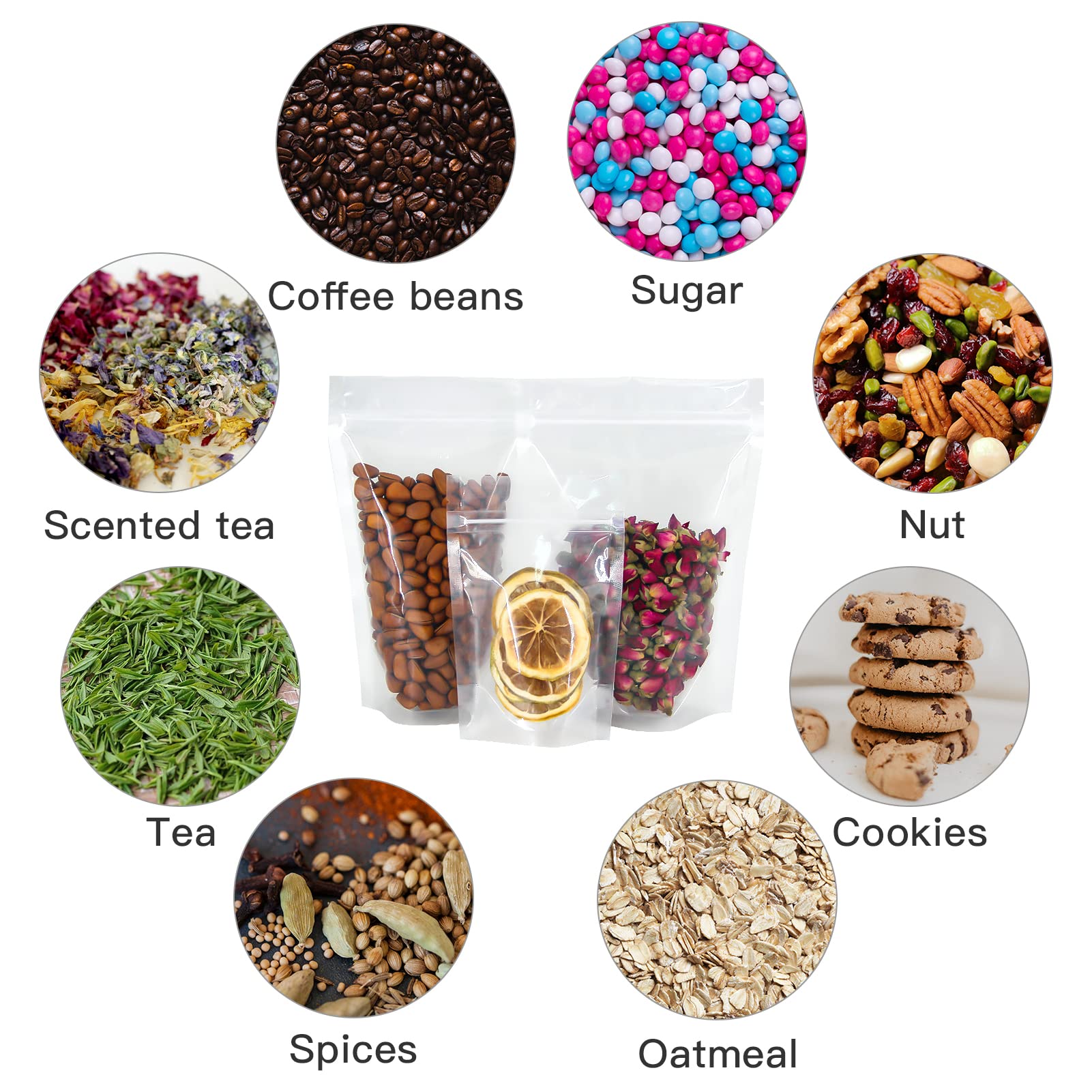 【Convenient Design】U-shaped notch design on the top is easy to tear by customers;Each bag will clearly show the products inside;The bottom of the bag can be expanded, and the bag can stand upfor easy store.