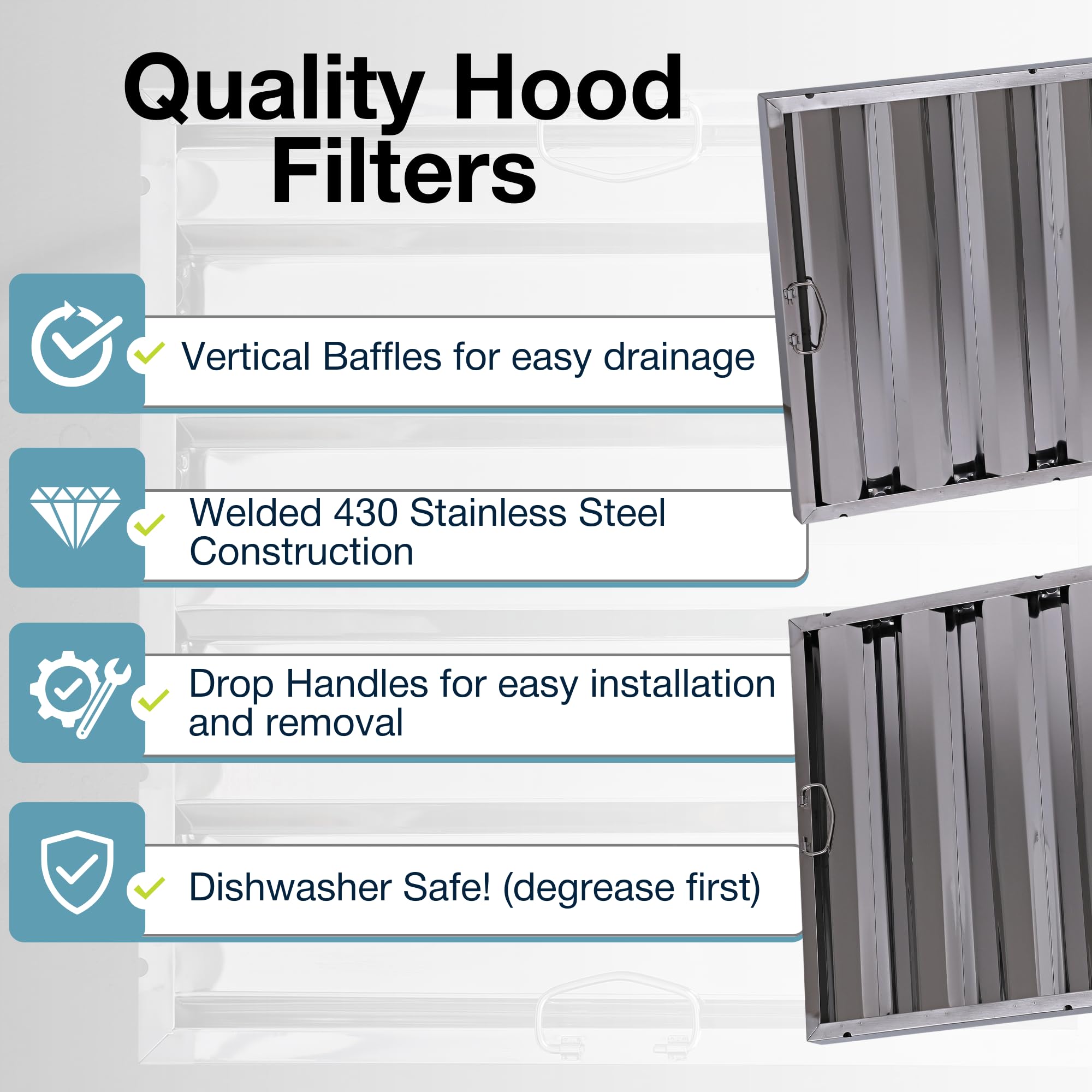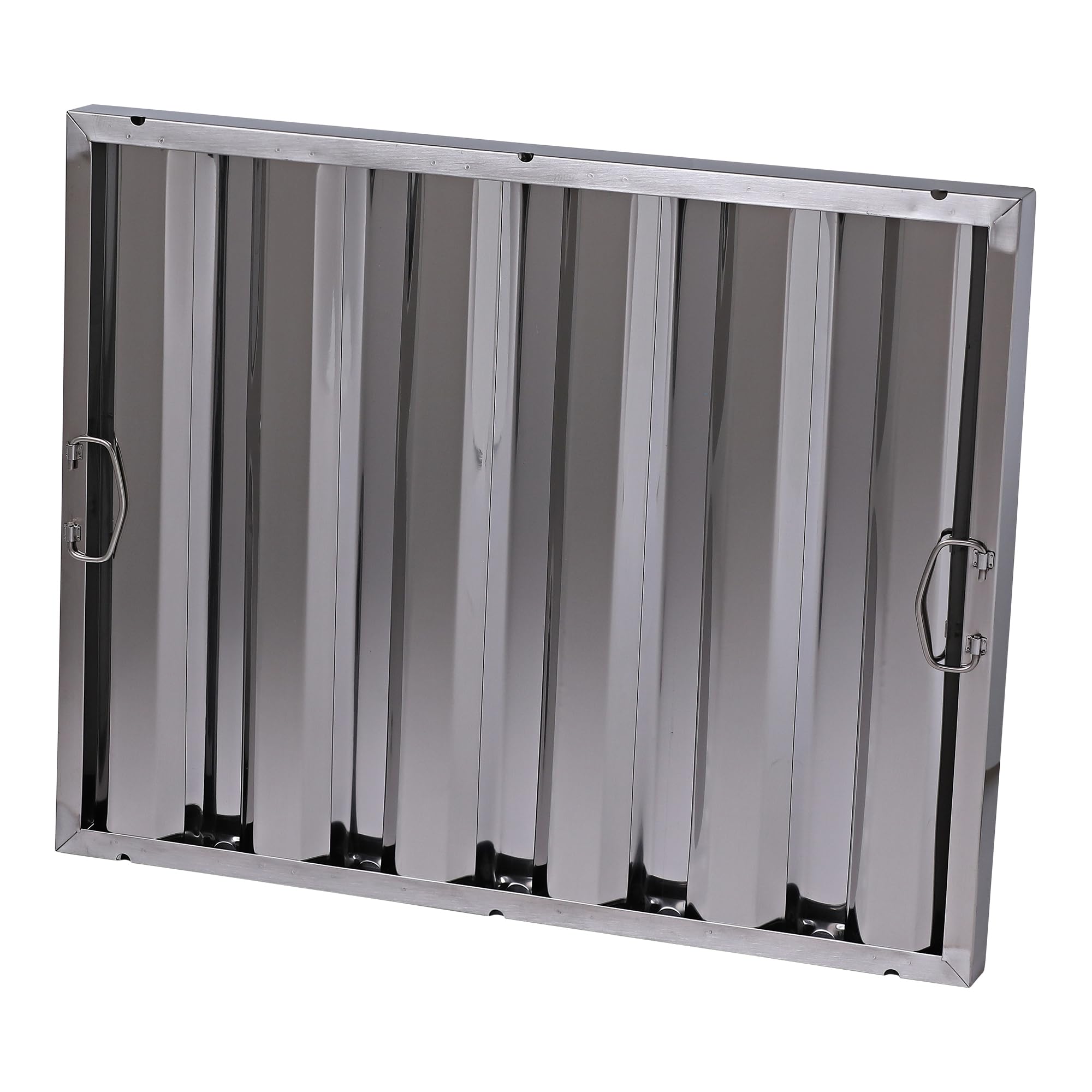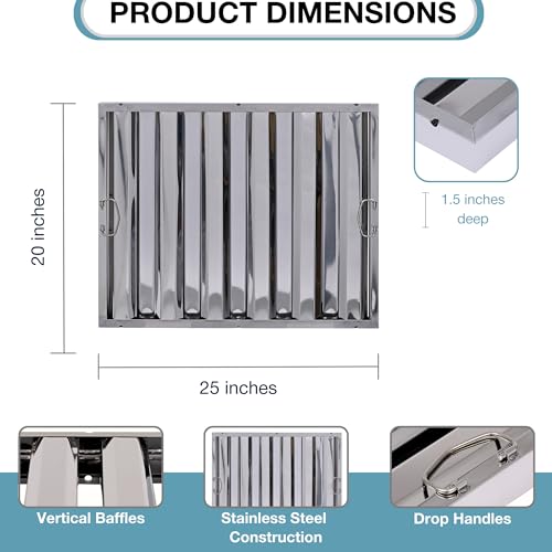 The 25" x 20" Stainless Steel Hood Filter (1.5" thick) is built to deliver dependable grease filtration and fire safety in any commercial kitchen. Made from durable type 430 stainless steel, this filter is highly resistant to corrosion, rust, and heat, ensuring long-term performance in high-demand environments. Its smooth baffle system captures grease and directs it into a drainage system, reducing the potential for dangerous grease buildup and fire risks. Designed for easy cleaning, this hood filter is dishwasher safe and can also be pressure washed to remove even the toughest grease deposits. Equipped with sturdy drop handles, it’s simple to install and remove, allowing for fast, efficient maintenance. Perfect for restaurants, food trucks, and other commercial kitchens, this filter helps maintain a clean, efficient ventilation system, improving kitchen safety and compliance.