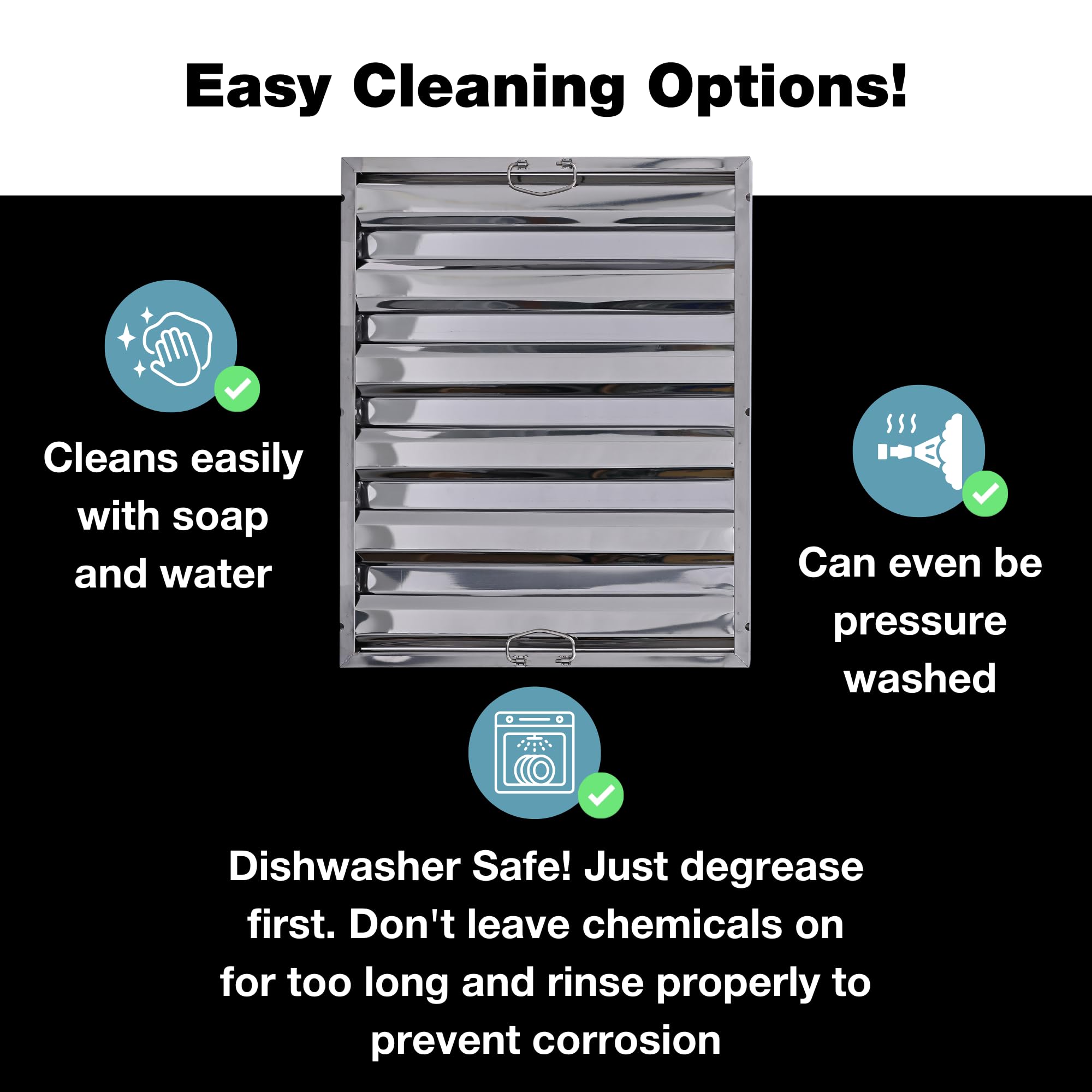 This hood filter is easy to maintain, as it is dishwasher safe and pressure washable, making it simple to remove stubborn grease deposits for thorough, hassle-free cleaning.