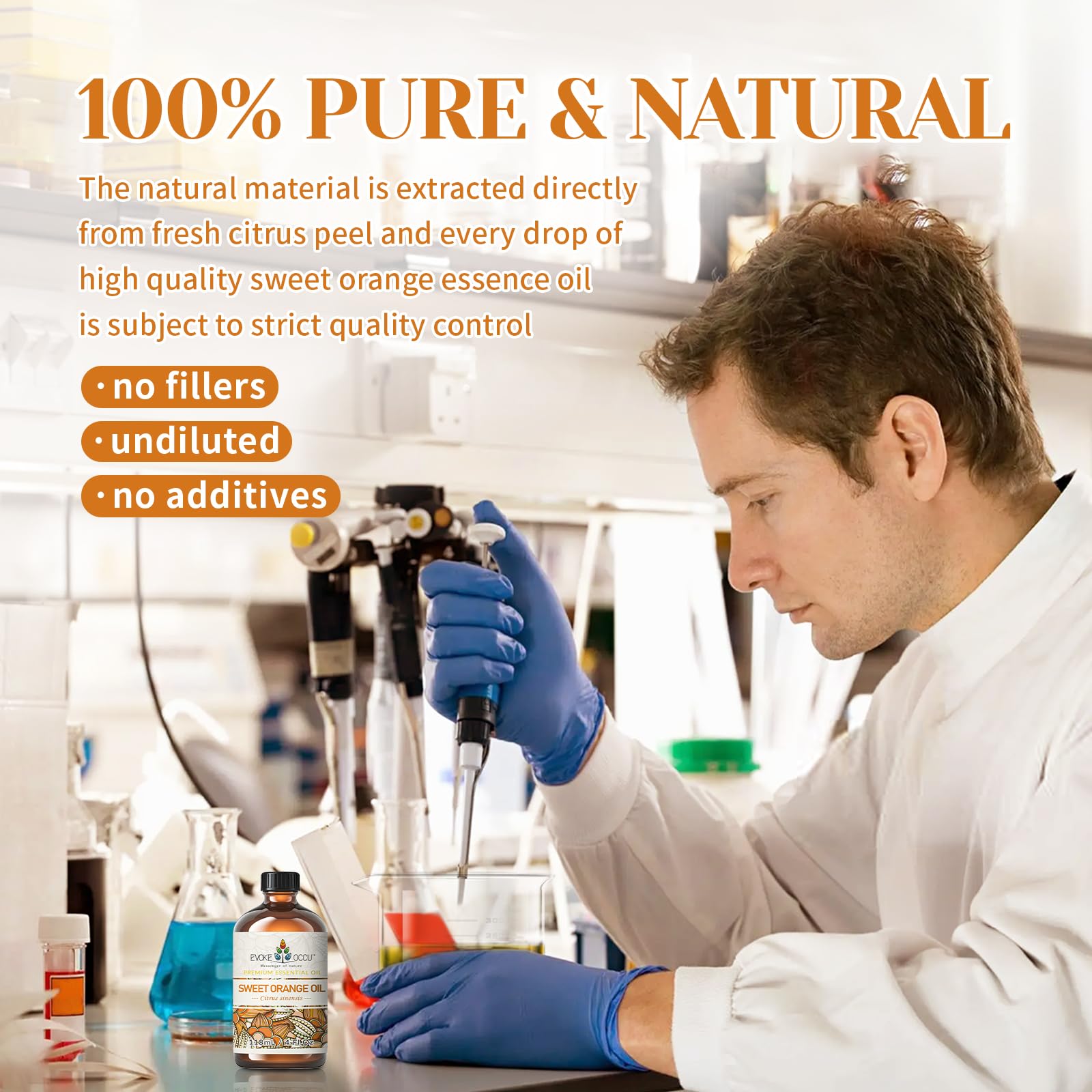 Sweet Orange Essential Oil: Citrus, fresh, sweet, warm. 100% Pure sweet orange oil, extracted from fresh citrus peel by cold pressing, undiluted, no additives, no fillers