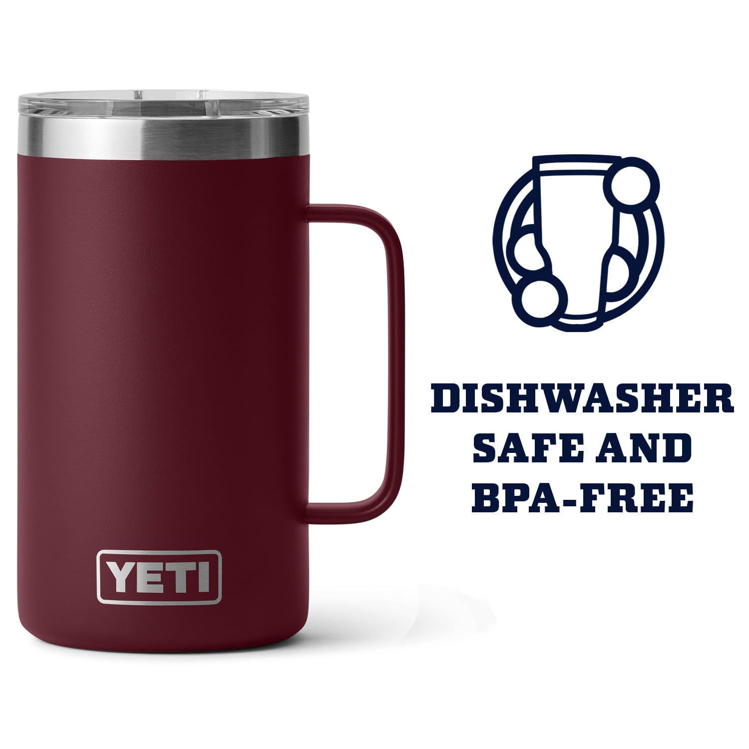 The YETI 24 oz. Rambler Mug stands 6.4 in high and has a lip diameter of 4.6 in, and with the handle its 5 inches wide