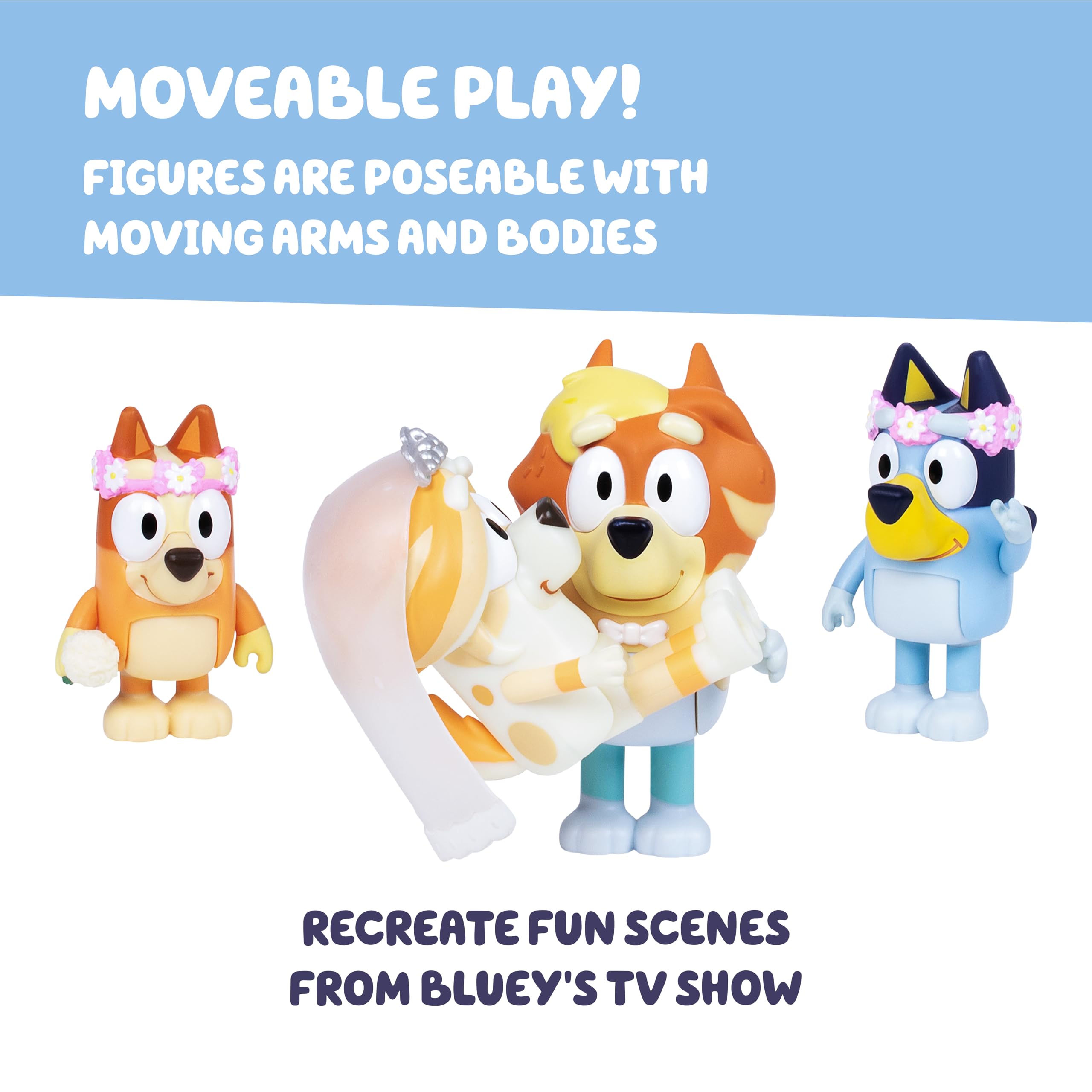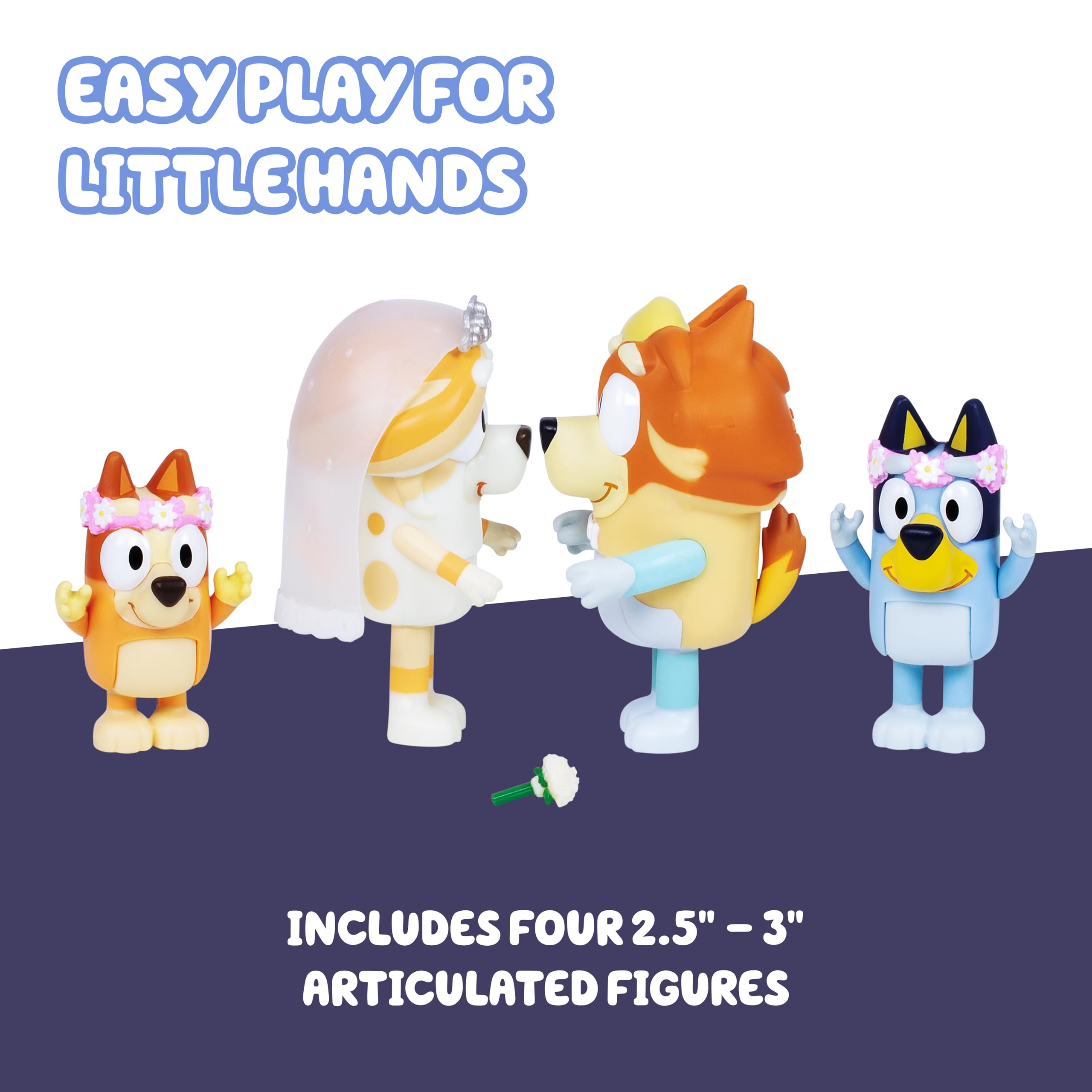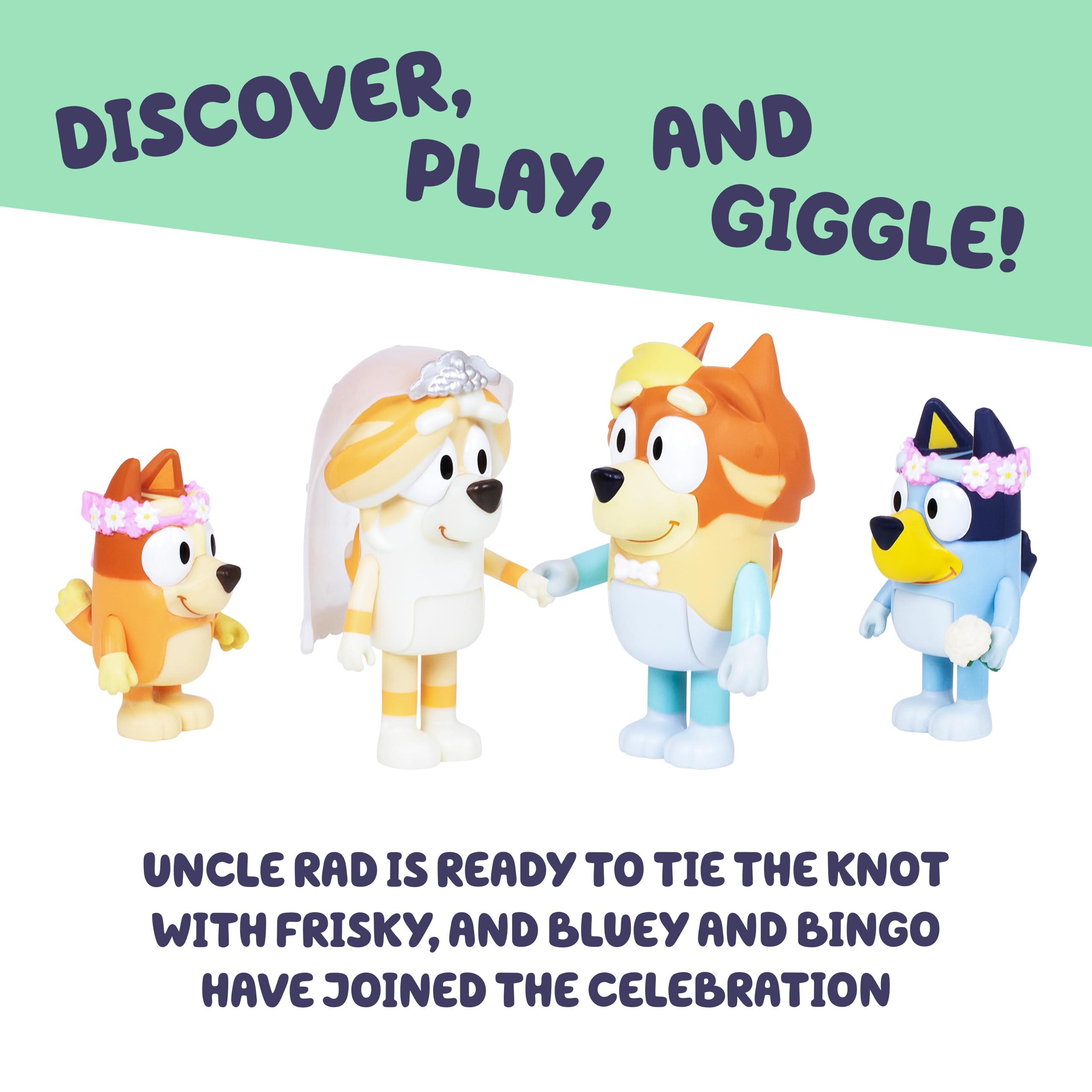 Bluey Special Pack: Get ready for Uncle Rad and Frisky’s big day with our wedding time toddler figurine toys; this Bluey playset includes 4 Bluey wedding character figures ready for every playtime adventure