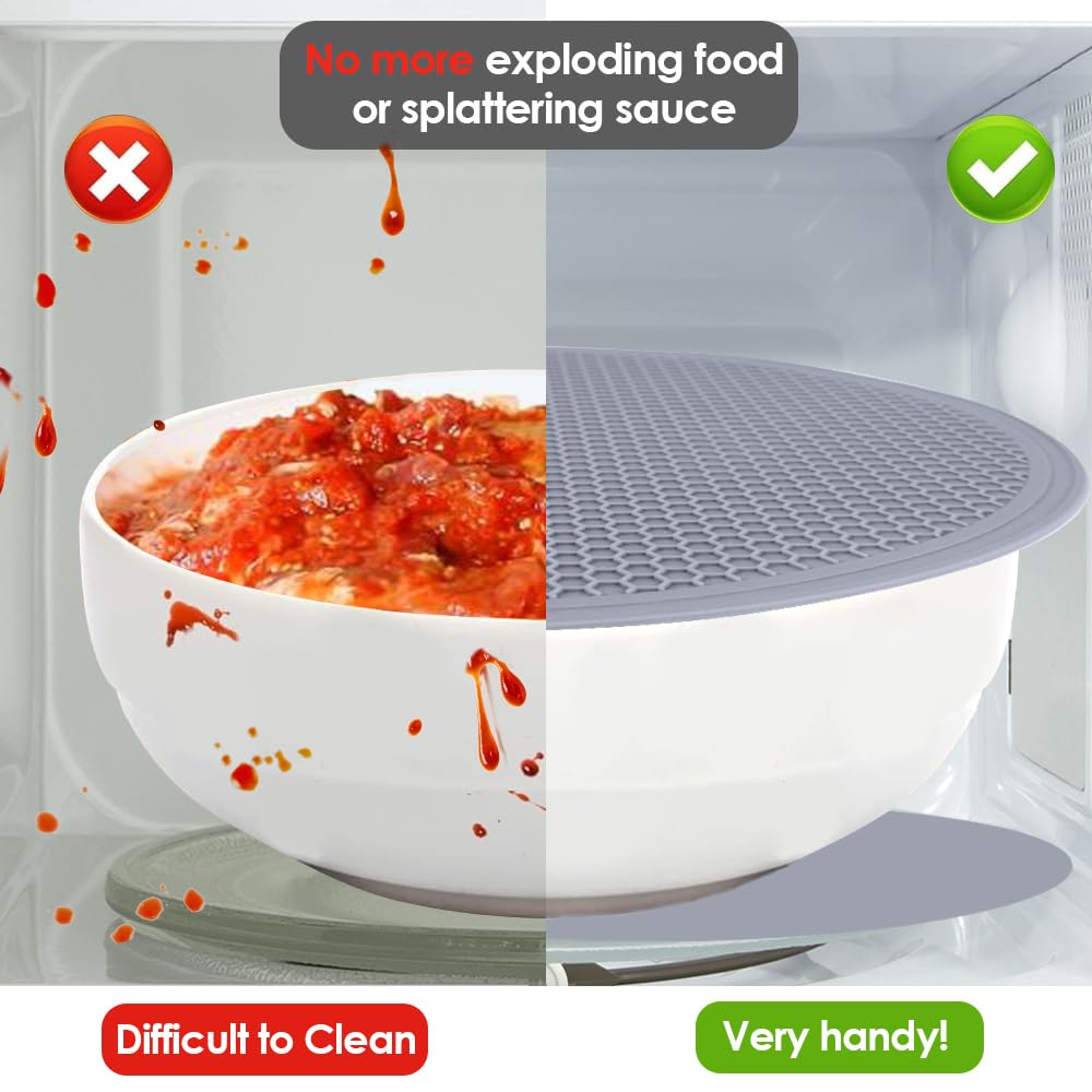 🥘Food Grade Silicone- Light grey silicone microwave mat made of food grade silicone, High heat resistant up to 446°F. BPA free, flexible and durable. Premium silicone materials ensure that they won't rust, crack or chip.