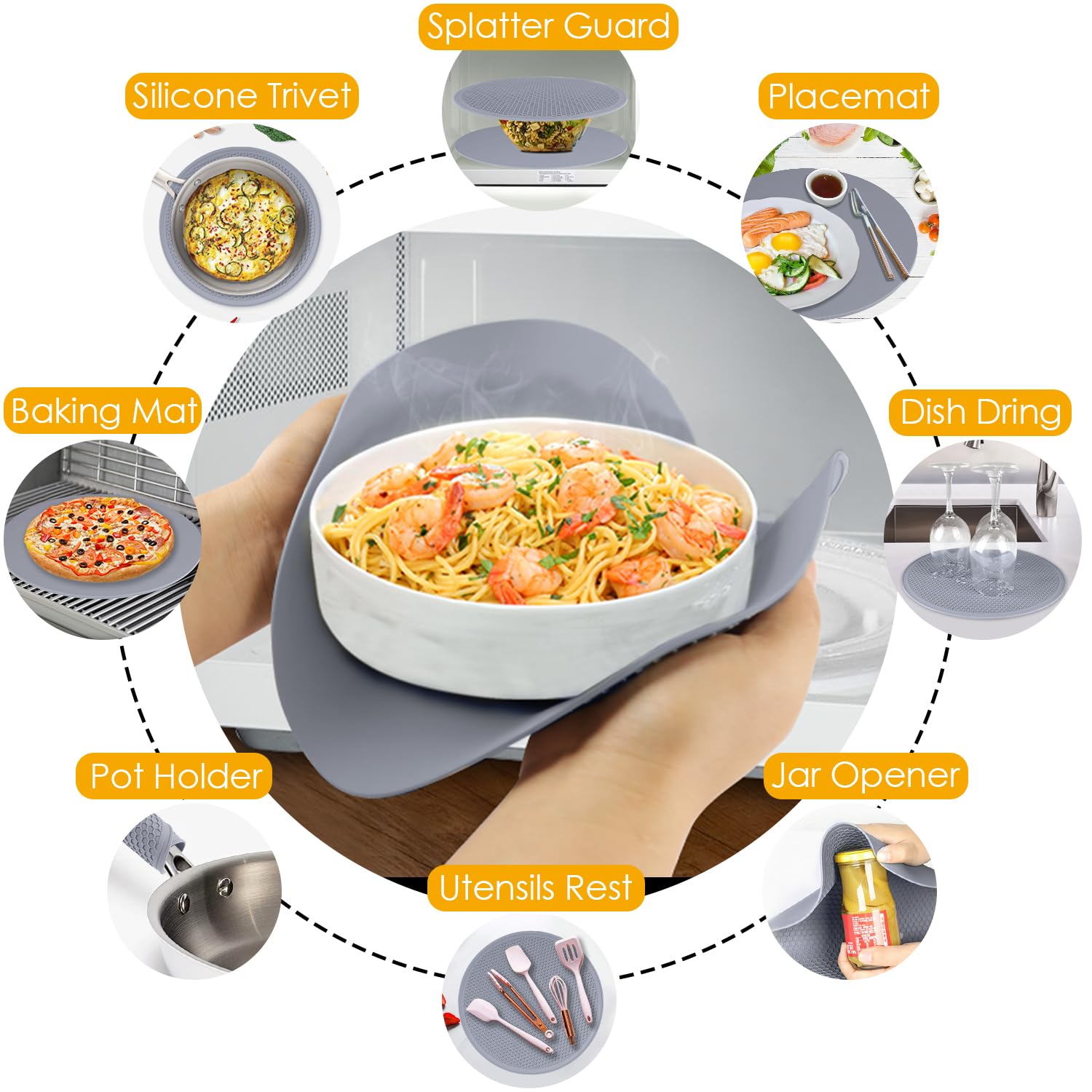 🥘Versatile Design Trivet Mats- Versatile design doubles as food cover to guard microwave from splatter including 4 pack light gray microwave silicone mat, suitable for large and small microwave ovens, can also be used as bowls mat, pot mat, coasters, teapot mat, table mats, coffee mat, jar opener, hot pot holder, large coaster, hot mitts, spoon rest, dish drying mat or anywhere you need extra grip or extreme heat or cold protection.