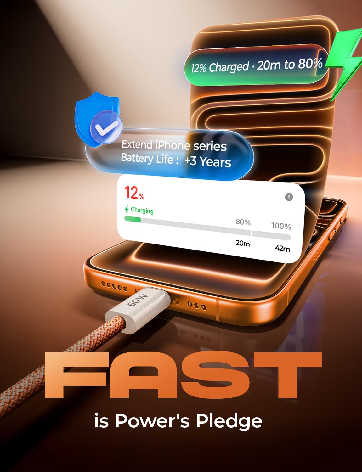【60W Turbo Fast Charging】This iPhone 17 charger cord support PD3.0/QC3.0/QC4.0 fast charging up to 60W Max (20V/3A) with USB-C Power Delivery adapters such as 30W/45W/60W. Which 2.2X faster than 3.1A version and charges USB C Phone from 0% to 80% within 35 minutes, iPad Pro 64% within 35 minutes, Macbook air 50% within 35 minutes, and data transfer speeds up to 480Mbps (1200 songs synced per minute) compatible with Samsung,Tablt,iPad Air Mini Pro,Macbook and More.