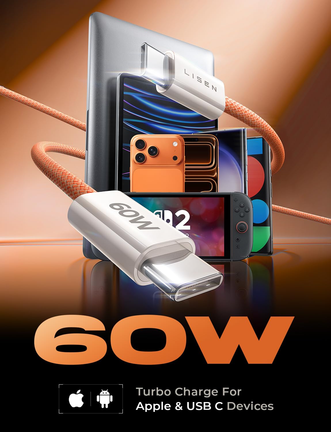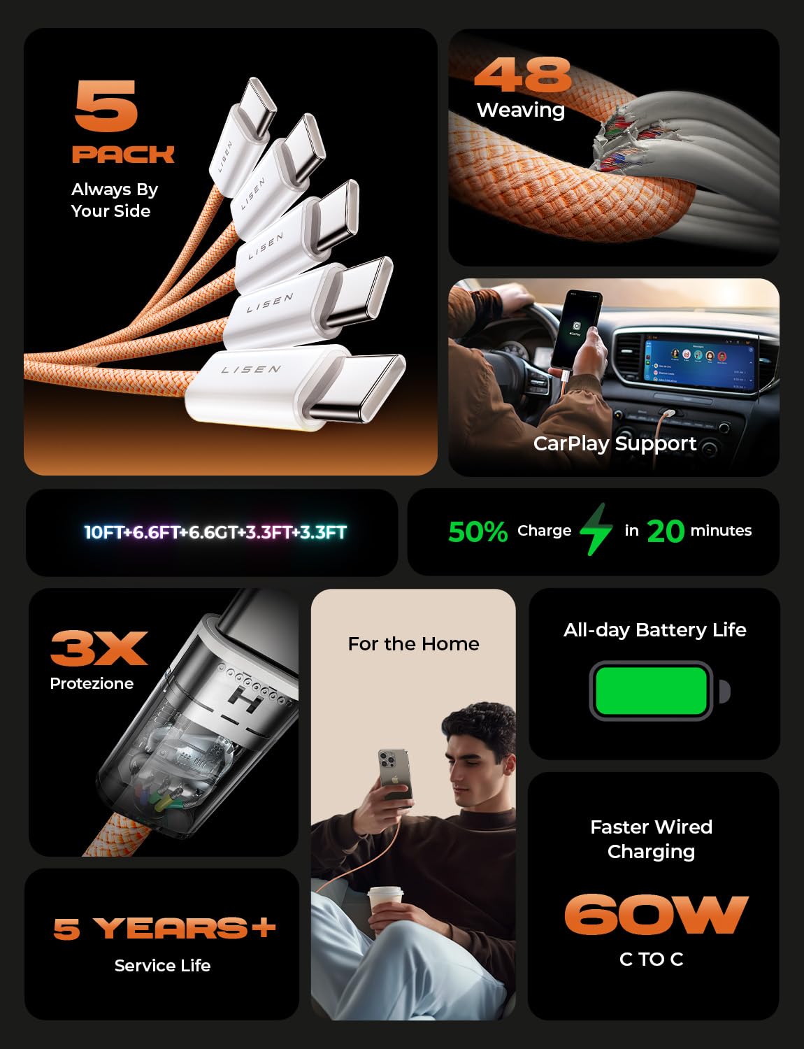 【What You Get】LISEN USB C to USB C Cable 5-Pack (3.3/3.3/6.6/6.6/10FT), 24-Month worry-free period and 24/7 customer service, if you have any questions, we will resolve your issue within 24 hours. Whether you're shopping for samsung or iphone 16 pro max charger cord accessories gifts for men/women or reliable car accessories, this super fast charger usb c to c cable is built to last