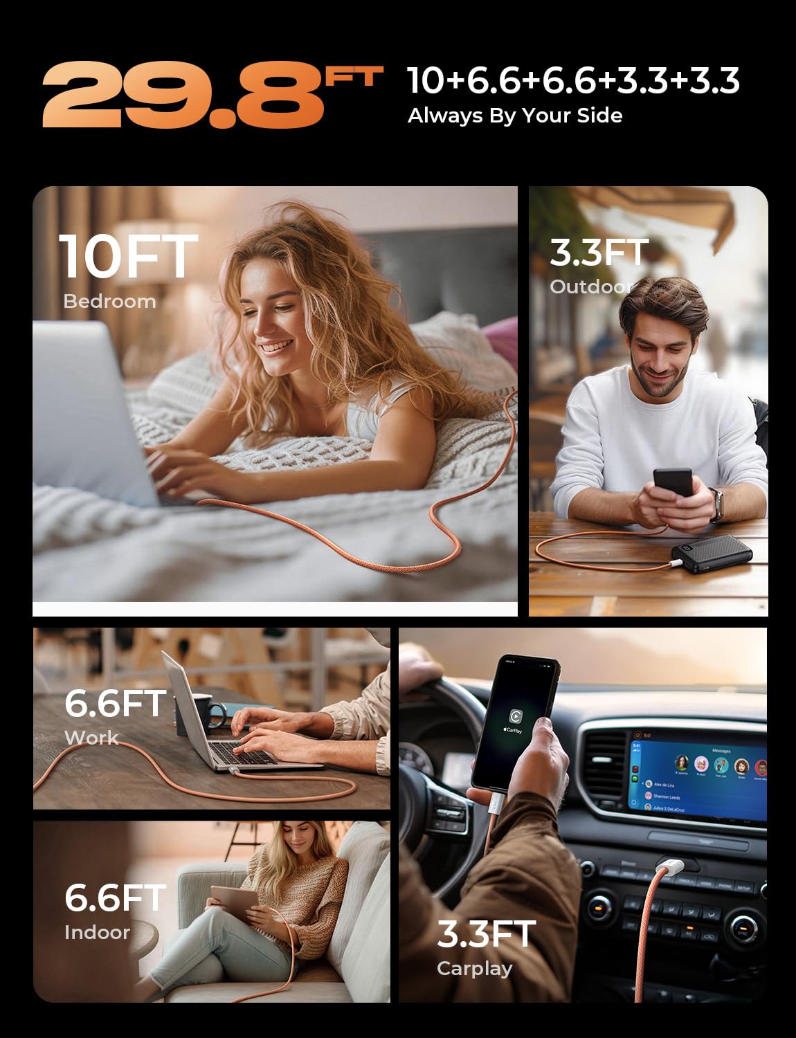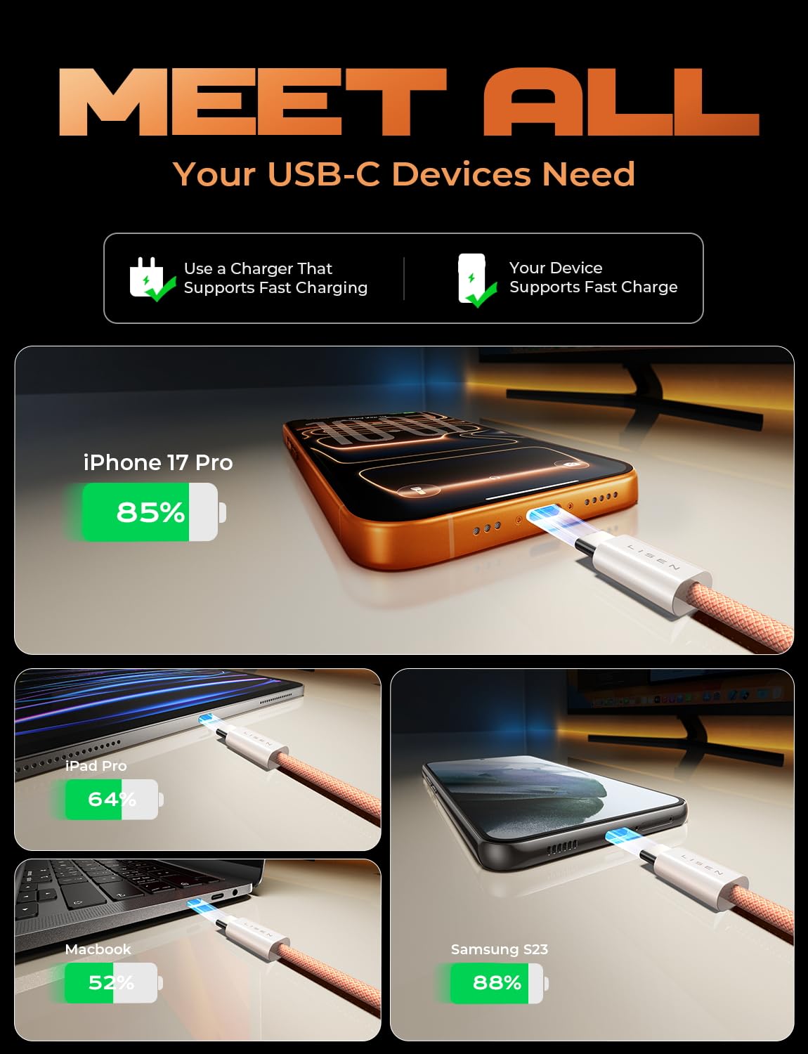 【Right for ALL Your Devices】This is the USB-C to USB-C cable Not the USB-C to USB-A cable, iPhone 17 Pro Max fast charger Compatible with virtually all USB-C devices including phones, tablets, and laptops. Such as Samsung Galaxy S25/S24/S23/S22/S21+/S21/S20/ S20+/ S20 Ultra/ Note 10, MacBook Air/Pro 13'', iPad Mini 6, iPad Pro 2021/2020/2018, iPad Air 2020 and more.This product supports bulk purchasing, making it ideal for businesses and large orders.