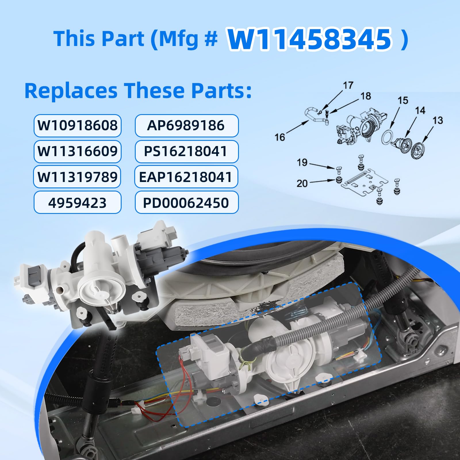 【Replaceable Models】The W11458345 Washer Water Drain Pump Assembly replaces the following part numbers: W10918608, W11316609, W11319789, 4959423, AP6989186, PS16218041, EAP16218041, PD00062450