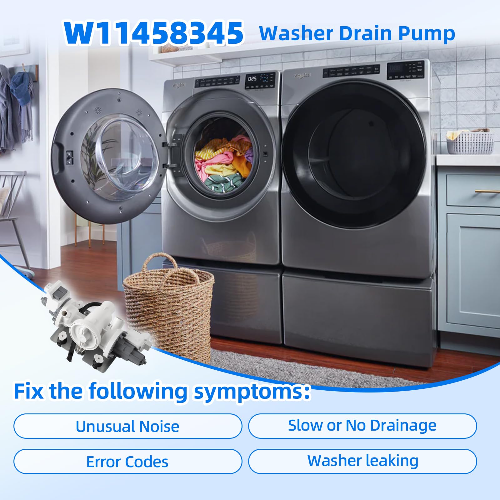 【High Quality】This W11458345 Washer Water Drain Pump Assembly is constructed from durable materials to prevent leaks, reduce noise, and extend the lifespan of your washing machine. It effectively resolves issues like poor drainage, pump failure, and error codes