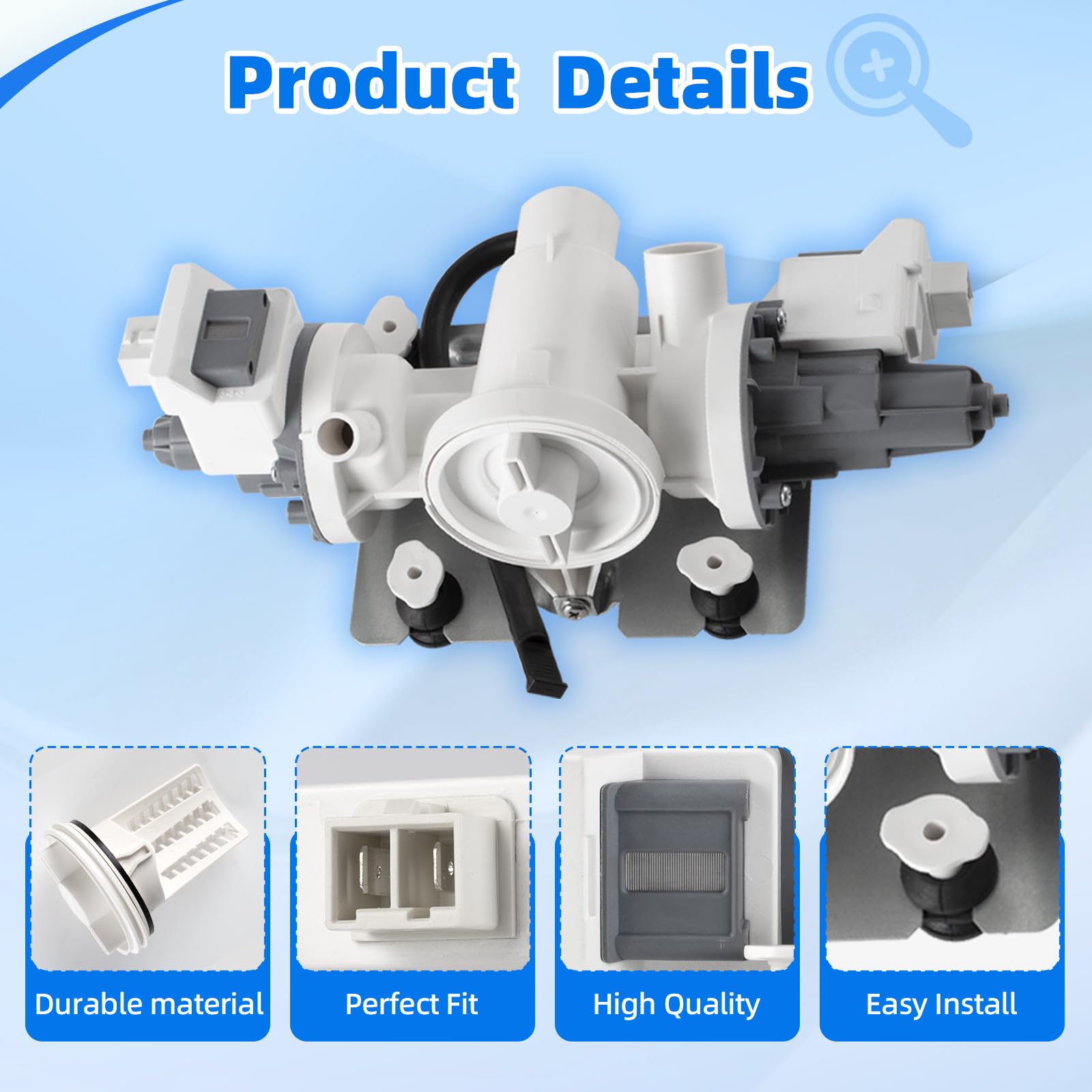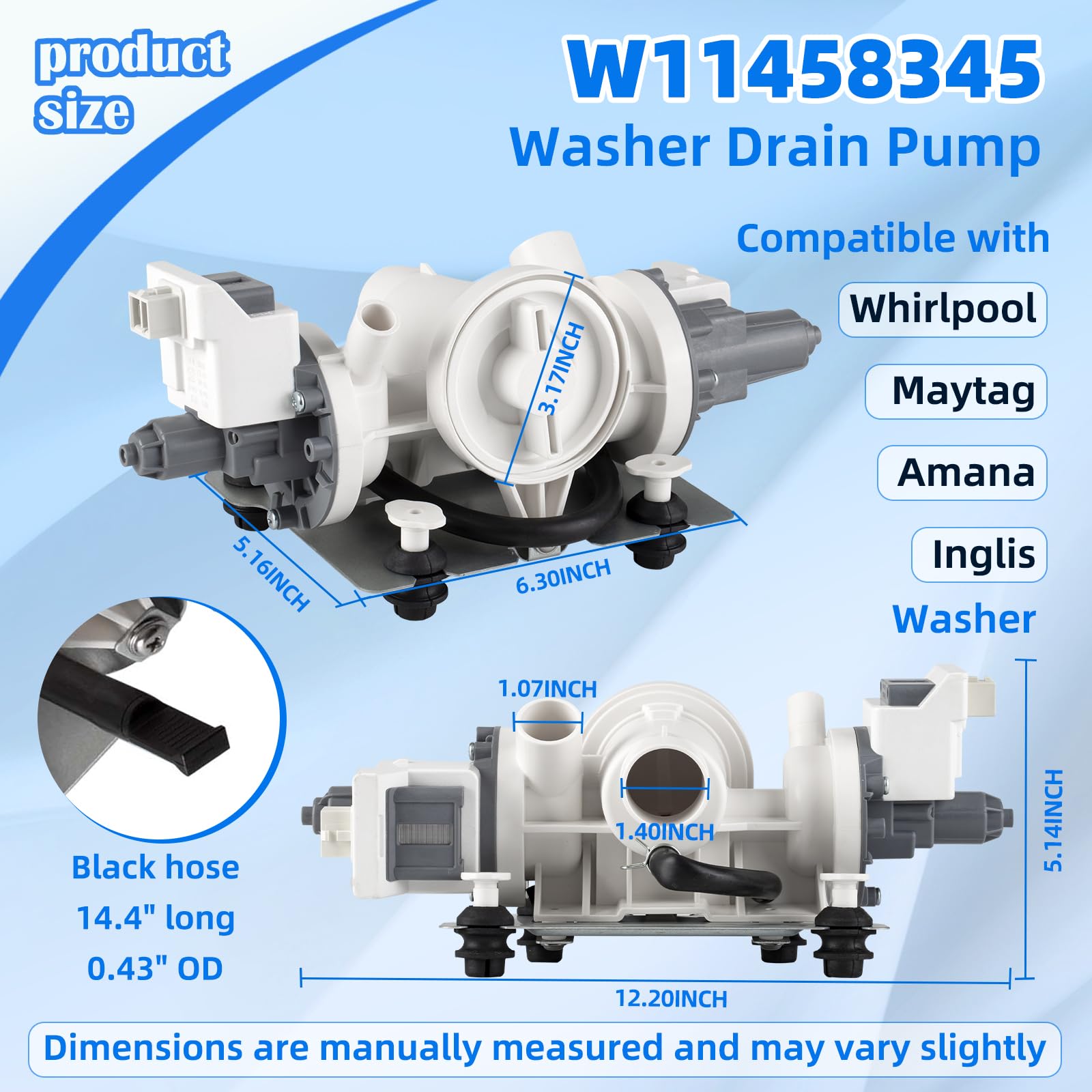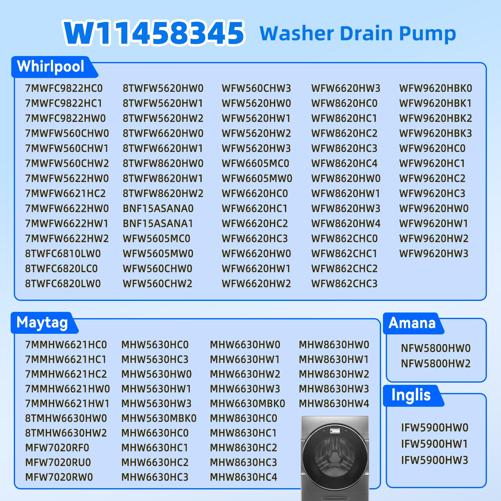 【Compatible Brands】This pump is specifically designed for Whirlpool, Amana, Inglis, and Maytag washing machines.Compatible washer models are as follows: Whirlpool: 7MWFC9822HC0 7MWFC9822HC1 7MWFC9822HW0 7MWFW560CHW0 7MWFW560CHW1 7MWFW560CHW2 7MWFW5622HW0 7MWFW6621HC2 7MWFW6622HW0 7MWFW6622HW1