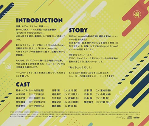 Our life is our art. From DIG-ROCK, the series series series series "Hound ROAR Vol.1 (Houndloak Volume 1)" which was launched by Tim Entertainment Co., Ltd. who planning, producing, and sales of music and drama CDs, launched by Tim Entertainment Co., Ltd. that has been released in the popular original drama CD "Hound Roar Vol.1 (Houndloak Volume One)" and "BRE. Time in NY Introducing Ichtime in New York). This work is based on the "DIGNITY PRODUCTION", which has become a popular Indians band and has gained overwhelming support from young people, and the "Impish Crow" is also known as Incro, which has gained overwhelming support from young people. : General name: Lu. The dramatic CD series depicts the band story of the "Hound Roar" which debuted from the "Renown Stage" and "dice" series. This is a sequel from the previous "dice" series, and the CD "HOUND ROAR Vol.1", which draws the story of Howro, and "BREAK TIME in NYC" that depicts events that are both work and vacation. In "BREAK TIME", new characters are also added, and the Inclo and Rubile's come together together to create a story! "Impish Crow" is an indie rookie band that belongs to the office based on the voice of Manager Takura. Featuring a positive theme that won't give up your dreams, the lyrics from the head of the head and the powerful rock. Abbreviated for Inclo. The band motif is "crow". The cast includes a number of hayama missurpassed talents and vocalist "Tsumi Nonaka (Tsugumi)" and Yuma Uchida, a recognized leader "Loved Leader", guitarist Noruki Mizukawa, Takuya Eguchi, and a "Natural Basist" "Yasuru Hayama (Hayama Misuru)". Wataru No, Outside Kenjin Ito, the manager of Shinnosuke Tachibana and "Unzaku Shibasaki (Tubisaki, Hibari)" from Gosho Juuchi "Poison Tongue" and "Unzaku Shibasaki. "RUBIA Leopard" is a popular band that is proud of live tours, and is a popular music industry. Features vocal lyrics and overwhelming songs, strong and straight thoughts. Abbreviated to "Rubile". The band motif is "Made-colored Leopard". The cast includes Tenka Mujira "Perfect King" and "Sunkuru Akane" from "Higurashi Akane" to "Perfect King" "Vocalist" "Higurashi Akane" and "Shin Furukawa, "Loyal Hardness" Guitarist "Tsuki Kuroko" and "Ishikawa "Misaku Fuyuki Maro)". Takuya, Exploration He started Wataru Komada, a manager who is responsible for Natsuki Hanae and Rubire, from the Drummer "Sumizome Neiji (Sumizome Neiji)" and "Iwara Shiki Iwara Shiki". This is an audition entitled to unravel the new band of "Renown Stage" and is an upcoming band that has won the path of debut unnamely. It expresses the "rock" that is different from the Inclo and Rubile, and features songs that incorporate elements from alternative rock to jazz, classic. The abbreviation is "Howro". The band motif is "Blood Hound of the Hunting Dog". The cast includes Toshiyuki Toyonaga, a vocalist from "Unawareness Genius" and "Vocalist" from "Kono (This cracker)", "Tundelayanke" guitarist "Shobai Tsunderayanke" "Shoubai Endo" and Ryohei Kimura, "Tenma" Brain Free Man "Hayama green) Mitsuka Kawa, the intense "nervous nervous nervous geek" keybodist "Ri Ono, Uziro Umehara, "Chiro Ono no no no no no no no Taisa" "Drummer Shooto (Kado Sogo)", the manager who is responsible for Howro "Takahi" Kaga Kasui. Recognized by Tetsuke Haki for In addition, as a new character of "BREAK TIME in NY", the father of the Akadeki Higurashi Takaki" (CV. Hiroki Tochi). Together, the brother "Emperor Higurashi Mikado" (CV.Daisuke Ono) and "Higurashi Kaede" (CV.Satoshi Hino), and "Satoshi Hino), are now available to bring a luxurious story in New York. Like the previous series, each band includes new songs as well. The series is enhanced with overwhelming song power and new songs by Tsugumi (CV, Uchida), Akane (CV, Shin Furukawa), and Hibiki (CV. Toshiyuki Toyonaga). Continuing to the previous work, the director of the same label, "A's x Darling", "AD-Fresh", "Otomay Record" "Love Color" and "Kunkoi Signal", the scenario