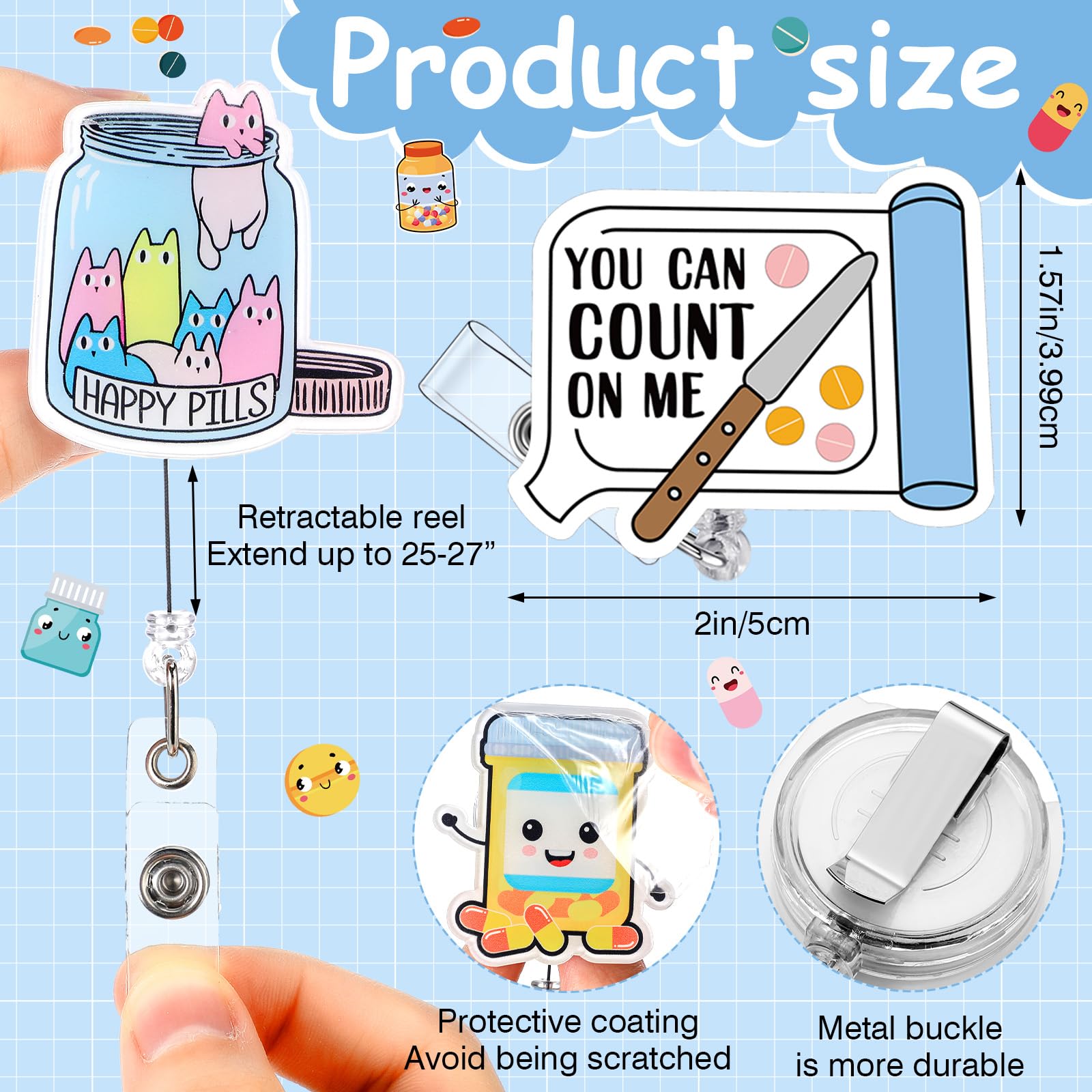 Attractive Design: this pharmacy badge reel features a fun and cute design based around a pharmacy theme with elements such as a pill counter, pill, and medicine bottle; The appealing cartoon visuals make it an accessory for anyone in the pharmaceutical field, making these med tech badges not only functional but also fashionable