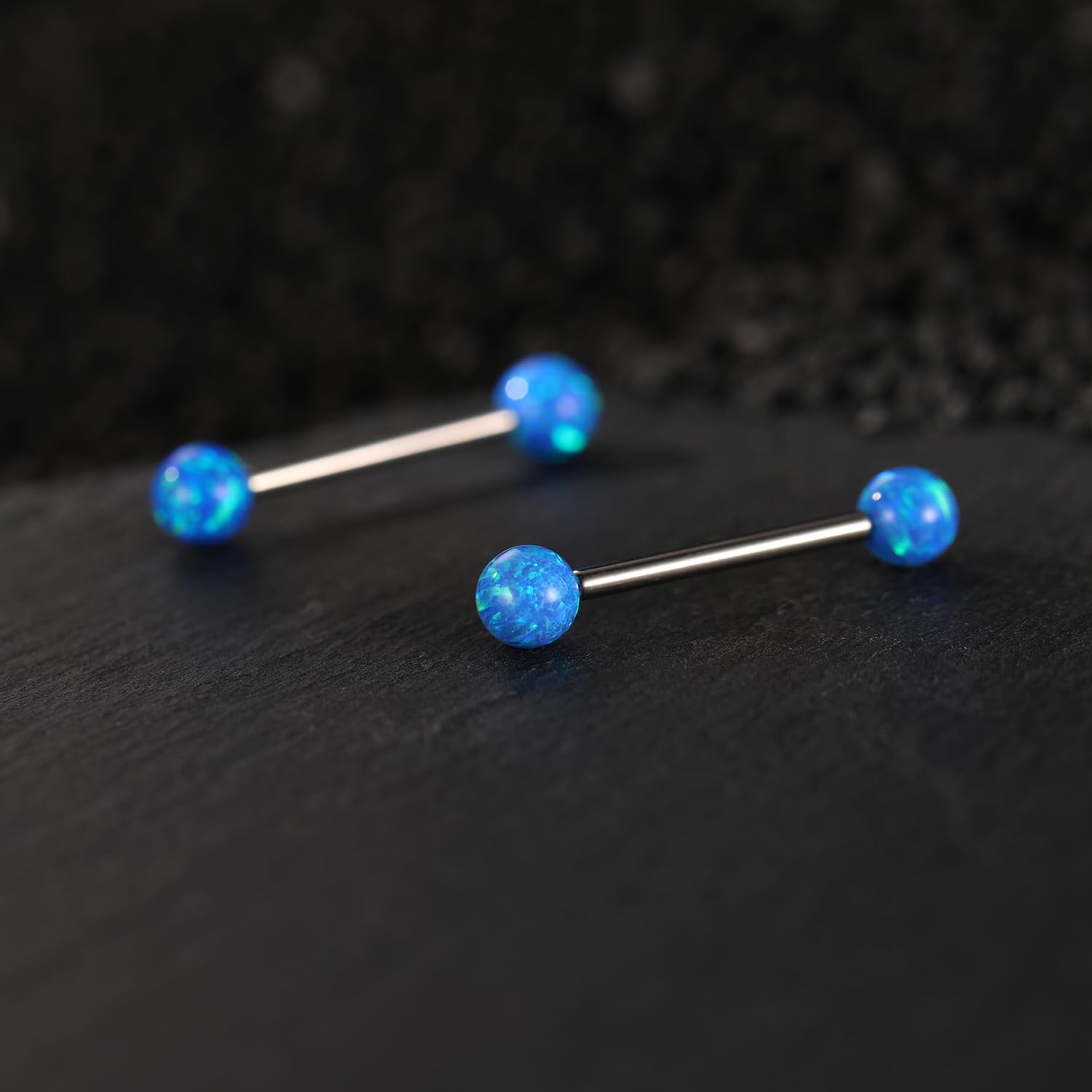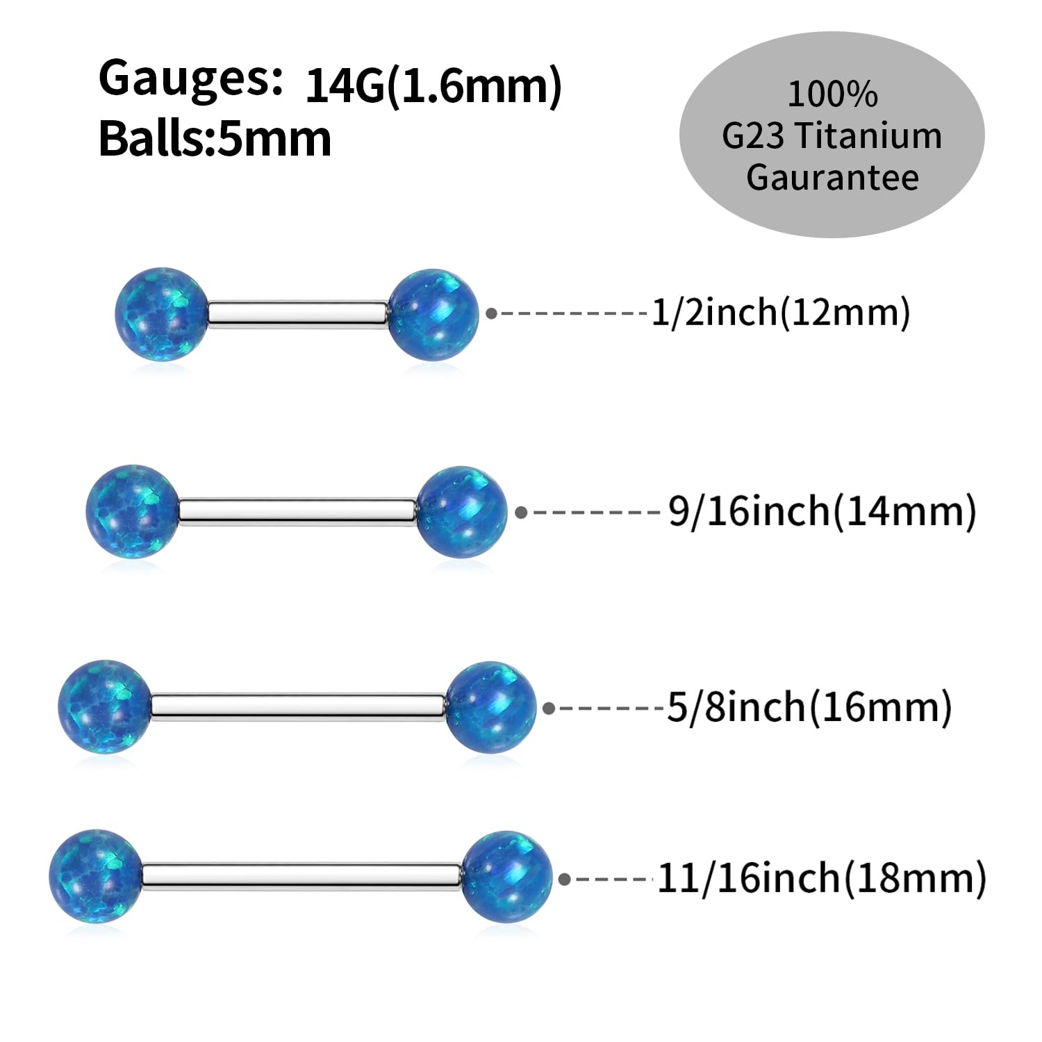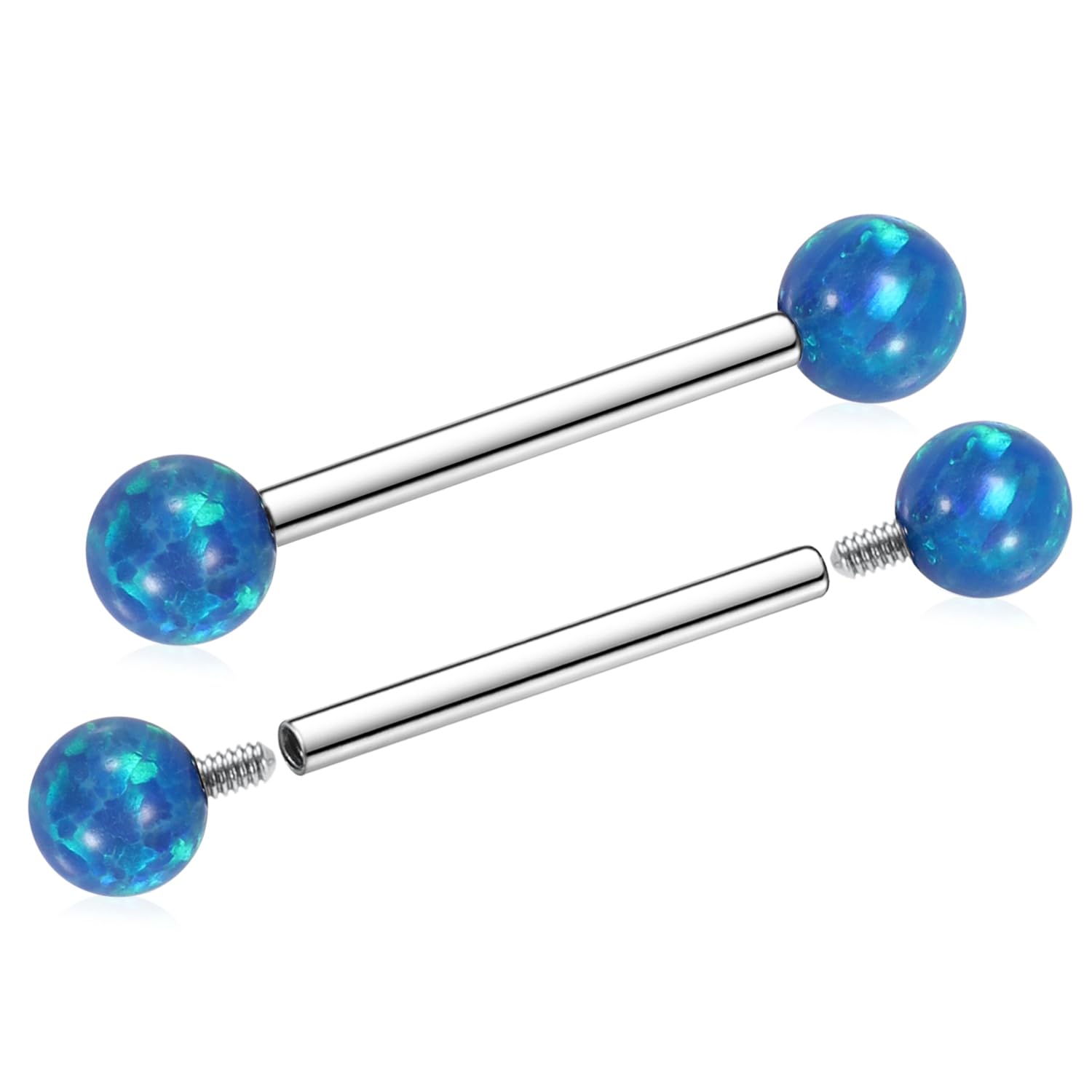 Size and Color: gauge: 14G (1.6 mm); Nipple Barbell Length: 1/2"(12 mm); Ball Size: 5 mm. Color: Silver with blue opal. 2pcs nipple rings per order