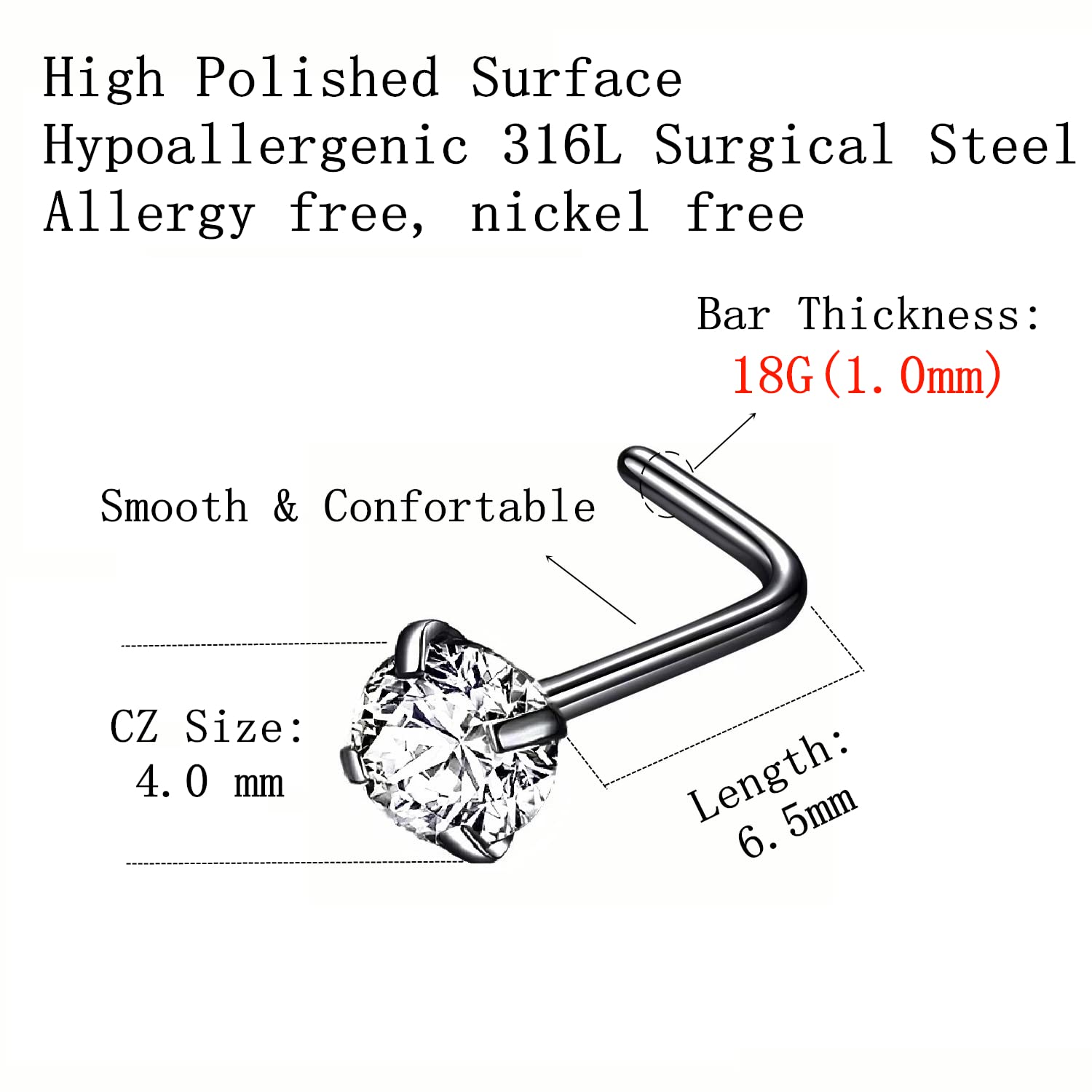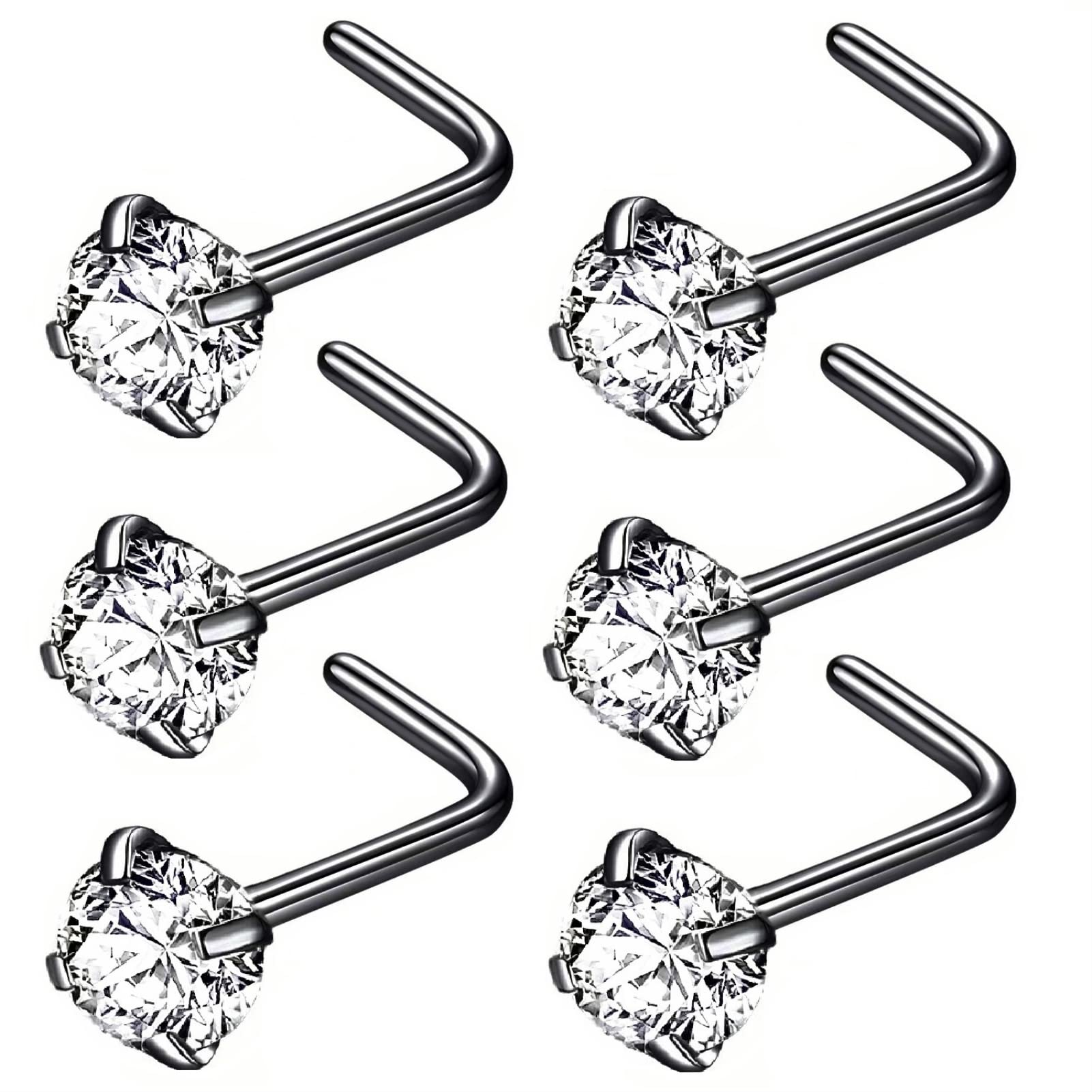 Quantity: 6pcs 4.0mm CZ nose stud. This L shaped nose studs for women size: Bar thickness: 18 gauge (1.0mm), Pin Length:6.5mm, Prong set cubic zirconia: 4.0mm, These stones a very bright and prong set by hand for accuracy.