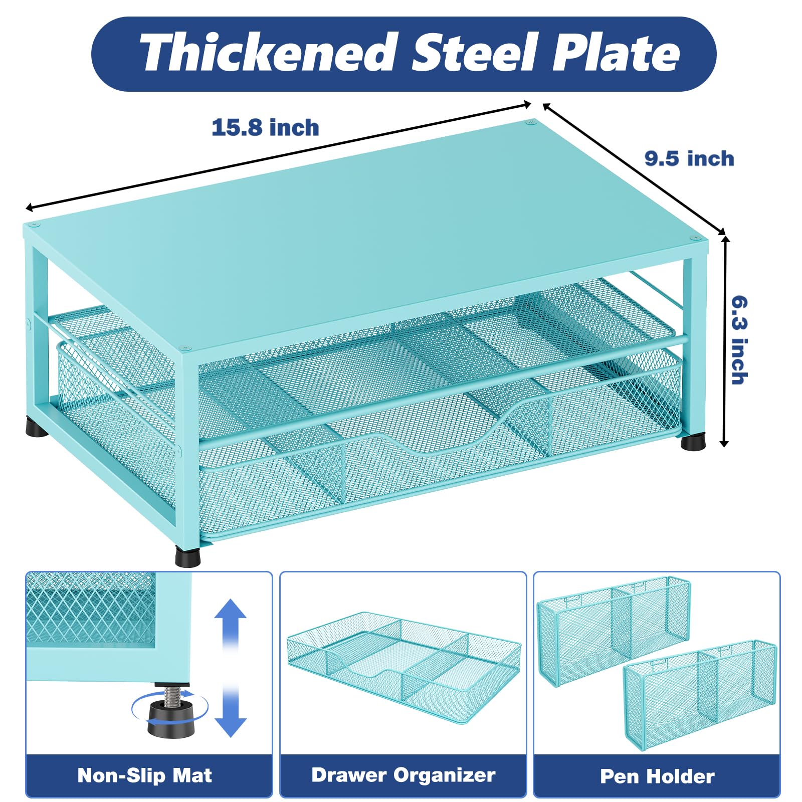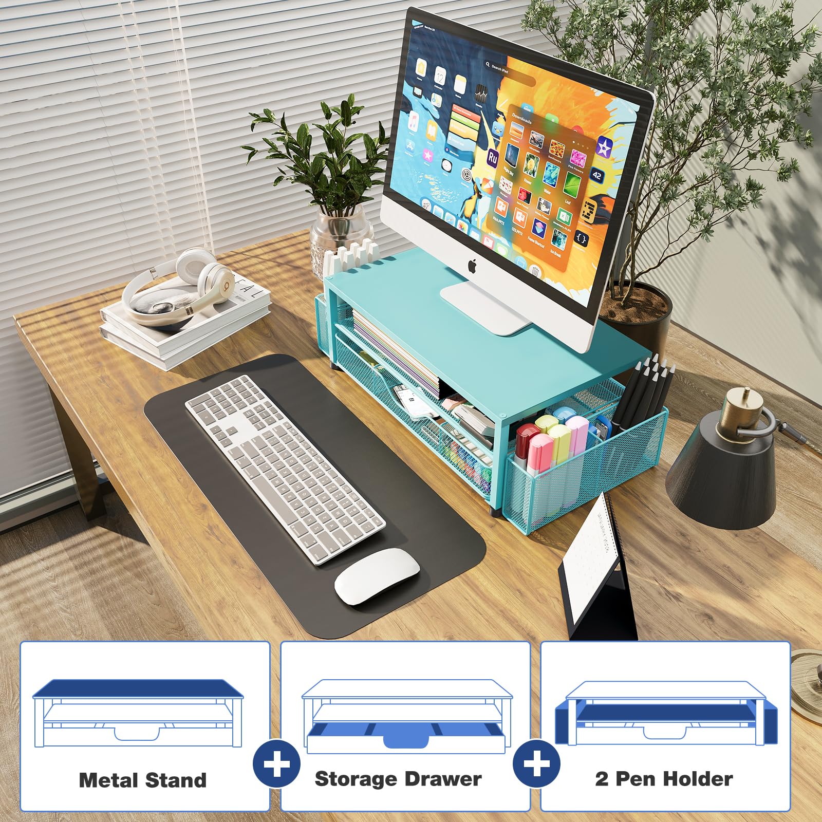 【Save Space】:This 2-Tier monitor stand with drawer and 2 hanging pen holders provides ample storage space to keep your office supplies and office desk accessories neatly organized and easily accessible, keeping your workspace tidy and improving your sense of well-being