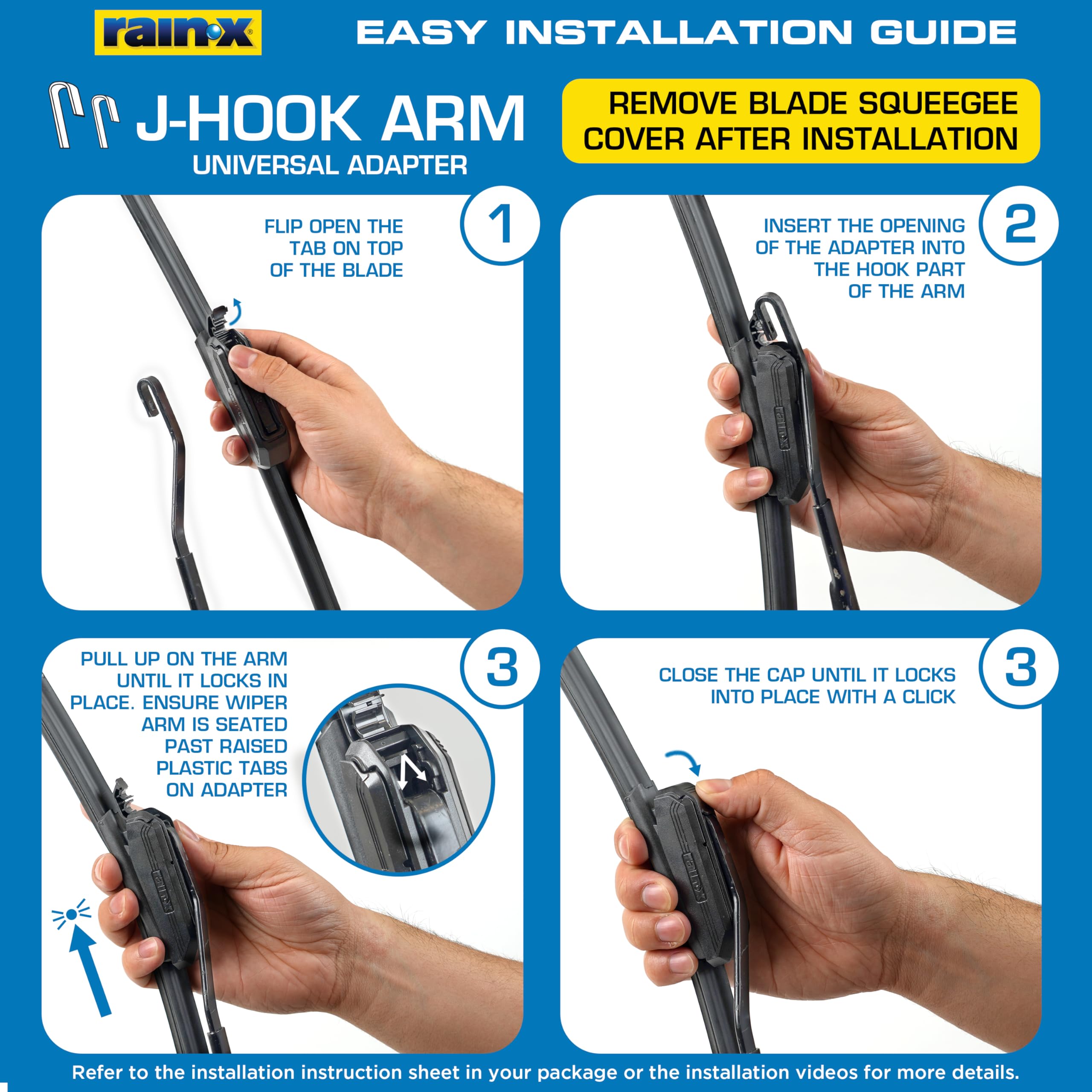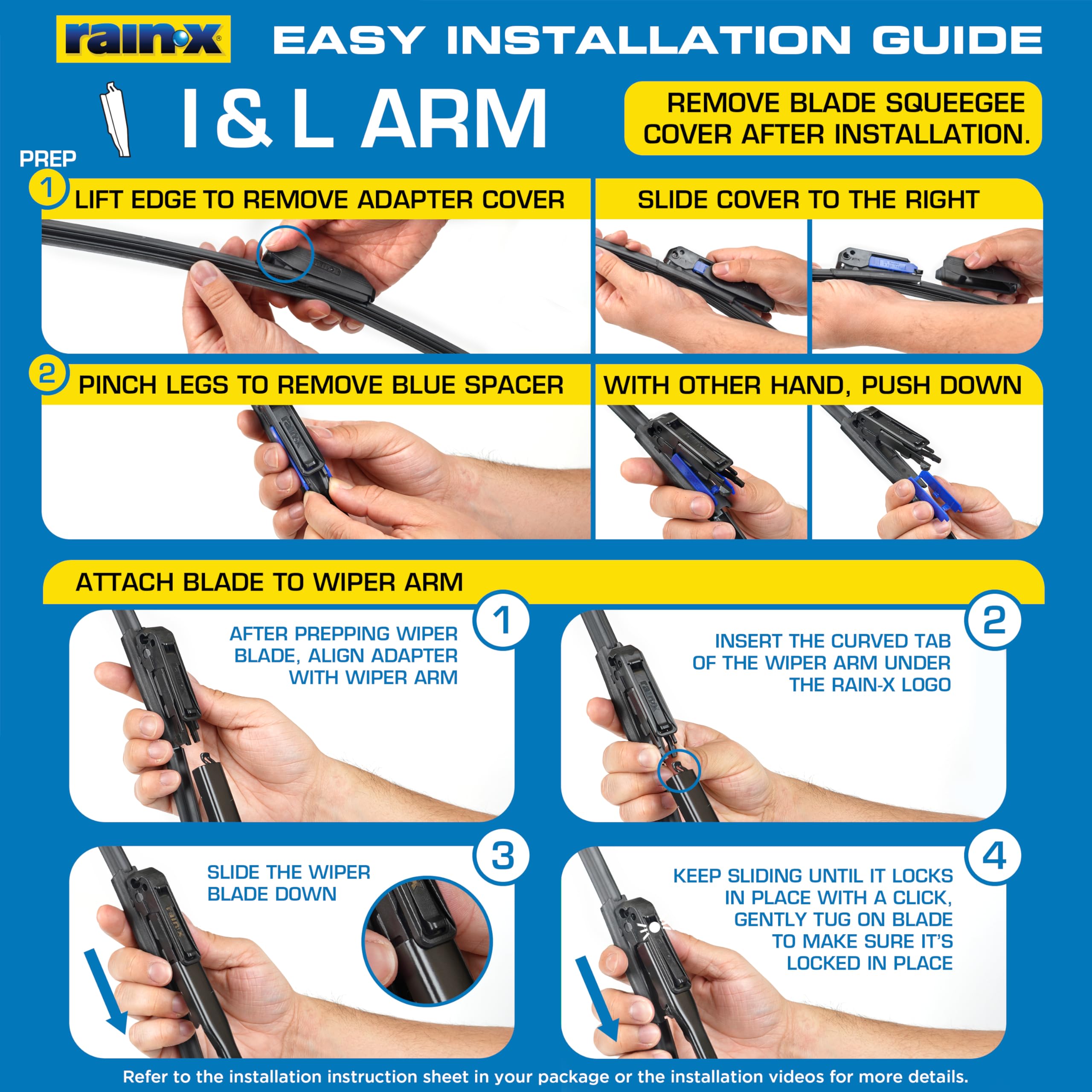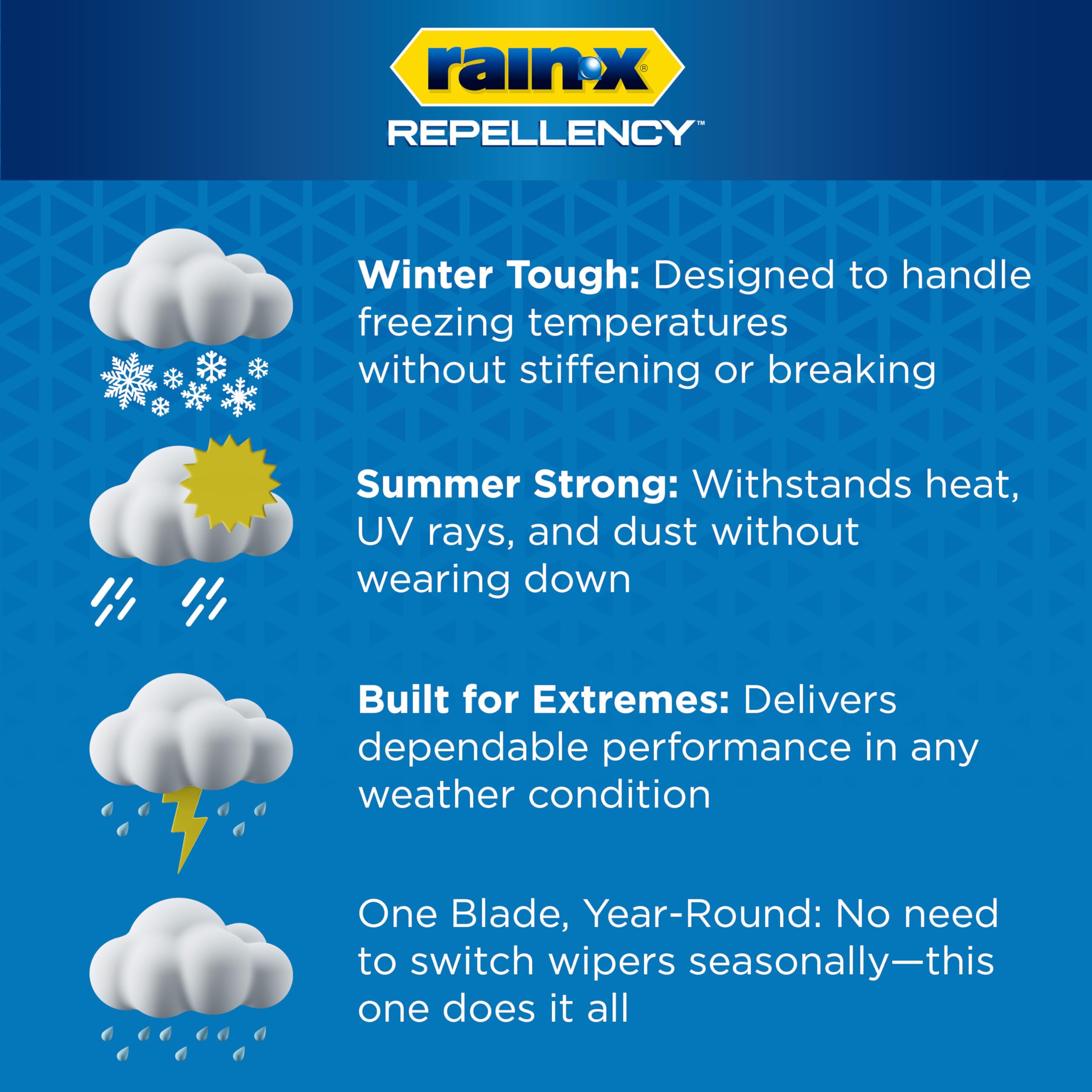 Experience clearer, safer driving in any weather with Rain-X Repellency Wiper Blades—the ultimate all-in-one solution for visibility and performance. Designed with patented Rain-X water repellent technology, these innovative blades go beyond ordinary wipers by actively treating your windshield as they clear. With each pass, they apply a proprietary water-repelling coating that causes rain, sleet, and snow to bead up and roll off—helping you maintain superior visibility through even the harshest conditions. This 2-in-1 blade is built with advanced beam blade technology, which ensures a smooth, streak-free wipe by distributing uniform pressure across the windshield. The flexible design conforms precisely to the curvature of your windshield, reducing missed spots and maximizing surface contact. Whether you're driving through a summer storm or winter sleet, you can count on a consistent, clean wipe every time. Installation is fast and stress-free thanks to the Rain-X universal adapter, which fits 96% of vehicles on the road today. Simply scan the QR code on the back of the package for quick access to helpful installation videos that walk you through each step with ease—no tools or hassle required. When it comes to durability, these blades are engineered to endure. From icy mornings to downpours and snowstorms, the Rain-X Repellency Wiper Blades deliver dependable, long-lasting performance. They’re built for all-season use, giving you the peace of mind that your windshield is protected year-round. Important: For optimal performance, be sure to remove the yellow squeegee cover after installation. This protective layer must be taken off to allow the blade to function properly and deliver the superior wipe quality Rain-X is known for. Upgrade your visibility, drive with confidence, and enjoy the unmatched benefits of a blade that not only clears—but protects. With Rain-X Repellency Wiper Blades, the road ahead has never been clearer.