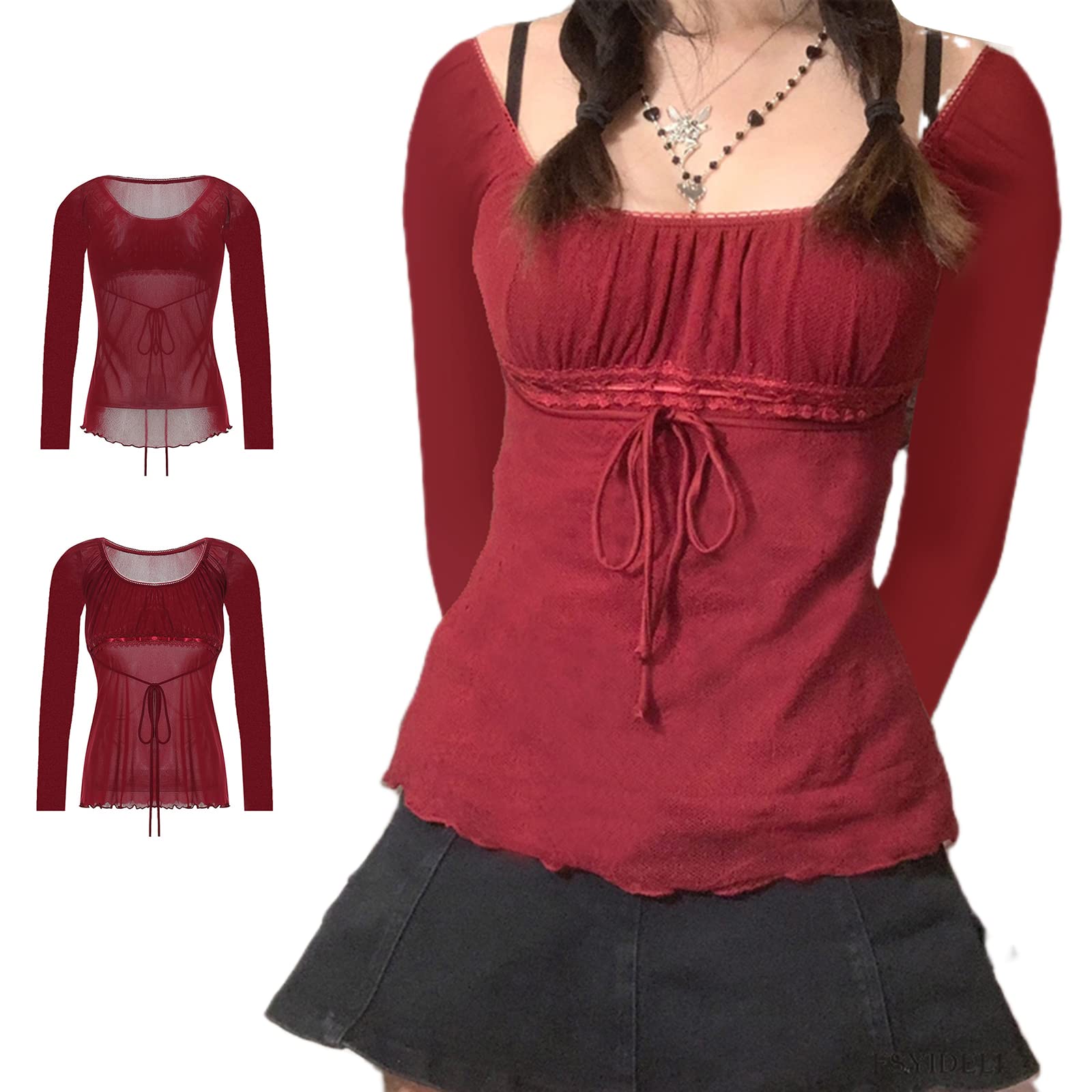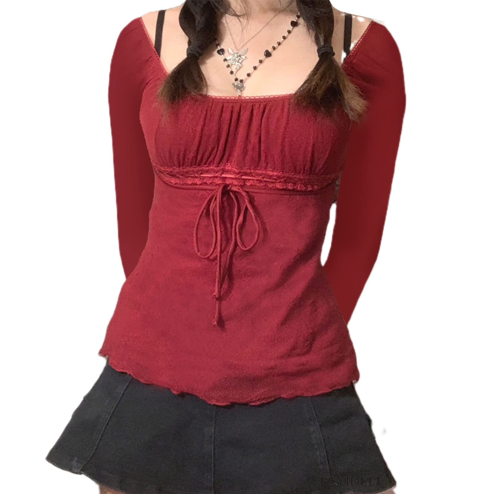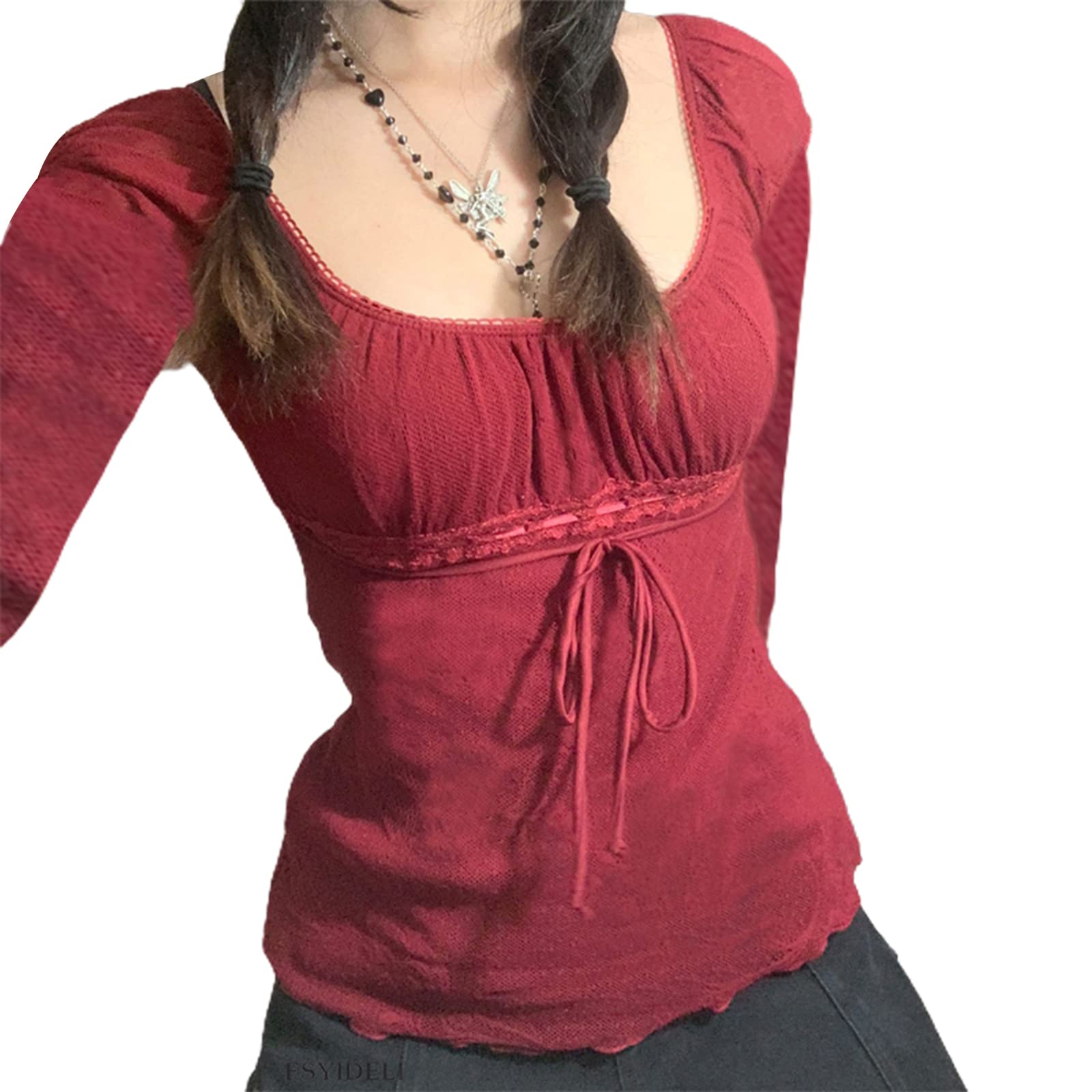 FEATURES: Women y2k tops fairy grunge shirts, long sleeve, solid color, lace trimmed square collar, ribbed knit, lace patchwork, slim fit blouse tops, tight shirts for women, ribbed y2k tops, y2k goth aesthetic clothing, trendy teens 90s egirl Harajuku gothic clothes fall streetwear.