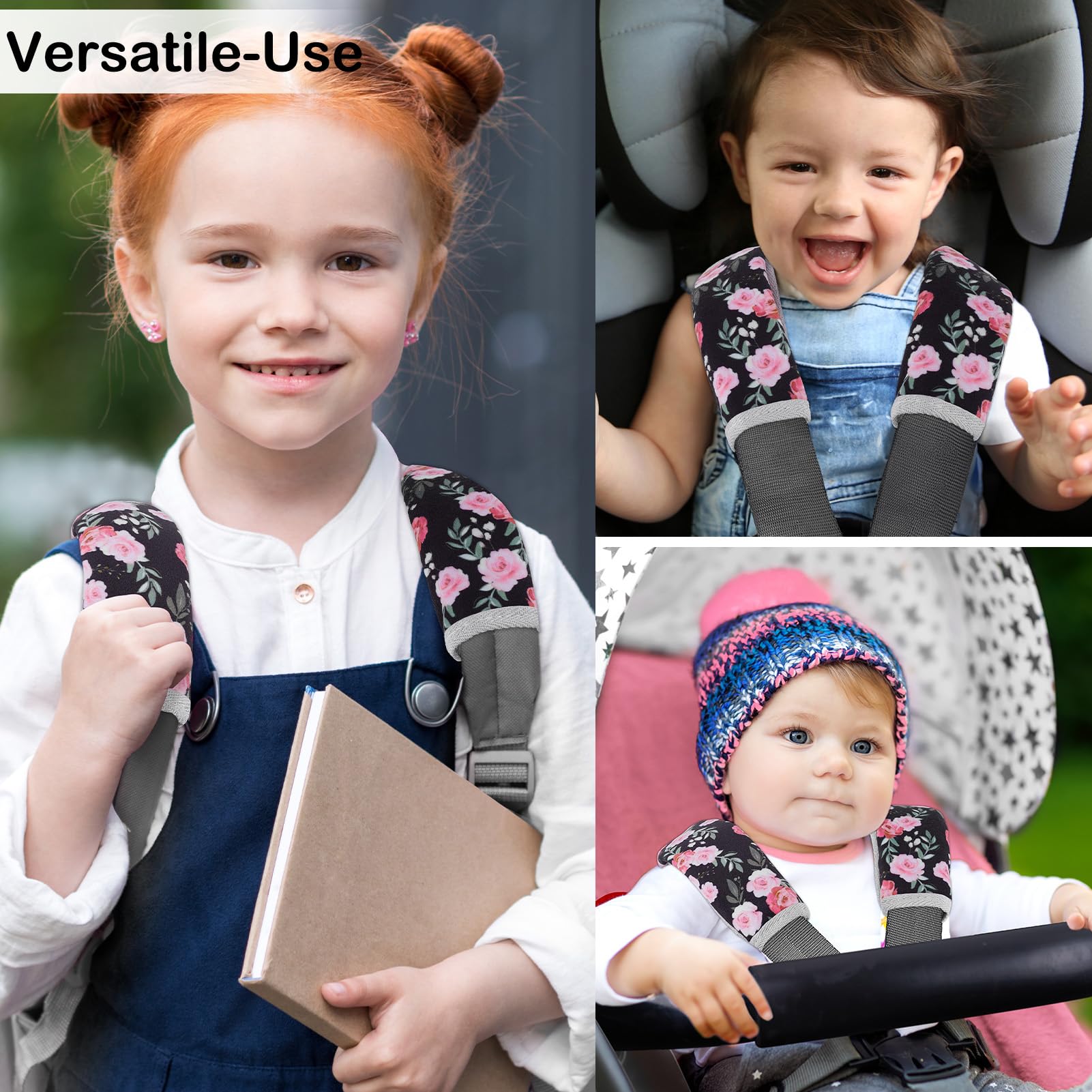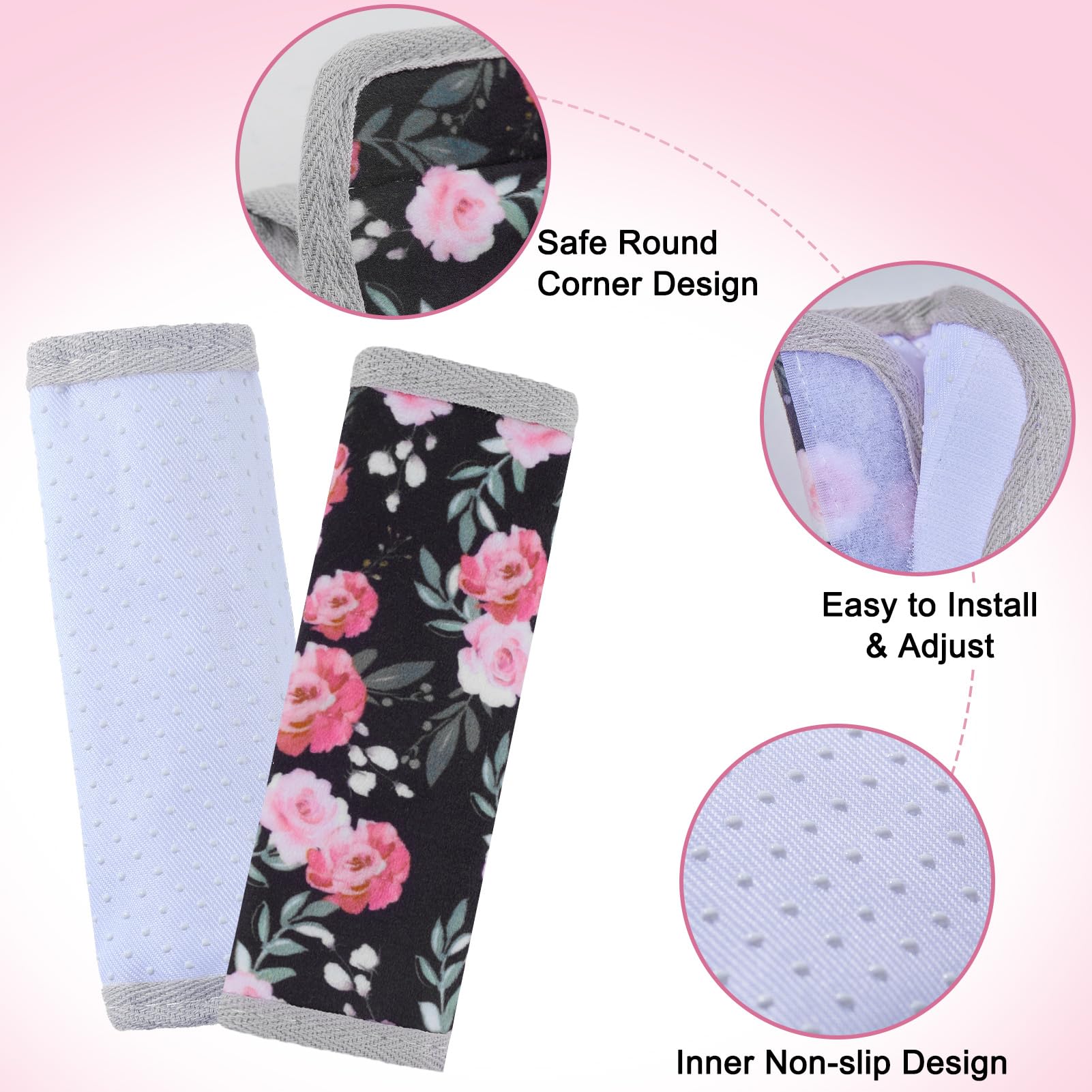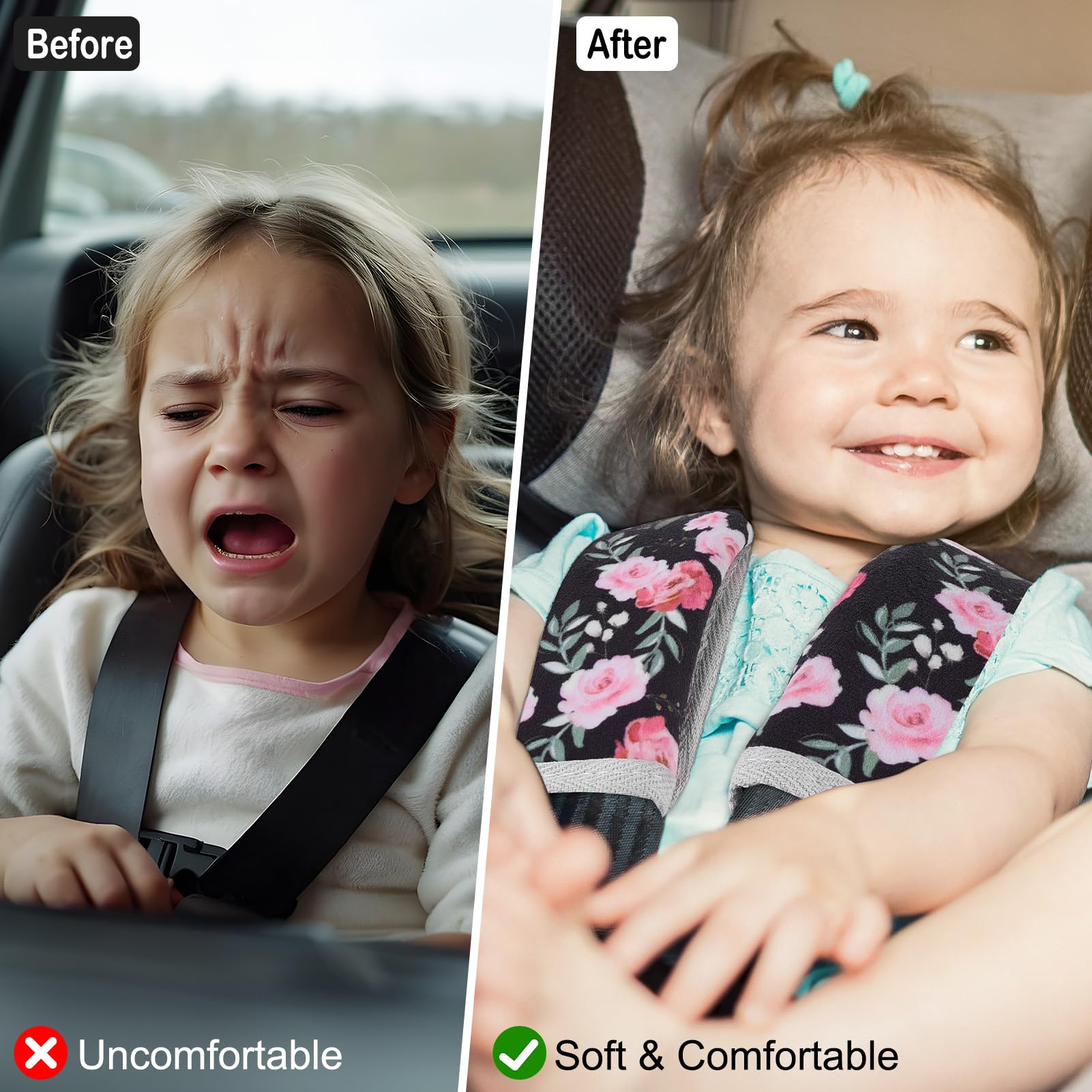 Universal Size & Anti-Slip: Our seatbelt covers for kids come in two sizes—small (5.9 × 2.6 inches) and large (9.4 × 6.3 inches)—specially designed for babies and kids, fit most car seats, strollers and pushchairs; The inside of the seat belt covers is an anti-slip design, keeping it in place with no sliding