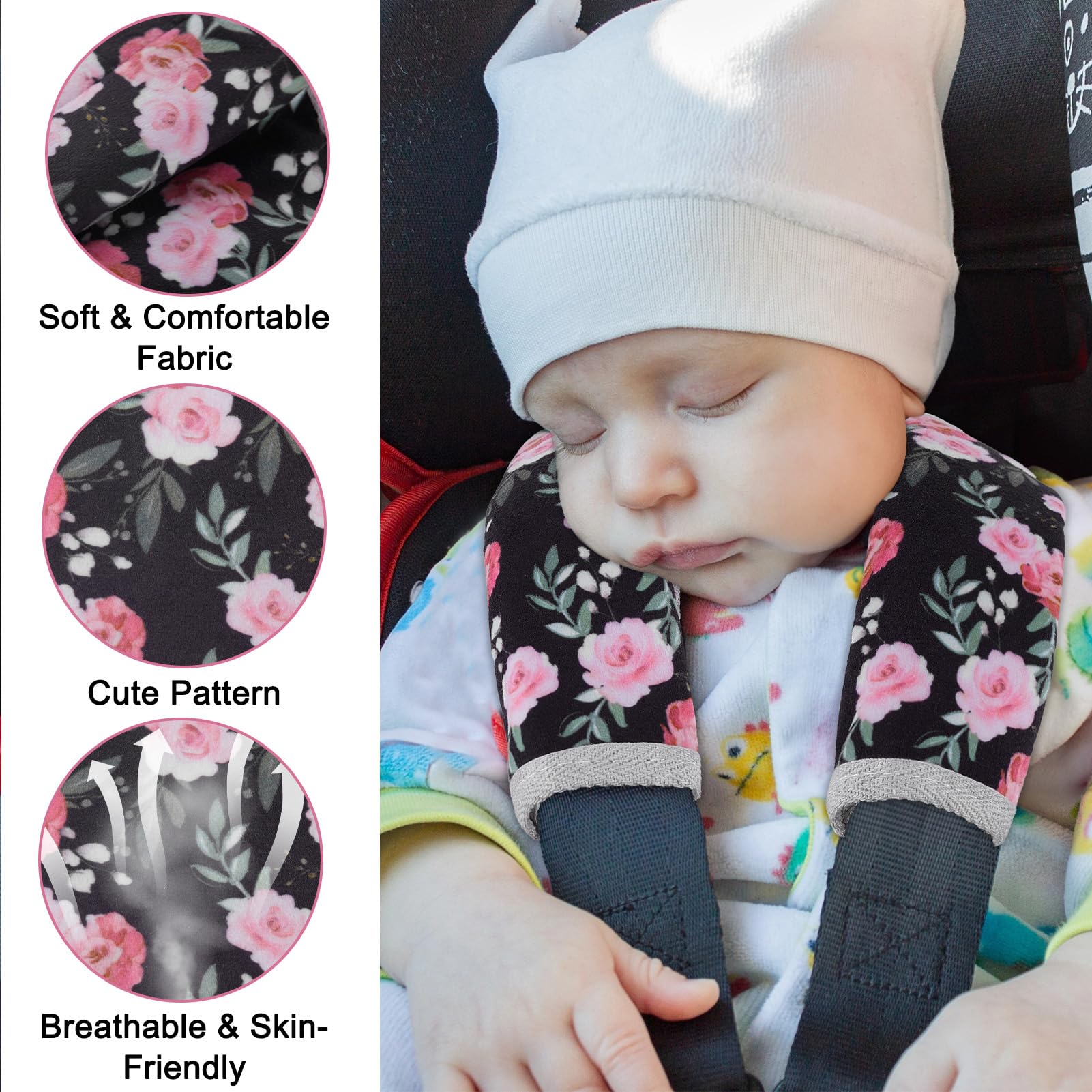 Soft & Comfortable Material: Our seat belt cover cushion for baby is made of soft and breathable fabric, it can protect baby's skin from being scratched by the seat belt; This seat belt cover with cute pattern and bright colors will make your kids happy