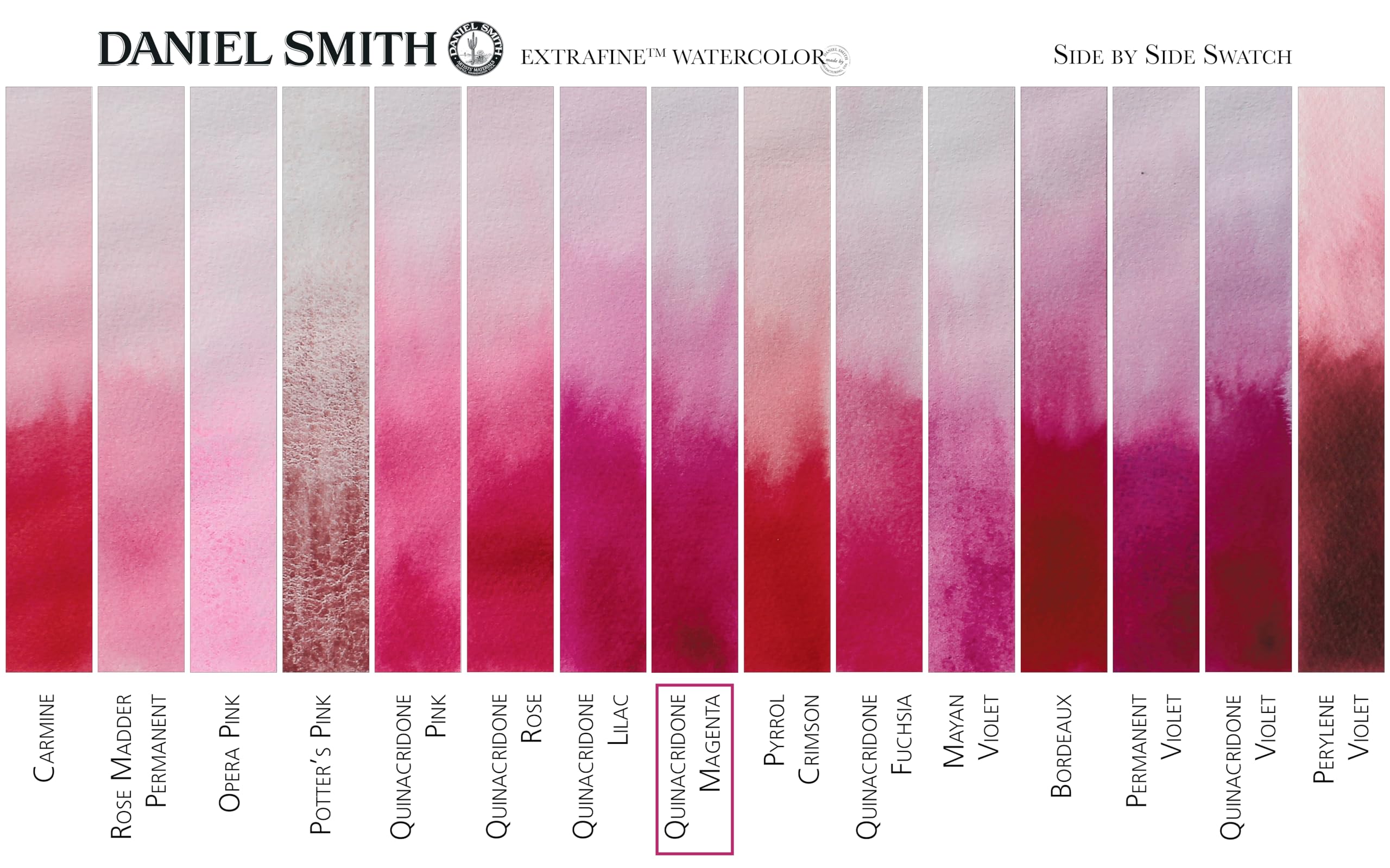 This deep red violet disperses evenly and moves from deep darks to clear, glowing washes. Like all Quinacridone, it is an extremely lightfast organic pigment. In terms of complementary couples Quinacridone Magenta works especially well with yellow greens. Highly durable and extremely transparent, all the DANIEL SMITH Quinacridone colors excel in vivid clarity and intensity.