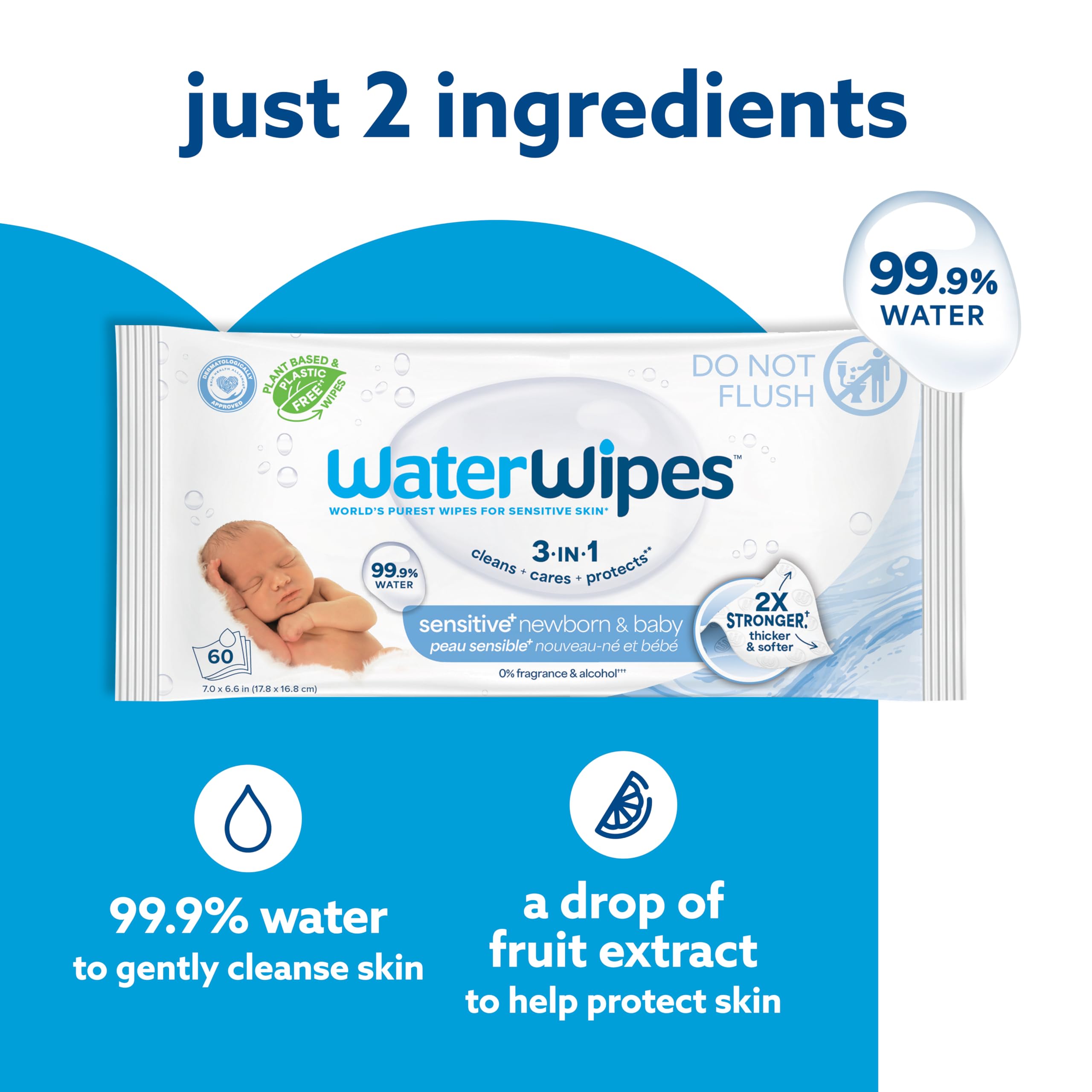 EVERYDAY CARE WITH GENTLE INGREDIENTS: Made with 99.9% purified water and a drop of fruit extract, WaterWipes baby wipes are ideal for daily messes. Their neutral pH makes them ideal for refreshing sensitive skin without irritation.