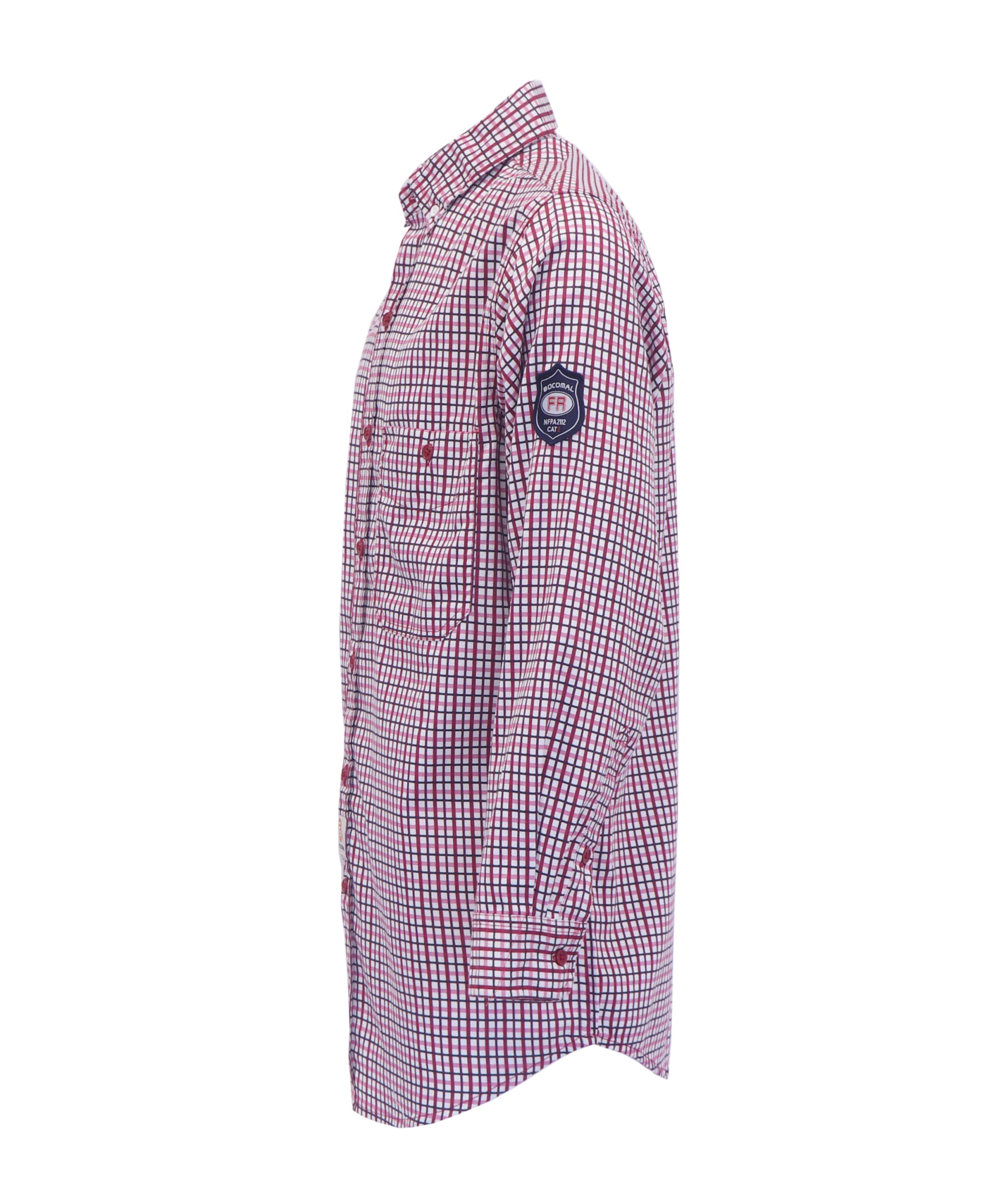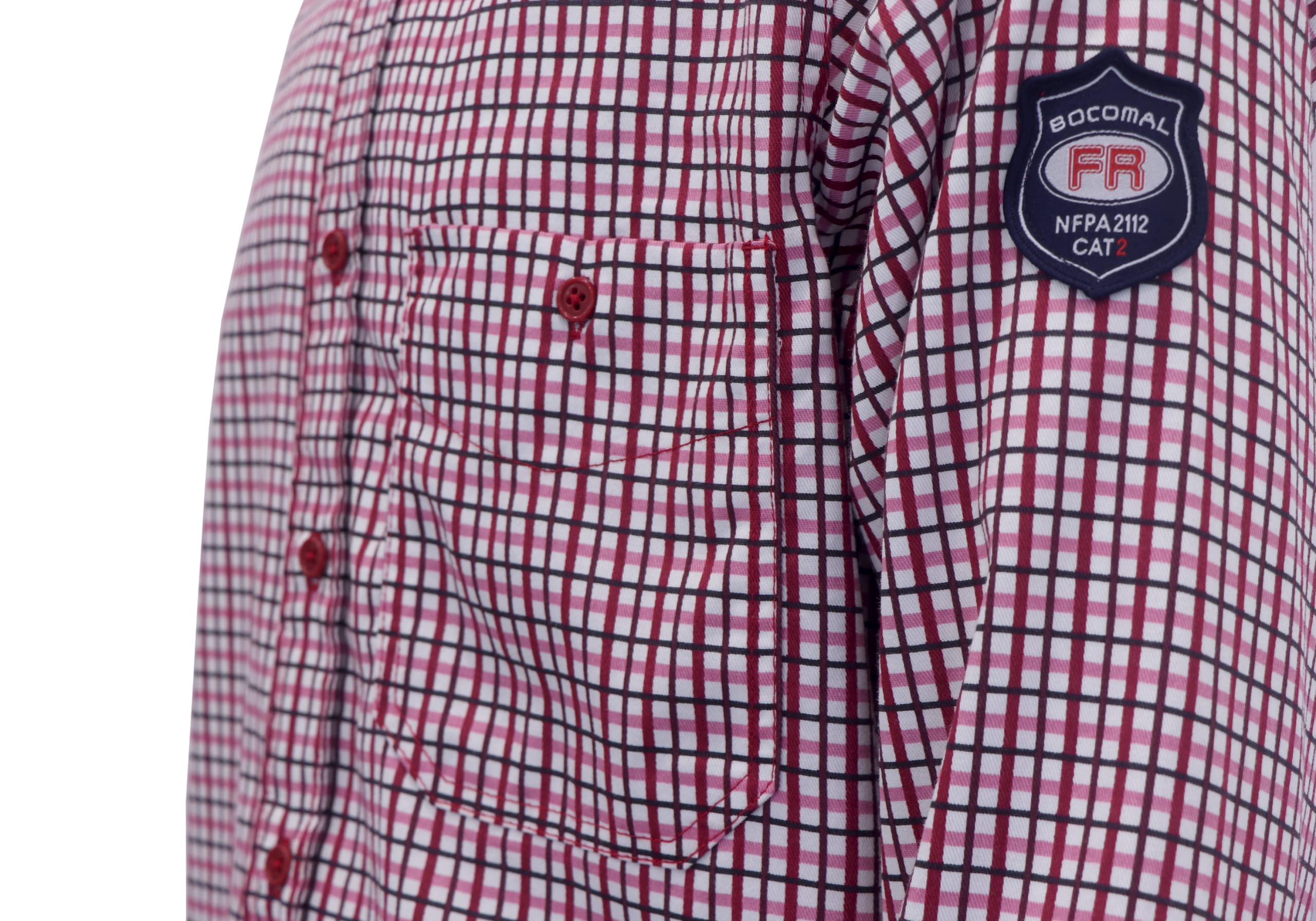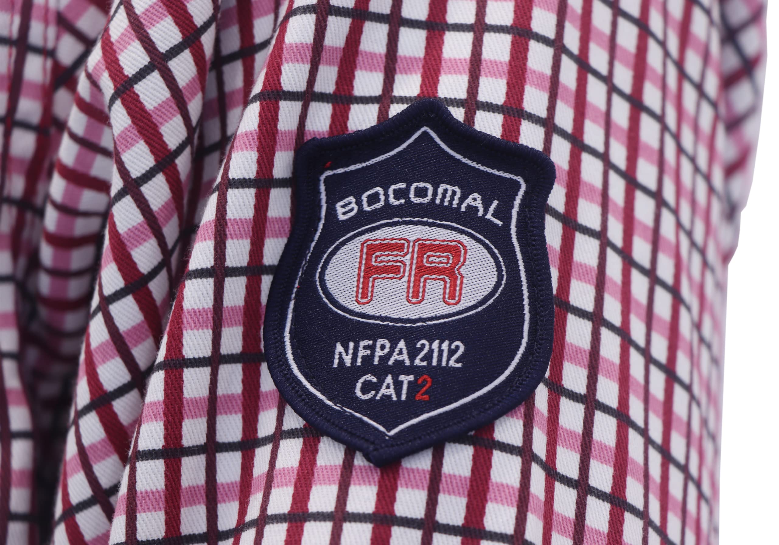 FR MATRIALS:6.5OZ Printed Plaid Cotton Twill FR Treated,FR Buttons,FR Sewing Threads!Clear FR Tag on arms and bottom front.More FR info On Tag About UL Certification.