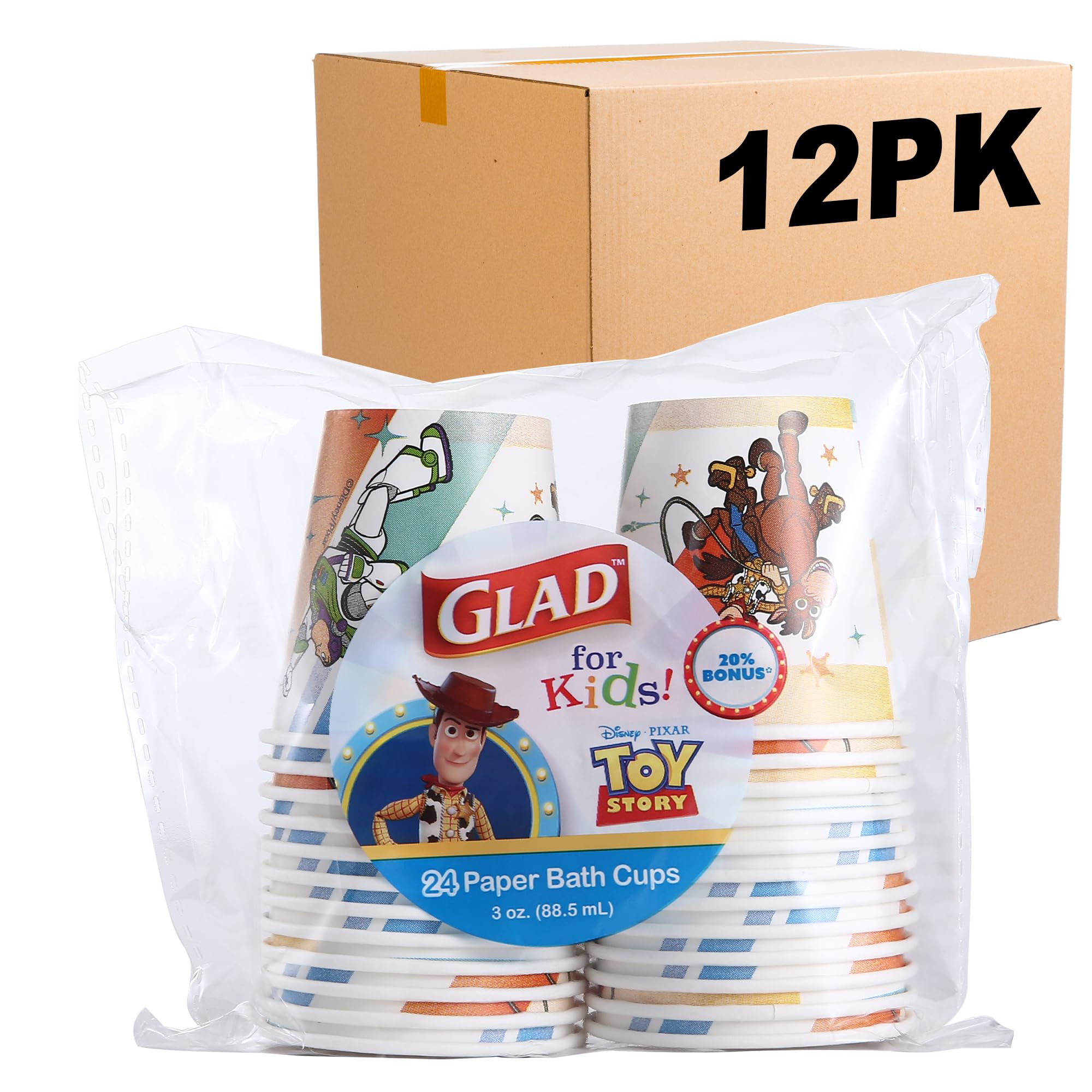 Glad for Kids believes in bringing a little fun to your everyday routine! So, when it’s time to rinse and swish, why not invite your family’s favorite characters and colors to the sink? Disney Pixar Toy Story Mini Paper Bathroom Cups are the perfect kid-friendly size, measuring just 2.25 inches tall and holding 3 ounces of fluid. And because they’re from Glad for Kids, parents can trust that they are soak-proof and sturdy. Each pack contains 24 mini paper cups adorned with vibrant designs and characters of Disney Pixar Toy Story, bringing a touch of fun to every rinse. These bathroom paper cups are specifically designed for rinsing the mouth after brushing teeth or using mouthwash. Made for daily use, they're disposable for effortless cleanup, ensuring a hygienic experience every time. Not just for daily use, these mouth rinse cups are also perfect for parties or any occasion where a sprinkle of fun is desired. Make oral hygiene fun and captivating for your child with Disney Pixar Toy Story Mouth Rinse Cups. Whether for daily use or special occasions, these mini paper cups add charm and convenience to every rinse.