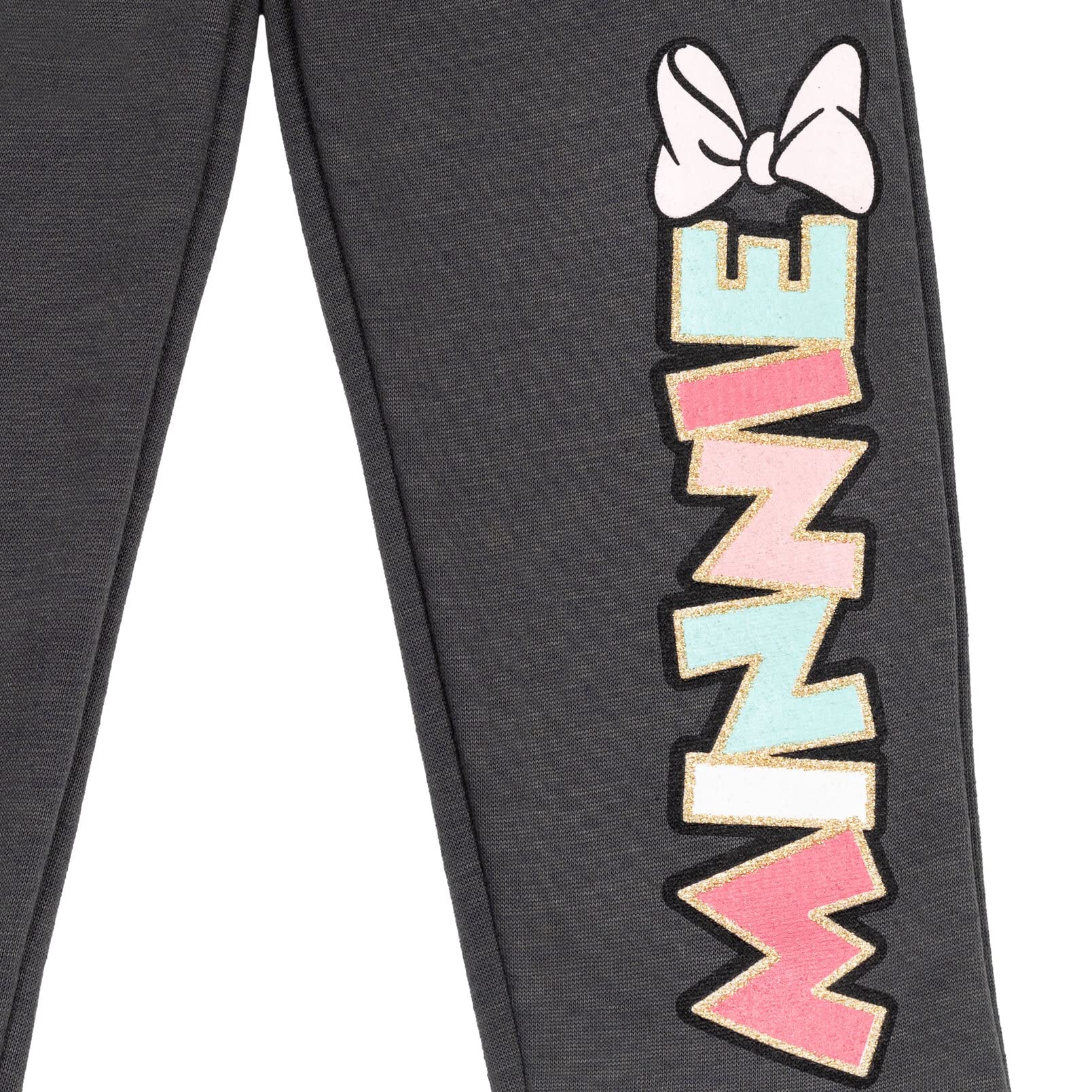 Awesome gold glitter screen print design featuring Minnie Mouse smiling with pink, blue and polka dot bows stacked on her head on top and her name in its classic cartoon font on pant leg