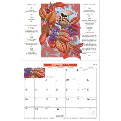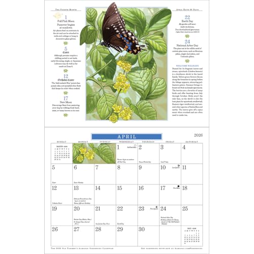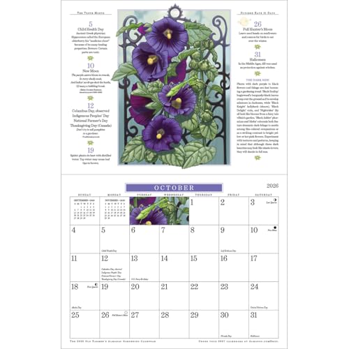For 49 years (!), gardeners and nature-lovers have been thrilled with this best-selling wall calendar—and for good reason! Its gorgeous, original artwork will perk up your wall all year, so that even when you can’t enjoy the outdoors, a little of its beauty stays right there with you. Each month features an illustration of an edible or ornamental accompanied by expanded captions that include growing guidance and fun facts about the plant shown. For 2026, topics include . . . Eye-catching carnations Cheerful, peppery nasturtiums Butterfly-friendly spicebush Deliciously large strawberries Flower-studded calibrachoas Heirloom eggplant varieties and more! Of course, it wouldn’t be from The Old Farmer’s Almanac if it didn’t give you a table of the best times for planting (36 vegetables and grains!) based on frost dates and Moon phases, plus gardening/weather proverbs, plant fun facts, insightful quotes, and gardening secrets for the entire year. Features also include . . . Major U.S. and Canadian holidays and celebrations Moon phases (new, quarters, full), including traditional full-phase names like Full Strawberry Moon and Full Harvest Moon Solar and lunar eclipses Previous and next month grids on each month’s calendar page for easy reference 2026 and 2027 year-at-a-glance calendars for preplanning Convenient size that will fit almost anywhere: 10-7/8"W x 8-3/8"H; opens to 10-7/8"W x 16-3/4"H Whether you love gardening or delight in the wonder of nature (or both!), this calendar is sure to make you smile. Want more? Also enjoy these other fine 2026 calendars from The Old Farmer’s Almanac: Moon, Weather, Country, Everyday (page-per-day), and Planner.