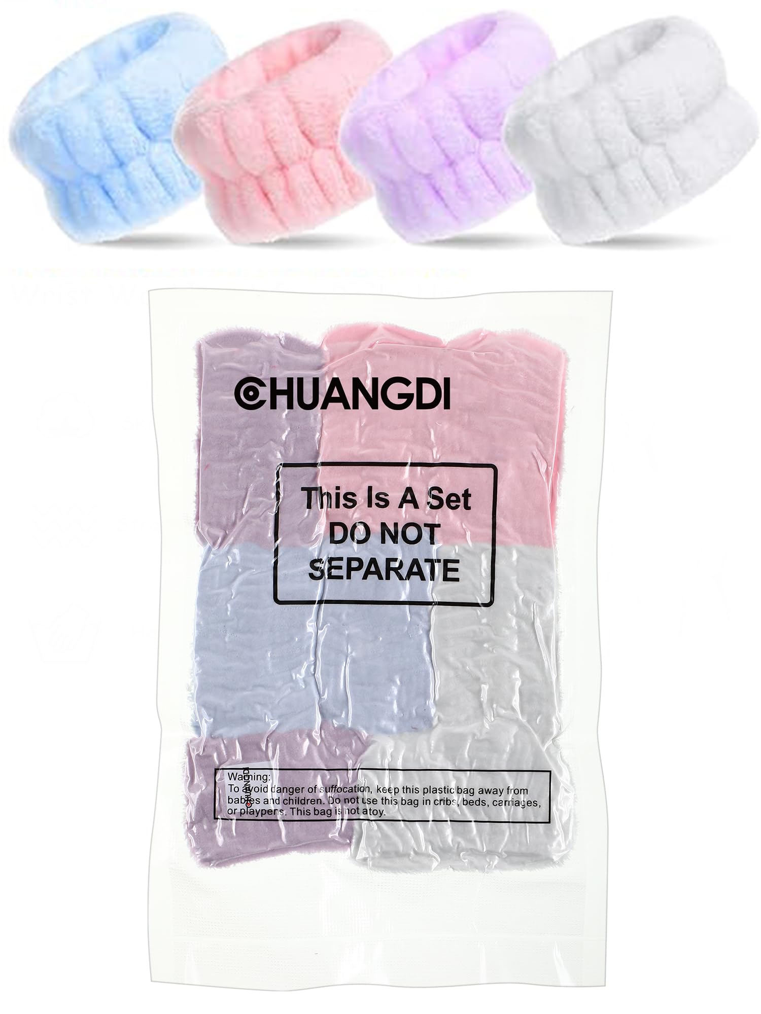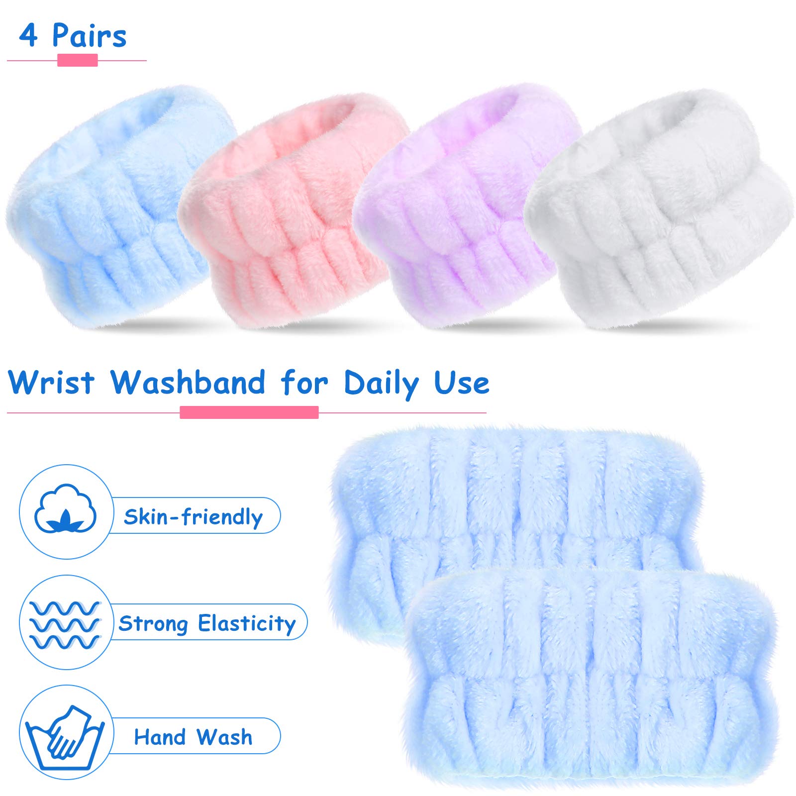 Wrist spa wash band set: there are 4 pairs of microfiber wristbands in different colors, you can wear these cleansing cuffs in line with your headband to reduce and prevent liquid from spreading and spilling down to your arms when washing