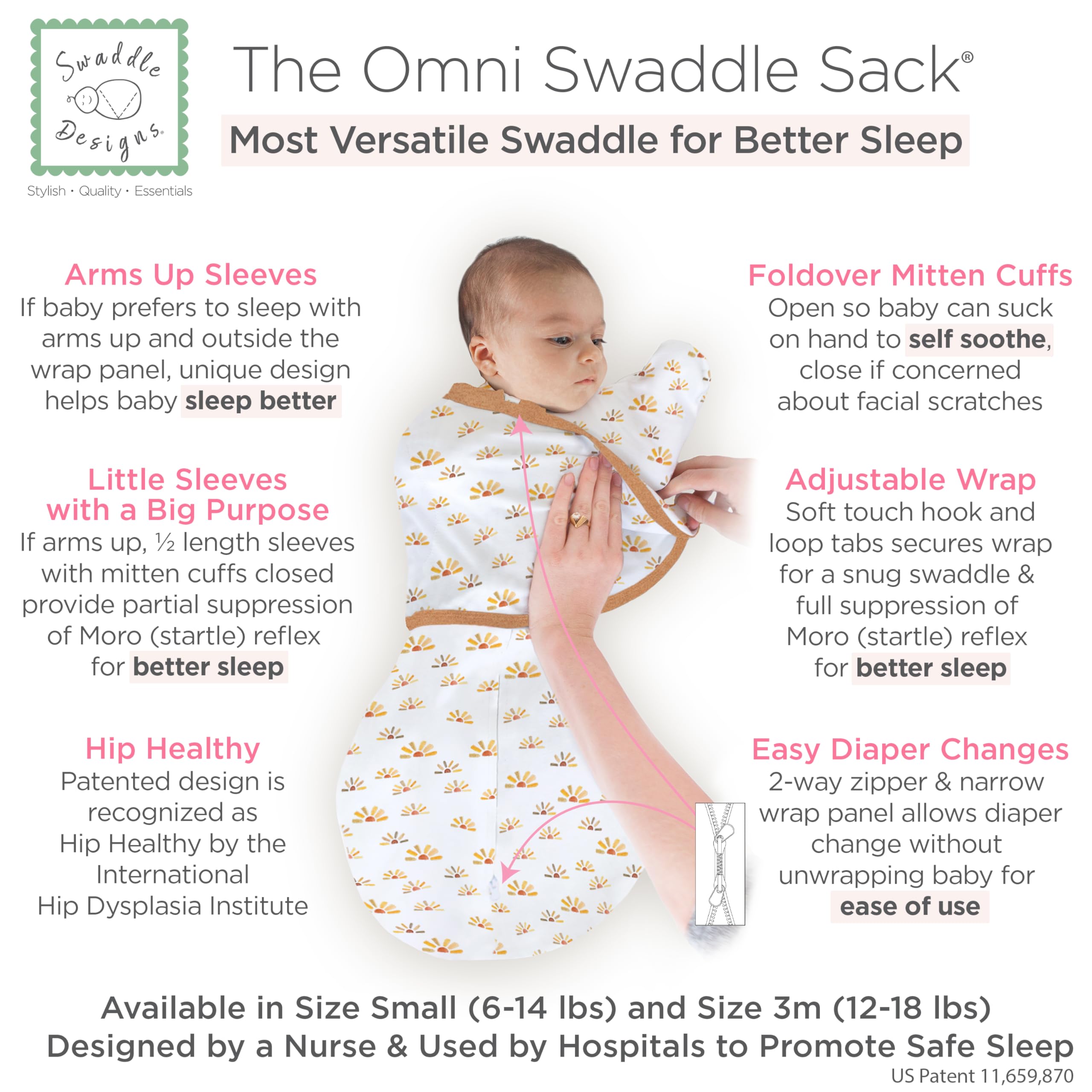 Description The 6-way Omni Swaddle Sack with Adjustable Wrap and uniquely shaped 1/2 length sleeves with mitten cuffs is the ideal swaddle designed by a nurse. The ergonomic and convertible design supports more natural hand and arm positions, and provides parents with more options when preparing baby for safe sleep. The design allows parents to swaddle with (1) arms on chest under the wrap (2) one or both hands up, and (3) both arms up and out from under the wrap. The sleeves with mitten cuffs keep baby's arms warm. Foldover mitten cuffs may be worn open or closed, parents can open the cuffs, so baby can self-soothe by sucking on hands or close the cuffs to protect baby from facial scratches. Many experts recommend parents to swaddle baby with hands within reach of mouth, so baby can self-soothe. Babies who can self-soothe sleep longer and better. When baby is swaddled with hands up or arms up, baby can self-soothe by sucking on hands. The ergonomic, patented design with 2-way zipper is easy to use. The adjustable wrap is narrow and does not interfere with baby's hips and the soft hook-and-loop fasteners make it easy to swaddle baby. The 2-way zipper allows parents to unzip from the foot to check baby's diaper without unwrapping the swaddle. The 2-way zipper makes it easy to place baby in the sack by unzipping from the top. Size Small 6-14 lbs, 0-3m. Size 3m 12-18 lbs for bigger baby. When baby shows signs of attempting to rollover, the AAP recommends that parents stop restraining baby's arms with a swaddle or wrap. Parents can use the Omni as a transition swaddle with arms up and wrap secured around tummy and chest. When baby outgrows the Omni Swaddle Sack, we recommend a SwaddleDesigns Transitional Swaddle Sack® or a zzZipMe Sleeping Sack wearable blanket. Super soft, premium cotton knit is breathable, stretchy, and natural. 100% Cotton. Machine wash. Tumble dry. US Patents 11,659,870 & D924,539. Int’l patents EU, UK, Canada and others online