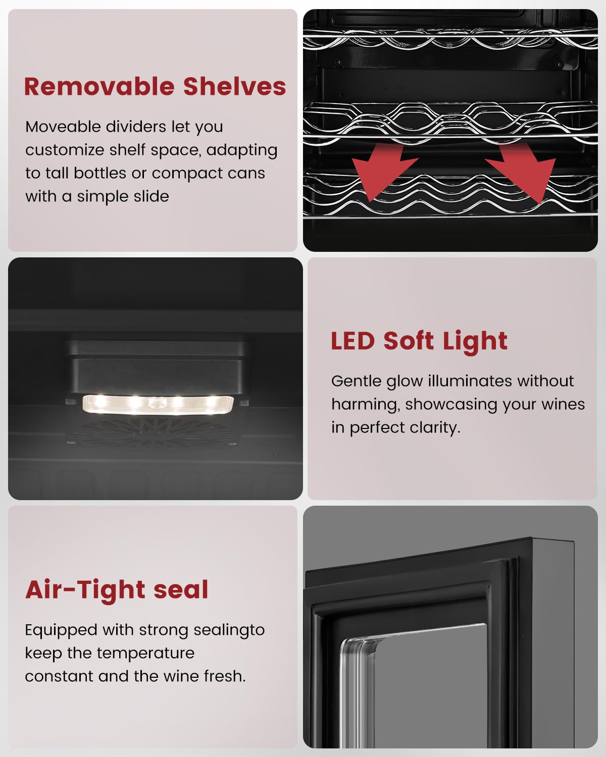 Powerful & Quiet Performance: Operating at less than 38 dB, this wine and beer fridge is quieter than most traditional mini wine coolers, making it ideal for bedrooms and shared spaces. Its high-efficiency compressor consumes minimal power, providing a cost-effective solution for wine enthusiasts and beverage lovers alike.