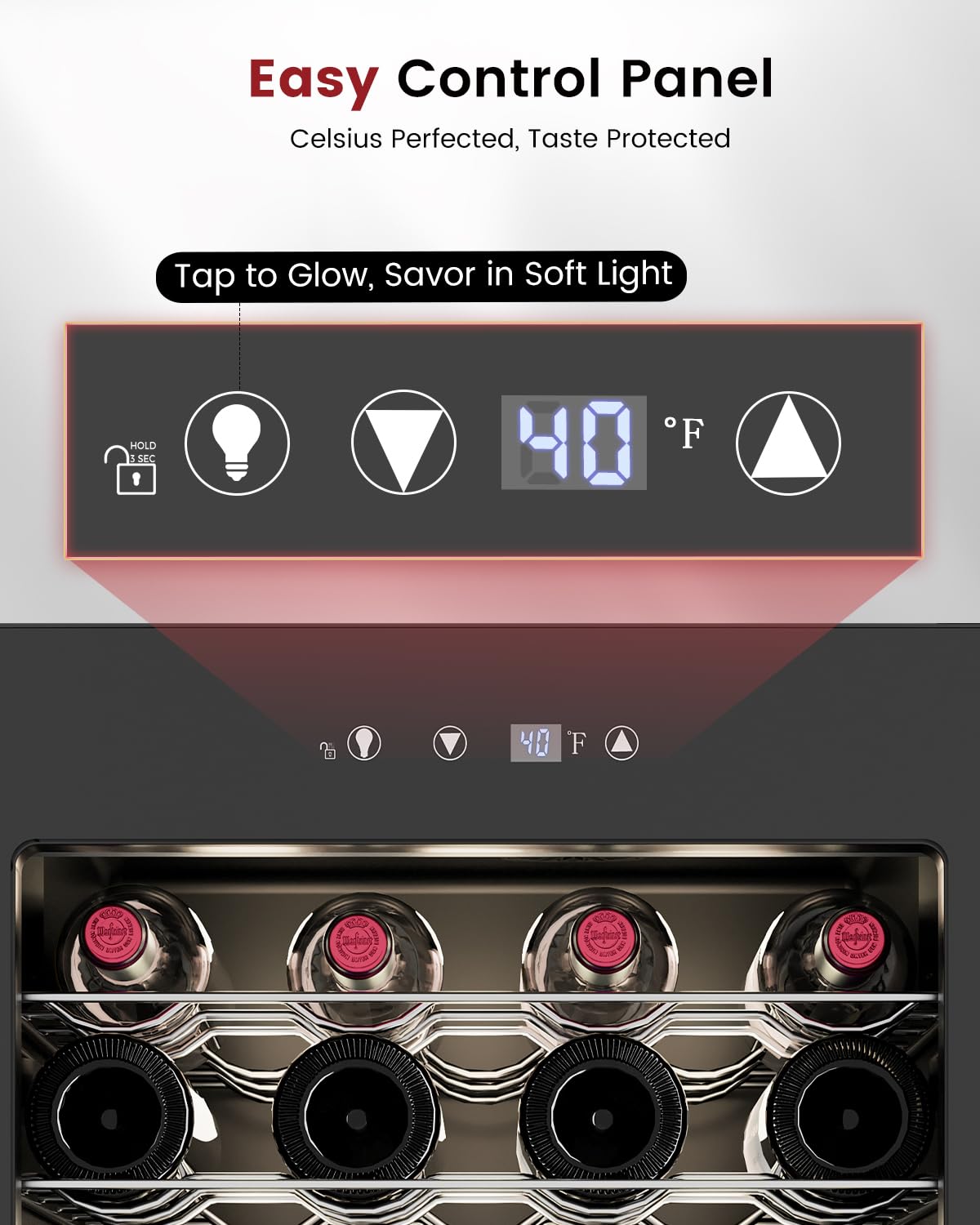 Precision Cooling with Easy Touch Control : Easily adjust the temperature of this wine cooler refrigerator using its ▲/▼ button control. With a range from 40°F to 61°F, this small wine fridge ensures your wines, beers, and sodas are served at the perfect temperature. The LED light (Simply push the pad) makes it easy to find your favorite beverage even in low-light settings.
