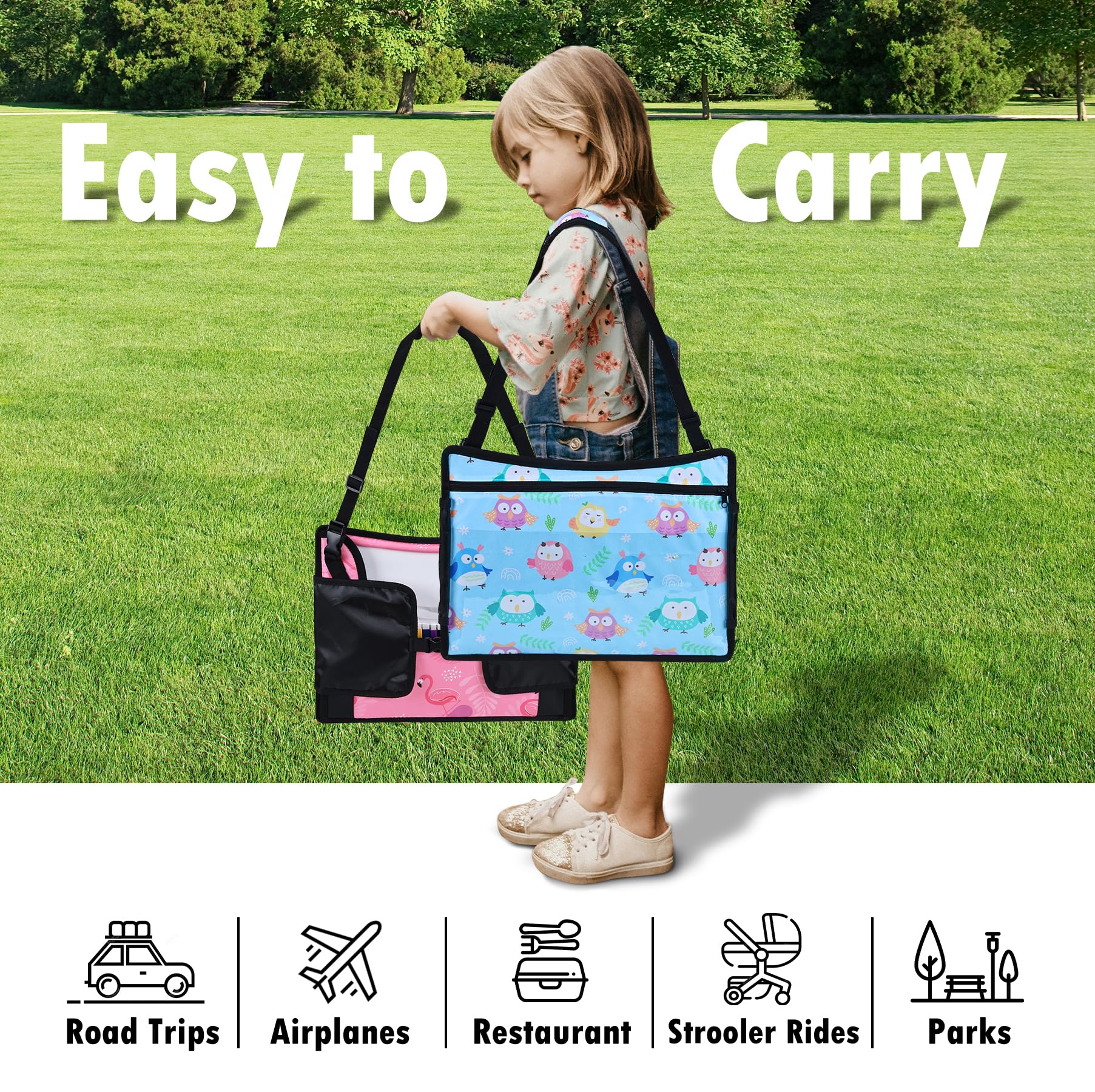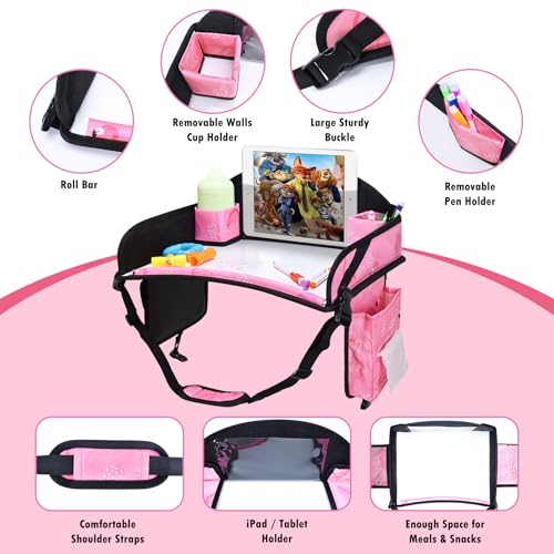 Multi-Function Travel Tray For Kids Car Seat: Multiple mesh storage pockets keep your child’s toys, snacks and water bottle organized and within reach. The dual-purpose adjustable strap secures toddler travel tray in place and be used as a convenient carrying strap for travel