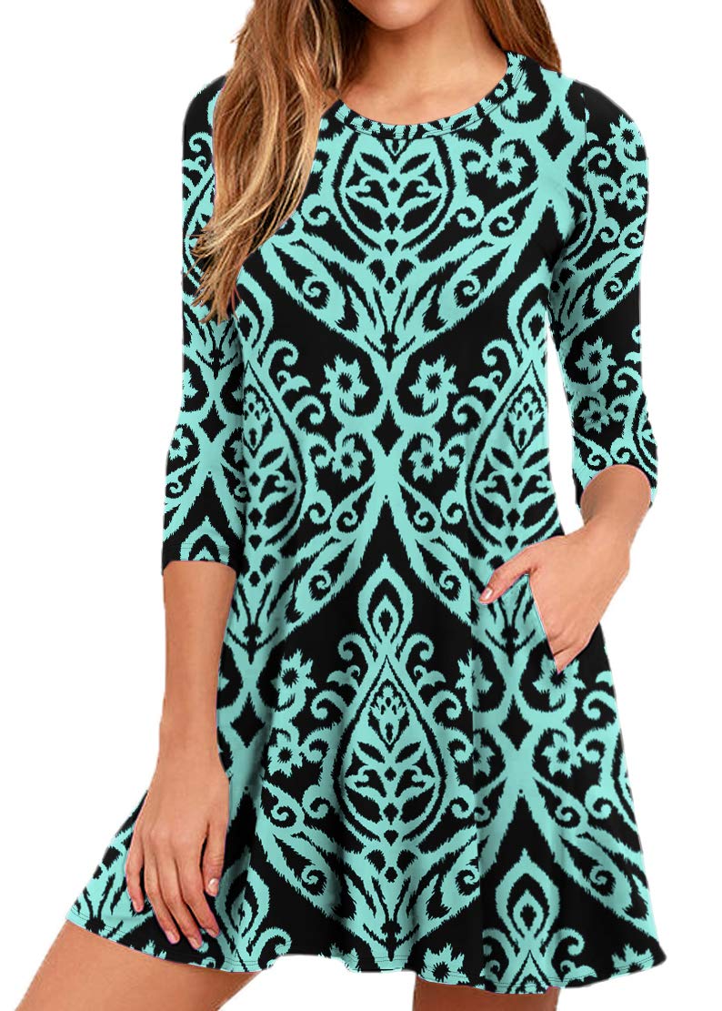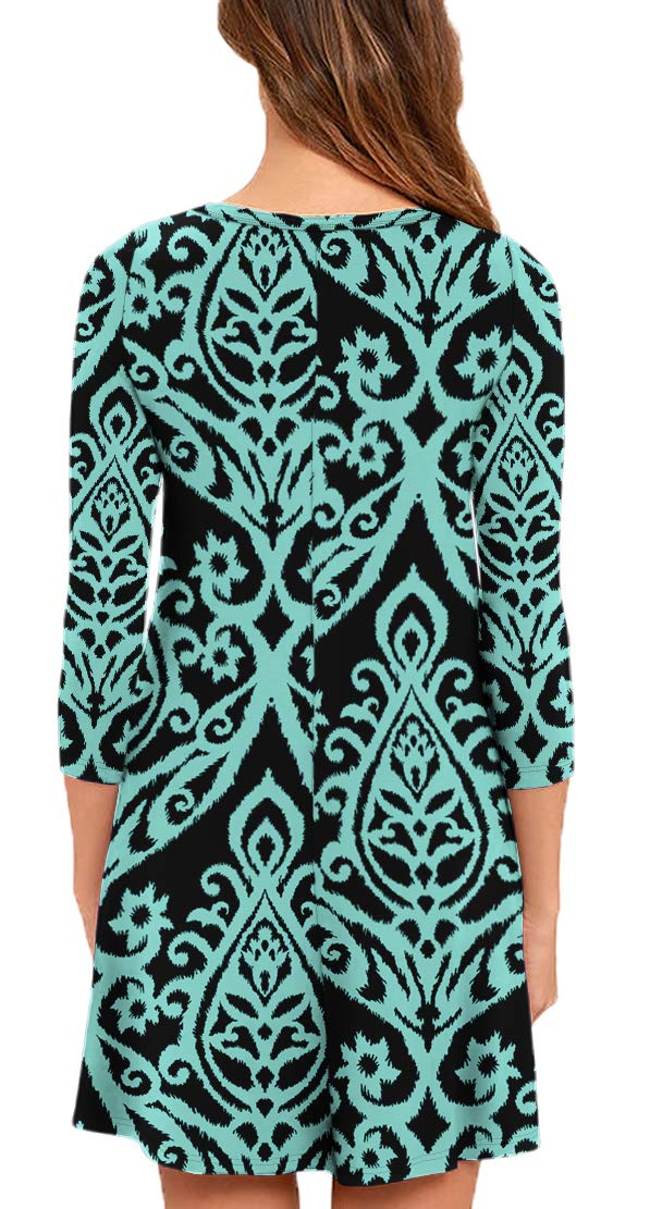 Features: casual basic style, A-line silhouette, 3/4 sleeves/sleeveless ,round neck, super soft.the casual dresses is above the knees and long enough that you wouldn't need to wear leggings with it if you didn't want too.It's a swing style so it would fit comofrtably over large hips.the pockets are such a nice addition,it's loose enough but not baggy.