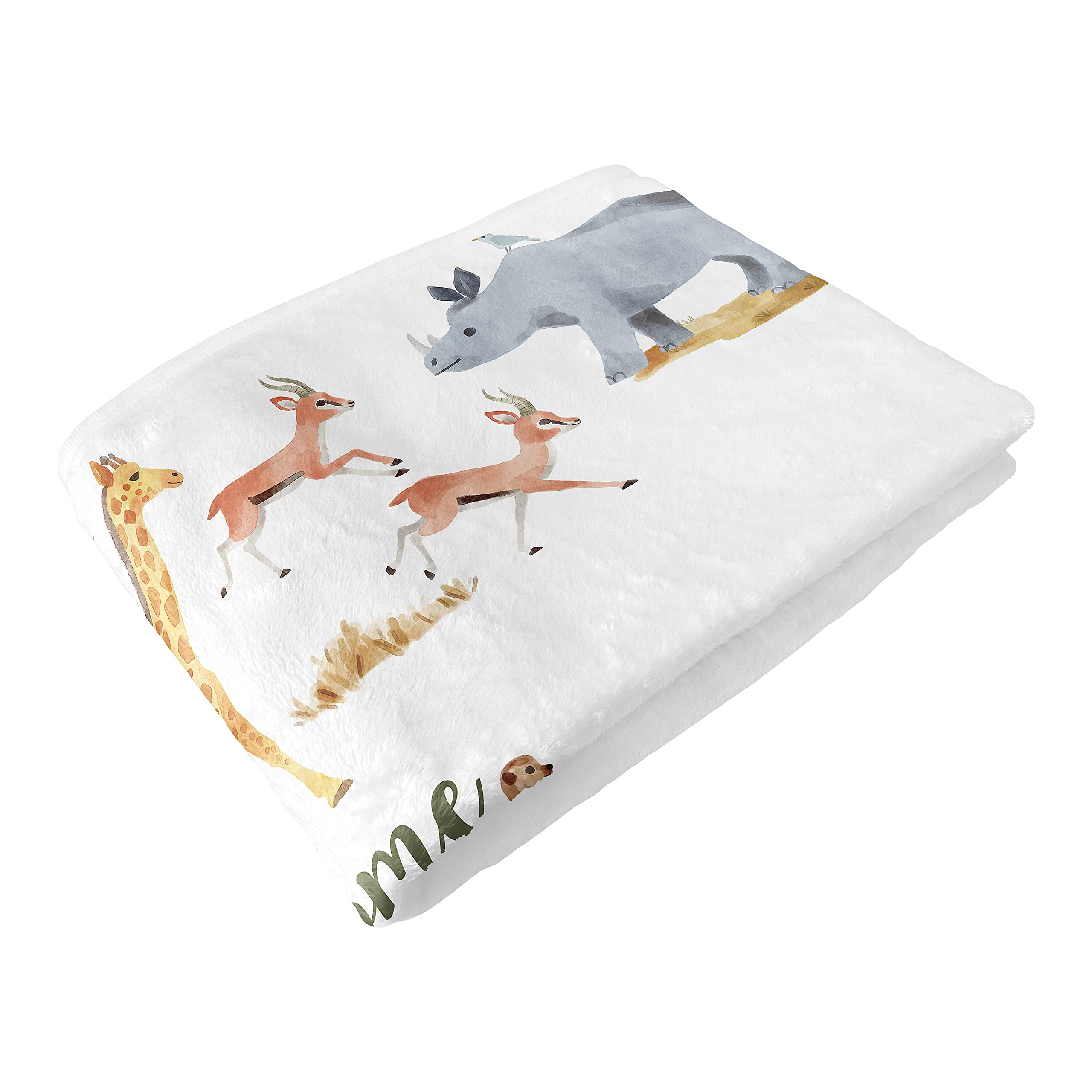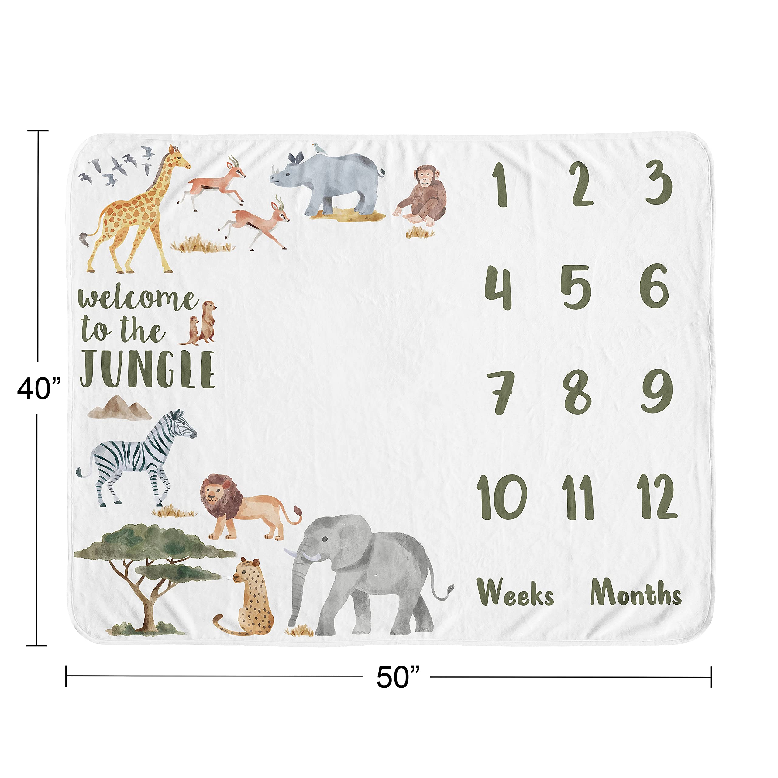 100% plush minky fleece featuring a multicolor watercolor jungle animals with an inspirational "Welcome to the Jungle" quote.