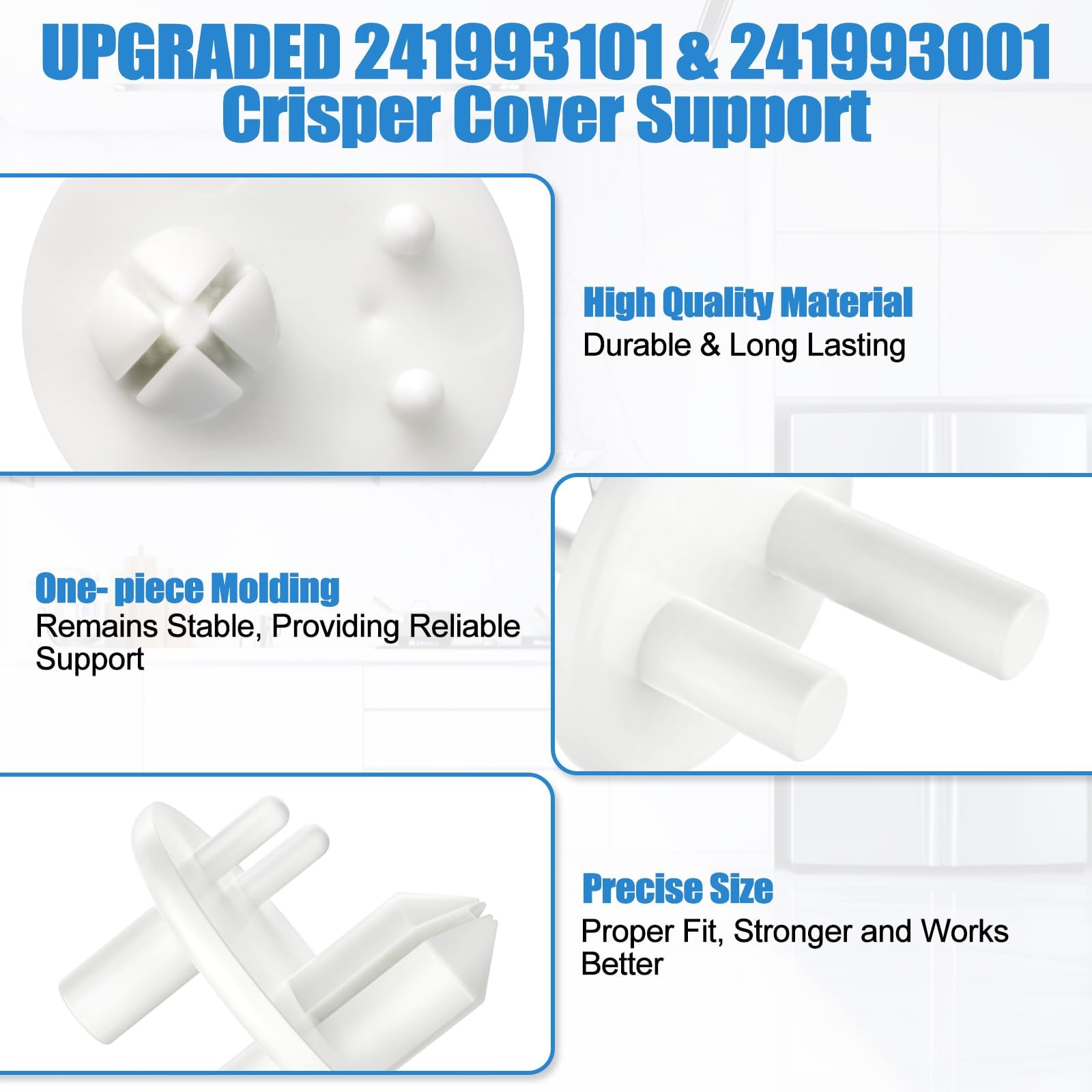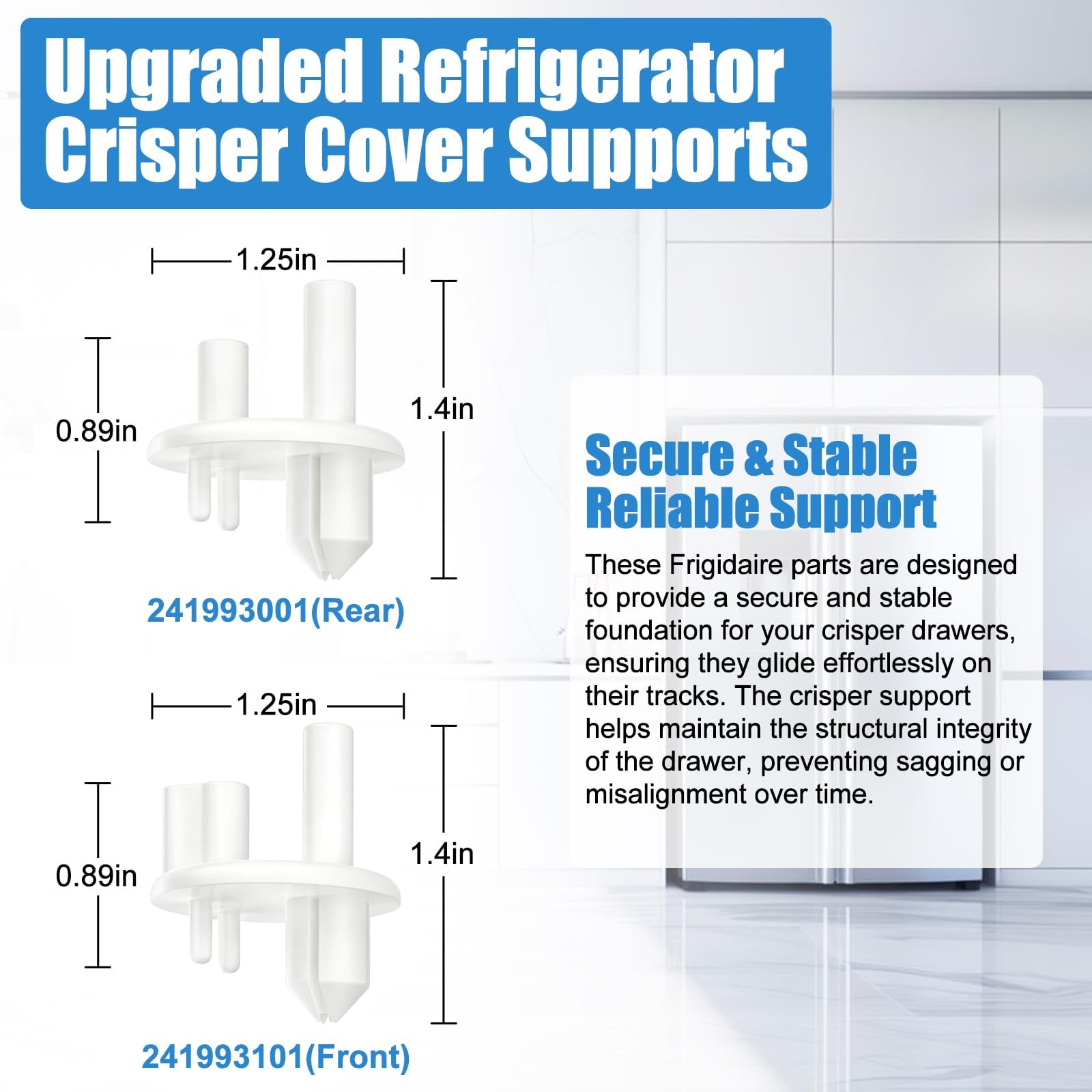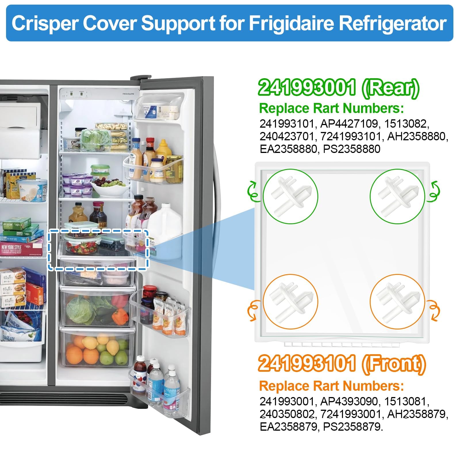 【NOTICE-PLEASE READ】241993101 crisper cover support that is Front Crisper Cover Support and 241993001 crisper support is Rear Crisper Cover Support for Frigidaire refrigerator parts. Fix Symptoms: 1. The crisper cover sagging or failing to stay in place;2. Difficulty sliding the crisper drawers in and out ;3.Noticeable instability or wobbling of the cover; 4. Crisper Support frigidaire parts Cracks or breakage.