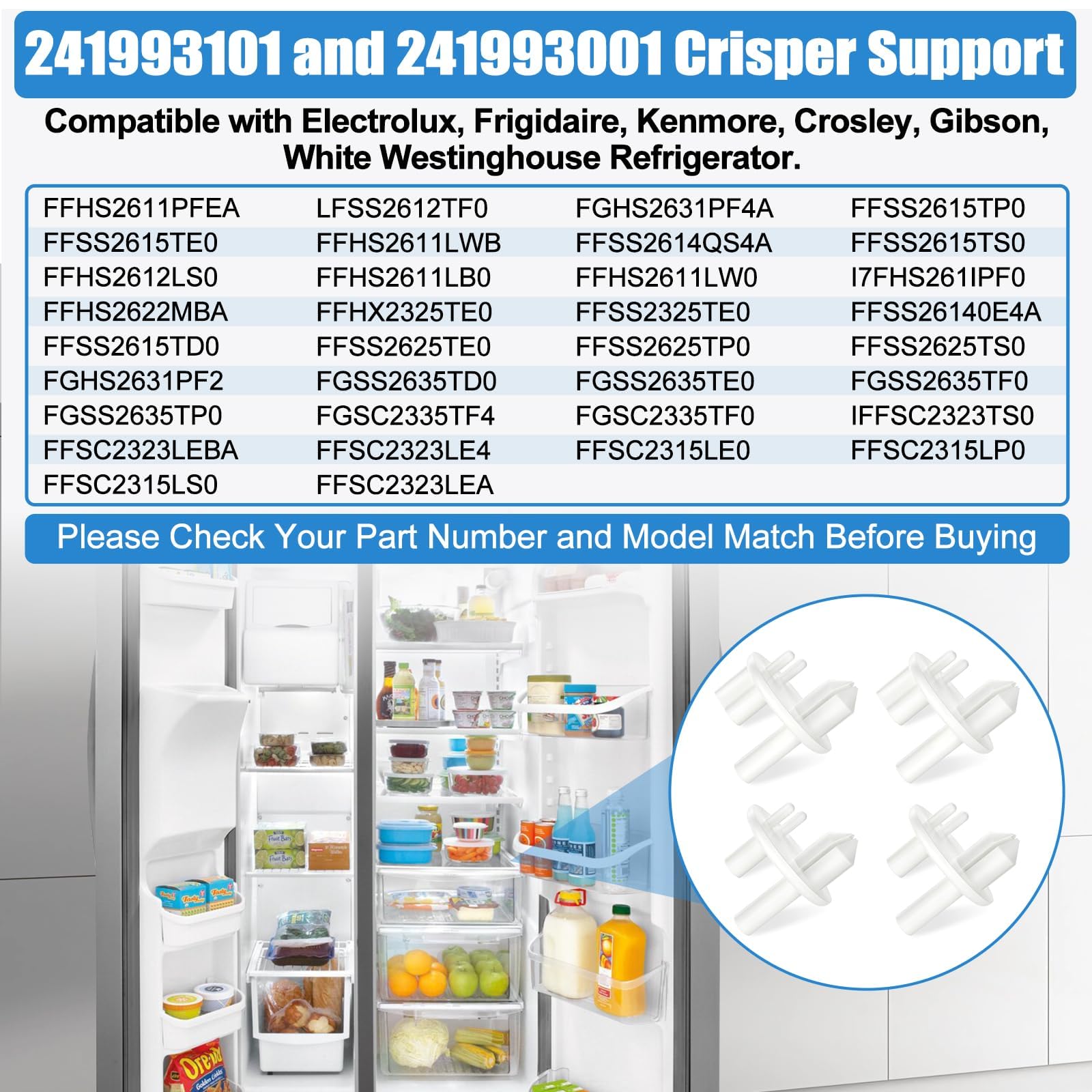 【Refrigerator Crisper Supports-Versatile Compatibility】241993101 and 241993001 frigidaire crisper cover support designed to work with Electrolux, Frigidaire, Kenmore, Crosley, Gibson, White Westinghouse fridge shelf replacement models: FFHS2611PFEA, LFSS2612TF0, FGHS2631PF4A, FFSS2615TP0, FFSS2615TE0, FFHS2611LWB, FFSS2614QS4A, FFSS2615TS0, FFHS2612LS0, FFHS2611LB0, FFHS2611LW0, FFHS2611PF0, FFHS2622MBA, FFHX2325TE0, FFSS2325TE0, FFSS2614QE4A, FFSS2615TD0, FFSS2625TE0, FFSS2625TP0, FFSS2625TS0, FGHS2631PF2, FGSS2635TD0, FGSS2635TE0, FGSS2635TF0, FGSS2635TP0, FGSC2335TF4, FGSC2335TF0, FFSC2323TS0, FFSC2323LEBA, FFSC2323LE4, FFSC2315LE0, FFSC2315LP0, FFSC2315LS0, FFSC2323LEA door shelf etc