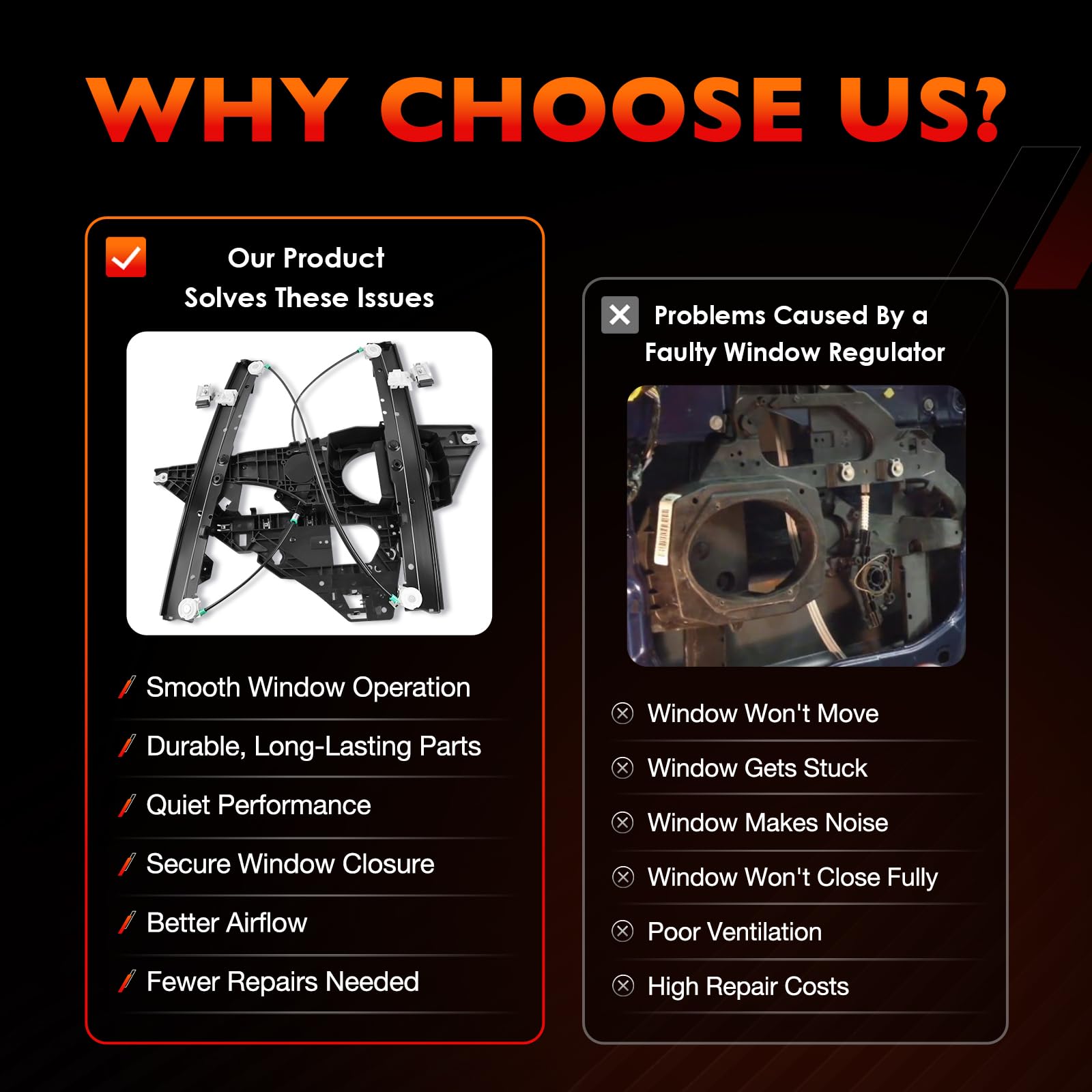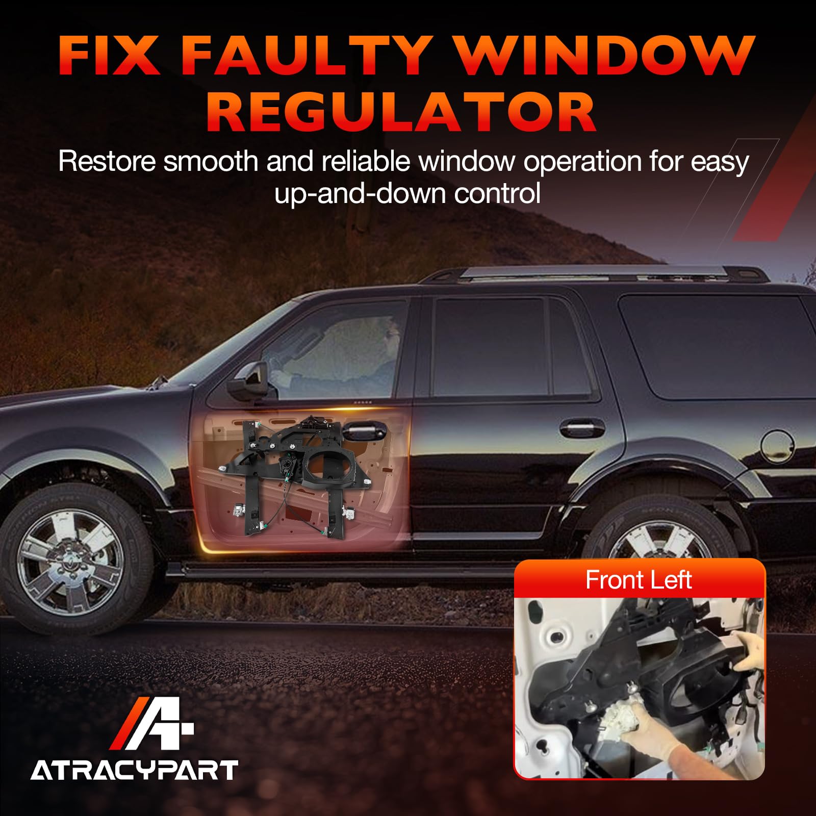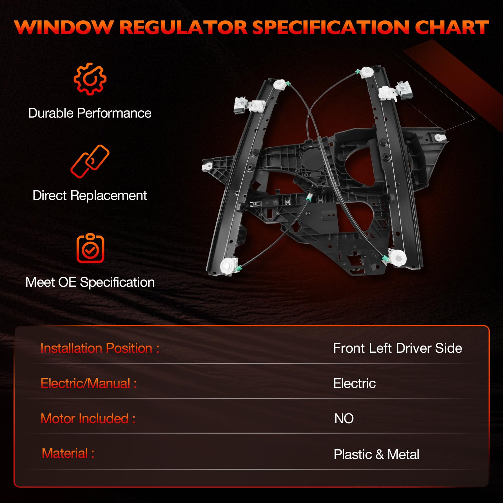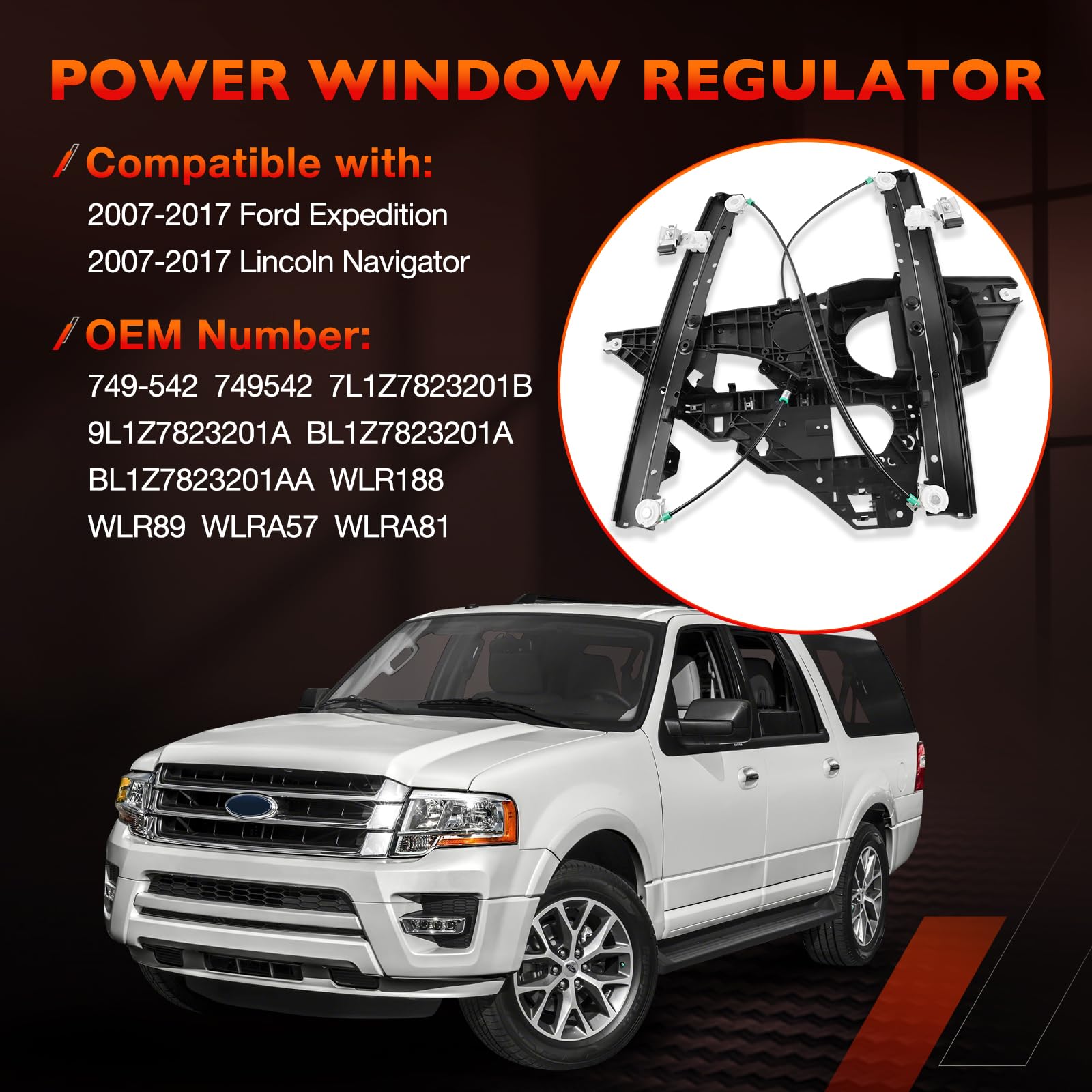 Why Choose Us Tired of a stuck, noisy, or falling car window? Our power window regulator assembly is the perfect solution. Designed as a direct window regulator replacement, it restores smooth window operation, ensures long-lasting durability, and saves you from costly repair shop visits. With precise fitment and premium construction, our front left driver side window regulator with panel without motor delivers the reliable performance you need. Key Features & Advantages Restore Smooth Window Operation: This electric window regulator with panel is built to fix common issues such as glass not moving, slow response, or windows dropping unexpectedly. By replacing your old unit with our front driver window regulator, you can restore factory-like performance and enjoy quiet, stable window movement. Quiet & Stable Performance: Our driver side window regulator assembly without motor keeps your glass aligned and eliminates rattling, grinding, or shaking. The strong support structure ensures your left side power window regulator operates smoothly without unwanted noise. Durable Construction: Crafted with high-strength steel and premium components, this window regulator with metal panel offers enhanced wear resistance and long service life. Built to handle repeated use without bending or failing, it provides lasting dependability for your vehicle. Compatible Vehicle Applications Compatible with Ford Expedition 2007–2017 Sport Utility Compatible with Lincoln Navigator 2007–2017 Sport Utility Replace OEM Part Numbers 749-542, 7L1Z7823201B, 9L1Z7823201A, BL1Z7823201A, BL1Z7823201AA Quality Guarantee: 12-Month Warranty