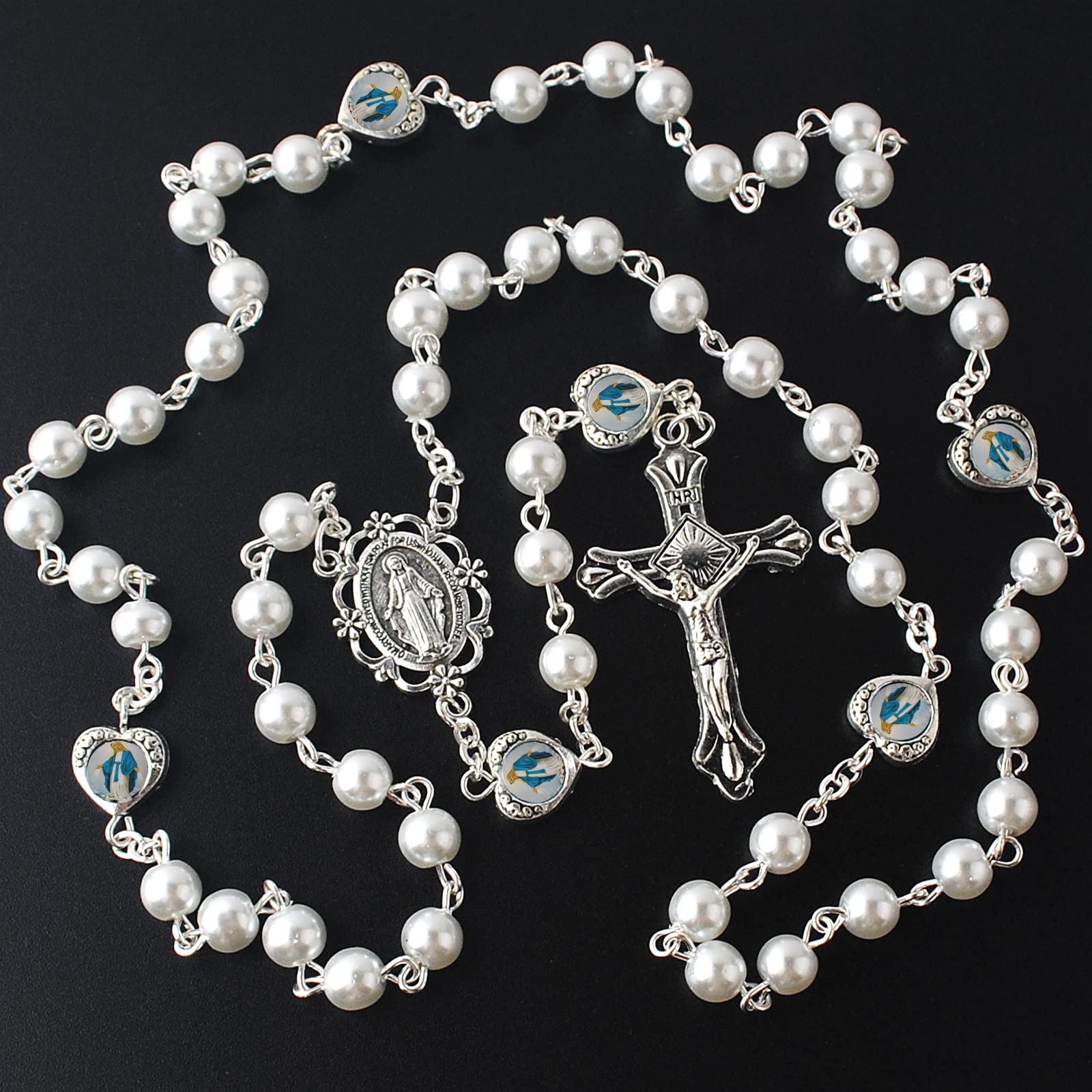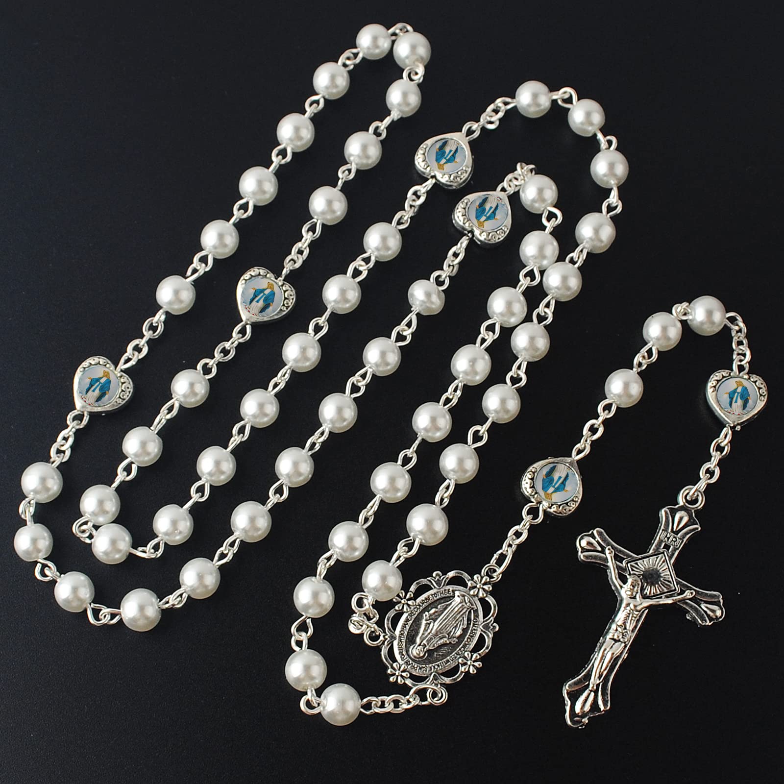 The Glass Pearl Beads Rosary Necklace, the rosary Hail Mary beads is 6mm glass pearl beads, the Our Father beads is 8mm Zinc Alloy Metal Heart Beads with double side Virgin Mary Epoxy Image in Anti-Silver plated, this 2 kind of beads match make this rosary looks very beautiful and easy to praying. this item is not intended for users under 12 year old.