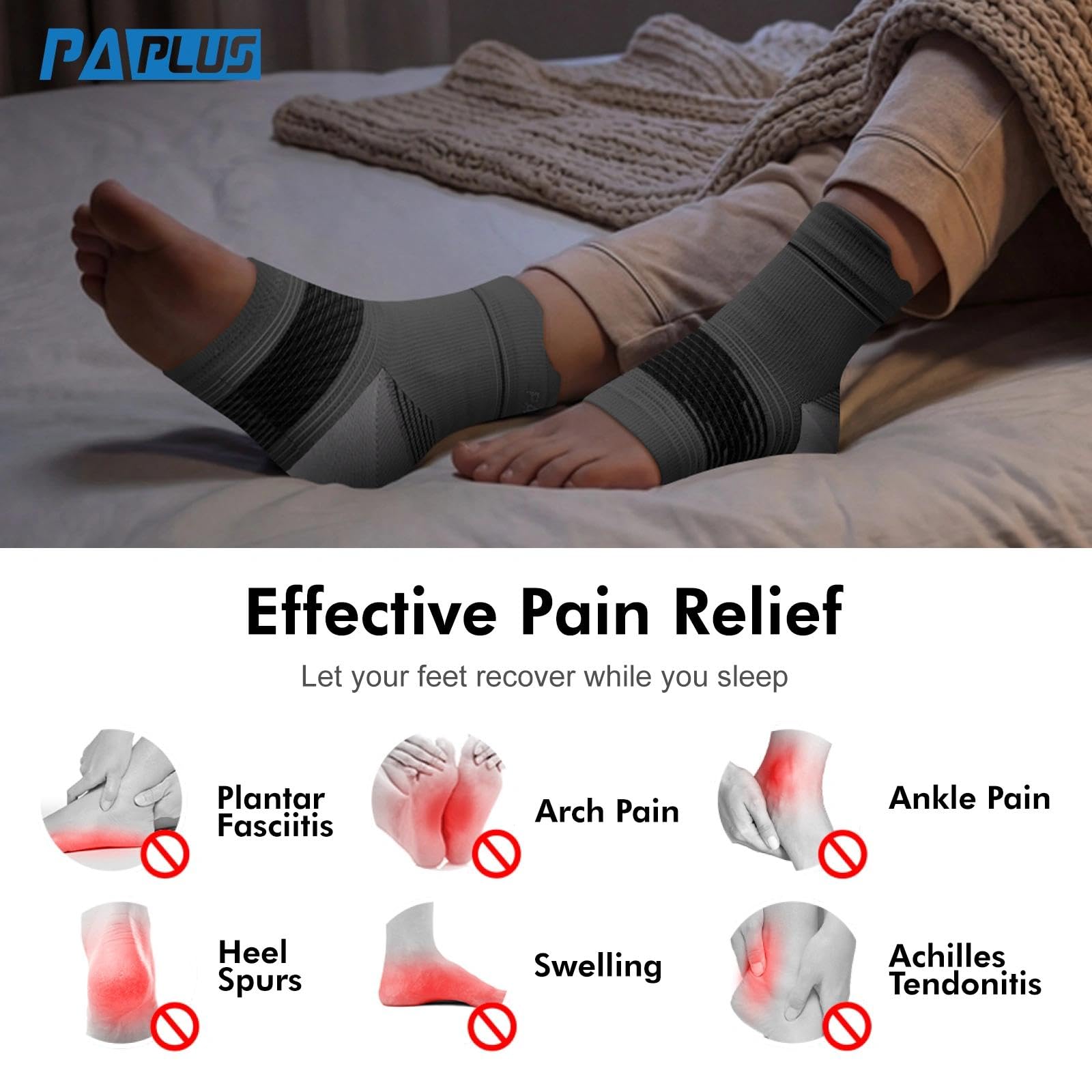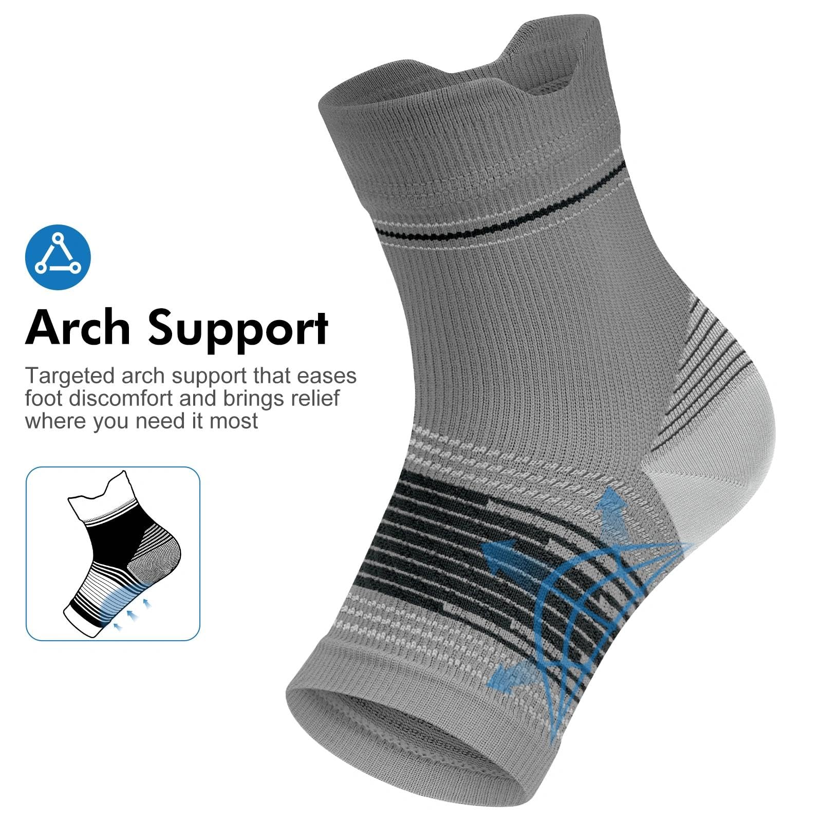 FAST PAIN RELIEF:Our compression foot sleeves helps relieve foot pain by stretching tendons and relieving pressure on the plantar fascia. Including relief of plantar fasciitis, arch pain, and heel pain. They can also improve foot circulation, stabilize ankle joint, aid in recovery from edema and heel spurs, and helps stabilize feet and prevent injuries.