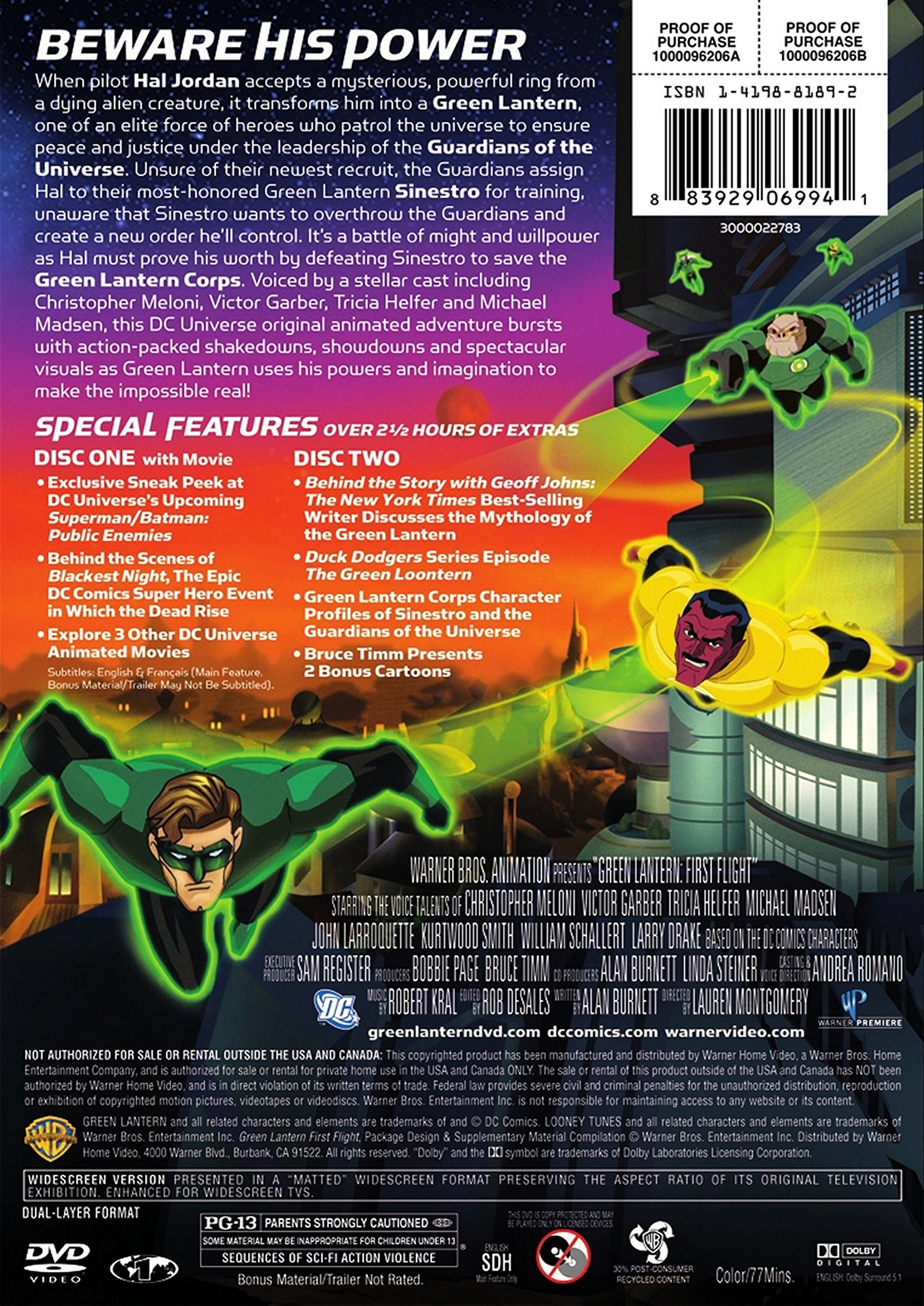 Amazon.com Green Lantern: First Flight is an animated and lively origin story about the transformation of test pilot Hal Jordan into a member of an intergalactic society watching over the universe. Flying an experimental jet one day, Jordan (voiced by Law and Order: Special Victims Unit's Christopher Meloni) encounters a dying alien who is a Green Lantern protector of Earth's sector of the cosmos. The alien's ring, a repository of enormous power granted by a council of elders called the Guardians, zips onto Jordan's finger, but neither the Guardians nor other Green Lanterns are ready to accept him as an unproven member. Complicating things for Jordan is the fact that the Green Lantern tasked with mentoring him, Sinestro (Victor Garber), is plotting the destruction of the Guardians with the acquisition of "yellow power," the only force that makes the Lanterns' green power useless. Jordan's resilience and willingness to throw himself in harm's way for the good of everyone gain respect, but his inevitable showdown with Sinestro is an epic fight. This PG-13 feature is a bit bloody, and there are a few swear words, but most of the violence arises from that familiar, shape-shifting light emanating from Jordan's ring. Happily, there is some of the old DC Comics wit in the way his Green Lantern ring shapes its beam into such imaginative weapons as a golf club and a flyswatter. A second DVD packed with special features includes background on Sinestro, a Justice League short, a featurette on the making of Green Lantern: First Flight, and, best of all, "Duck Dodgers: The Green Loontern." --Tom Keogh Product Description When Hal Jordan first becomes a Green Lantern, he is put under the supervision of senior Lantern, Sinestro, only to discover that his so-called mentor is part of a secret conspiracy that threatens the entire Green Lantern Corps.