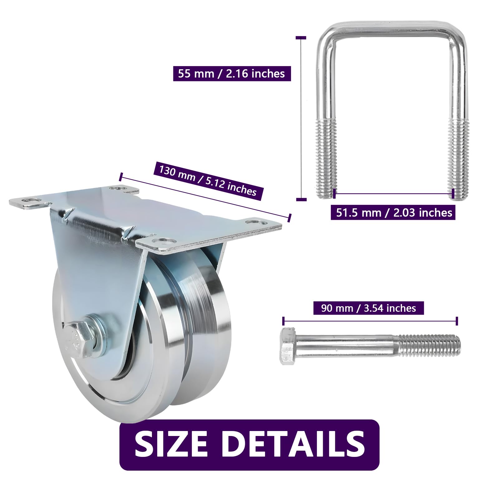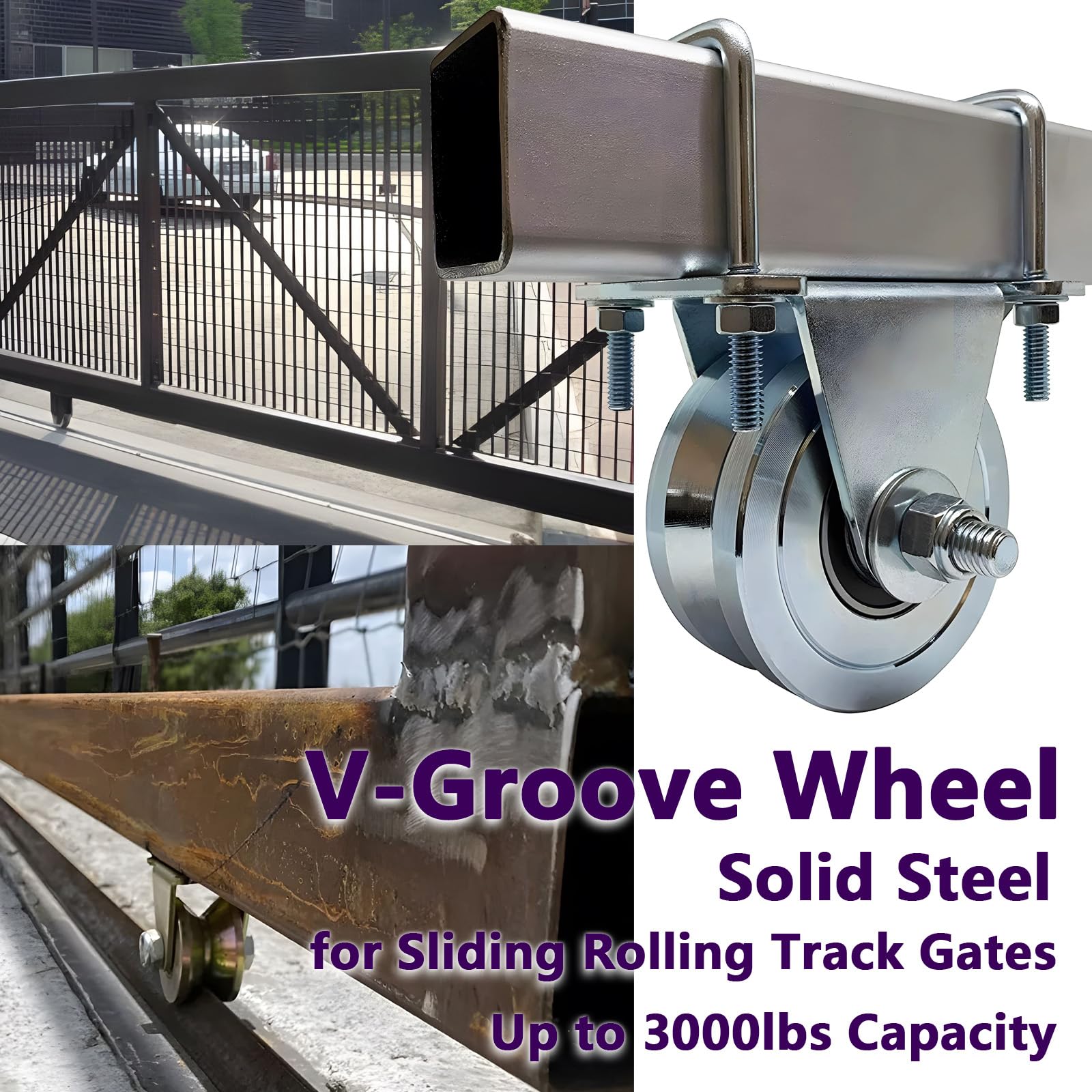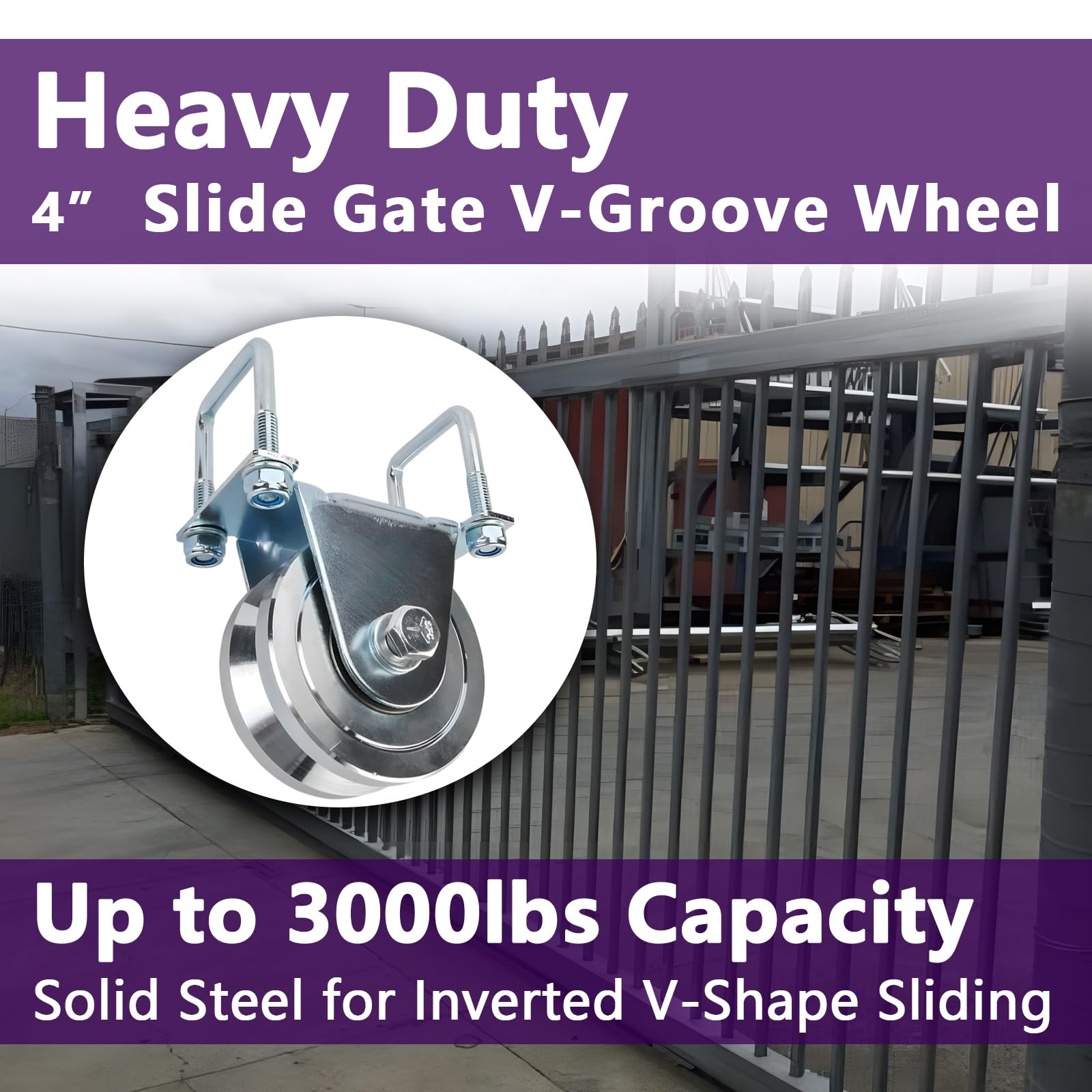 "Specifications: Wheel Diameter: 4"" (102mm) Wheel Thickness: 1-13/16"" (46mm) Axle Bolt: 1/2"" (13mm) Weight: 6.93 lbs. (3.15 kgs) Max. Gate Weight Capacity: 3000 lbs. Engineered for smooth and reliable slide gate operation, the 4"" V-Groove Solid Steel Gate Wheel with an external U-bolt mount bracket cradle is a versatile and sturdy solution. Its external mount bracket cradle allows for adaptable installation, permitting direct bolting or welding onto the gate. Crafted from premium materials, this wheel is built to withstand heavy gate loads of up to 3000 lbs and frequent usage, making it perfect for gates facing lateral forces or uneven terrain. Balancing strength and maneuverability, the 4-inch diameter wheel is easy to install and maintain while offering substantial load-bearing capacity. Its smooth rolling action minimizes friction and strain on the gate operator, ensuring quiet operation with minimal noise disturbance. Galvanized for corrosion resistance, this wheel is suitable for various applications, including residential, commercial, estate, industrial, ornamental iron, and access-controlled gates. Overall, the 4"" V-Groove Solid Steel Gate Wheel combines durability, ease of use, and smooth performance to enhance the functionality of your sliding gate system, promising years of trouble-free operation."