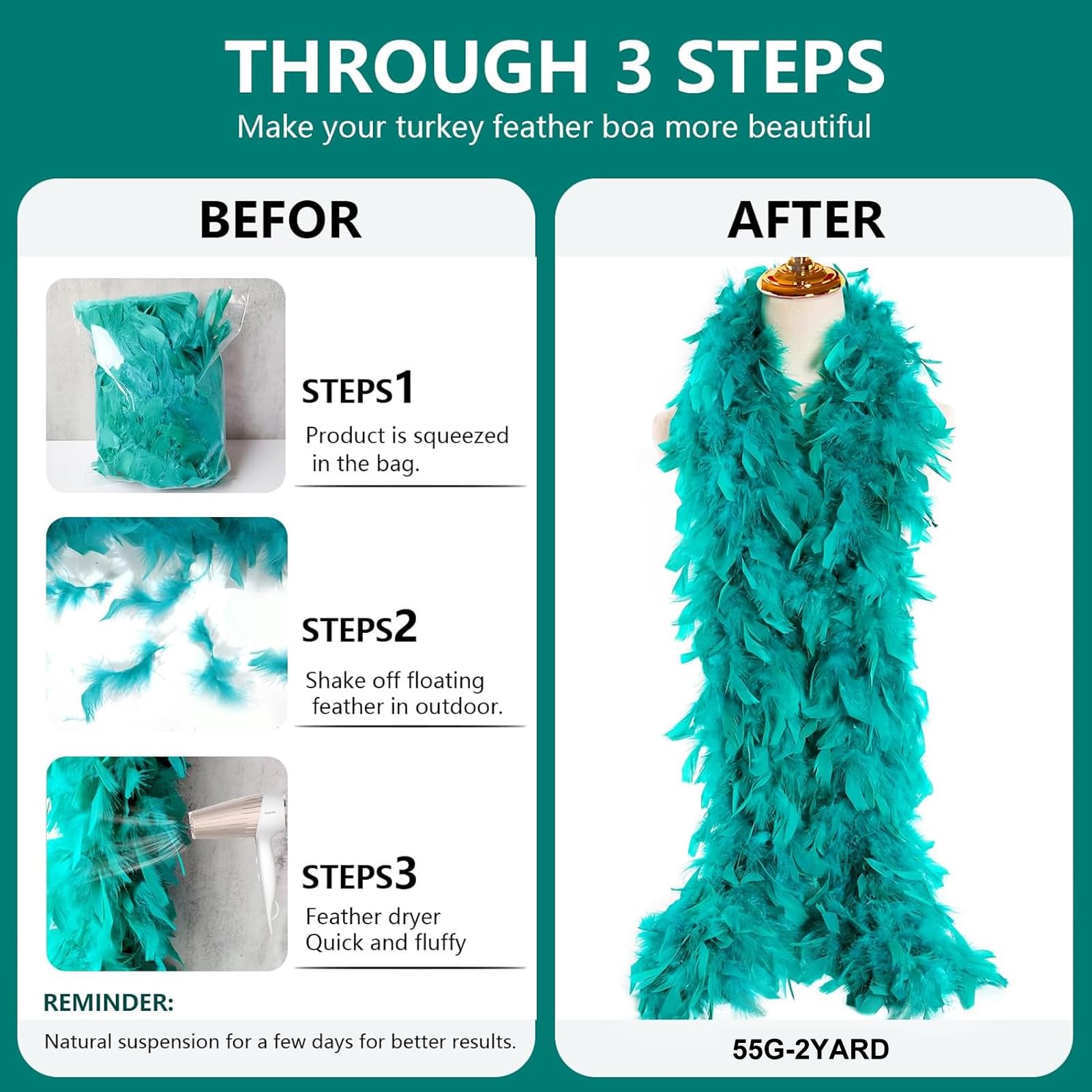 ❤️Precautions before use:Since our feathers are all natural and handcrafted,After you receive the boas, take them out of the package and shake them outdoor first, in order to get rid of debris and fallen feathers.Then hang it up for few hours before wearing. If you can hang up blowed few days, it will looks as the picture full and big.Of course,the longer you hang them up, the turkey feather boa will be more fluffy and the effect will be more stunning.